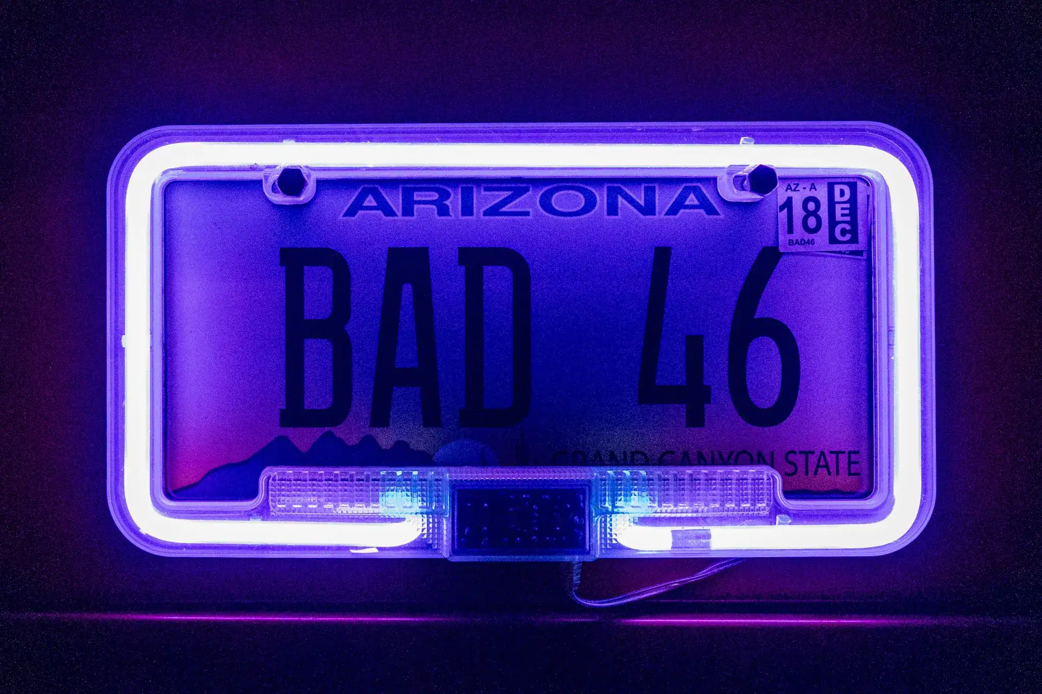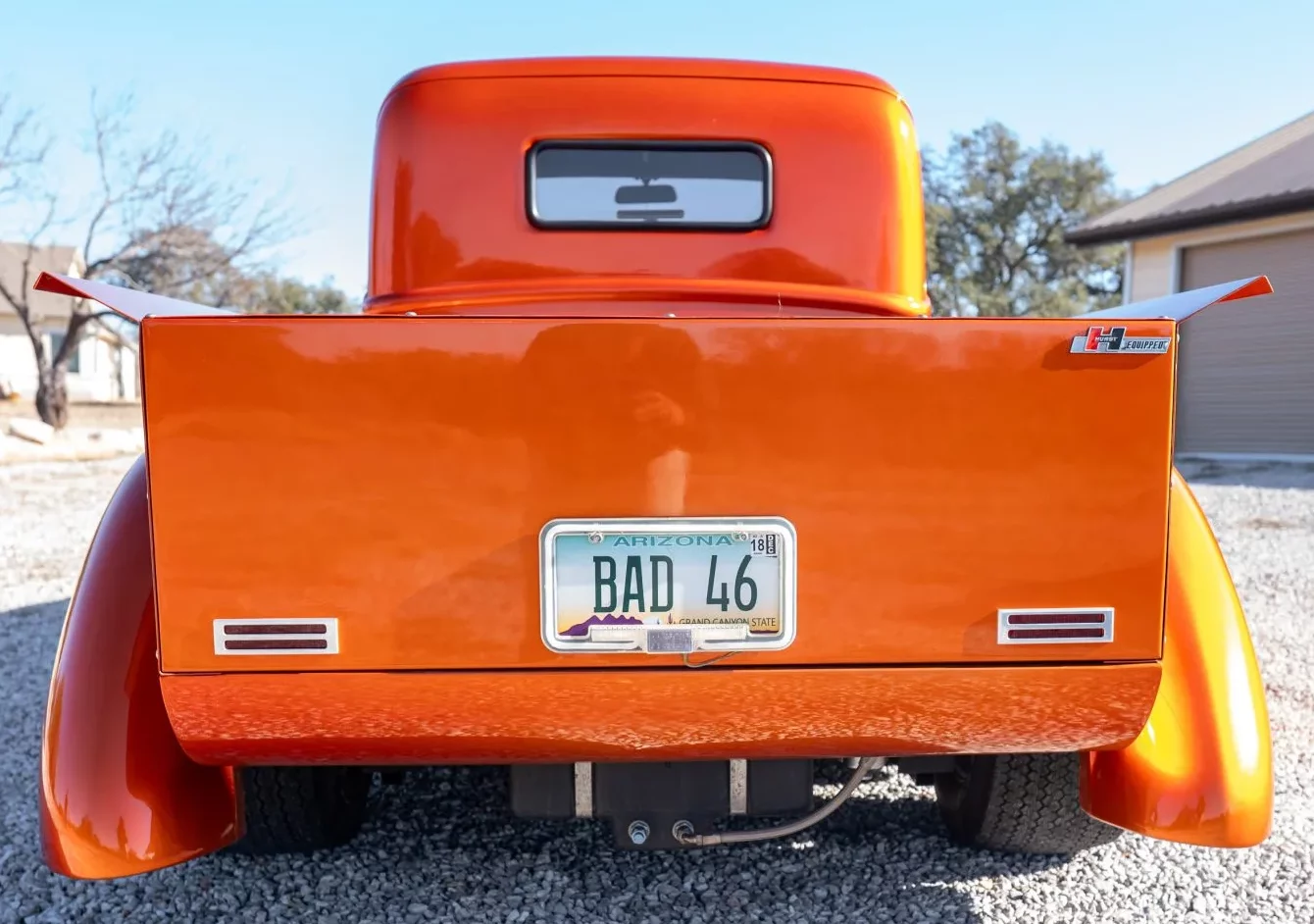 La puissance est transmise aux roues arrière par une boîte de vitesses manuelle à quatre rapports avec un carter d’embrayage Lakewood et un embrayage Ram. Des collecteurs d’échappement traités alimentent un système d’échappement double, et des feux violets sous la carrosserie. Le titre de propriété de l’Arizona indique le numéro VIN AZ317525 et décrit le véhicule comme un Ford Special Construction de 1946.
