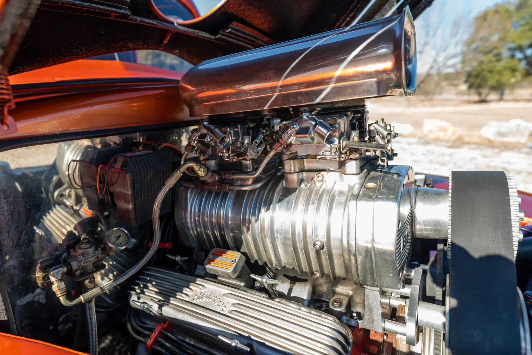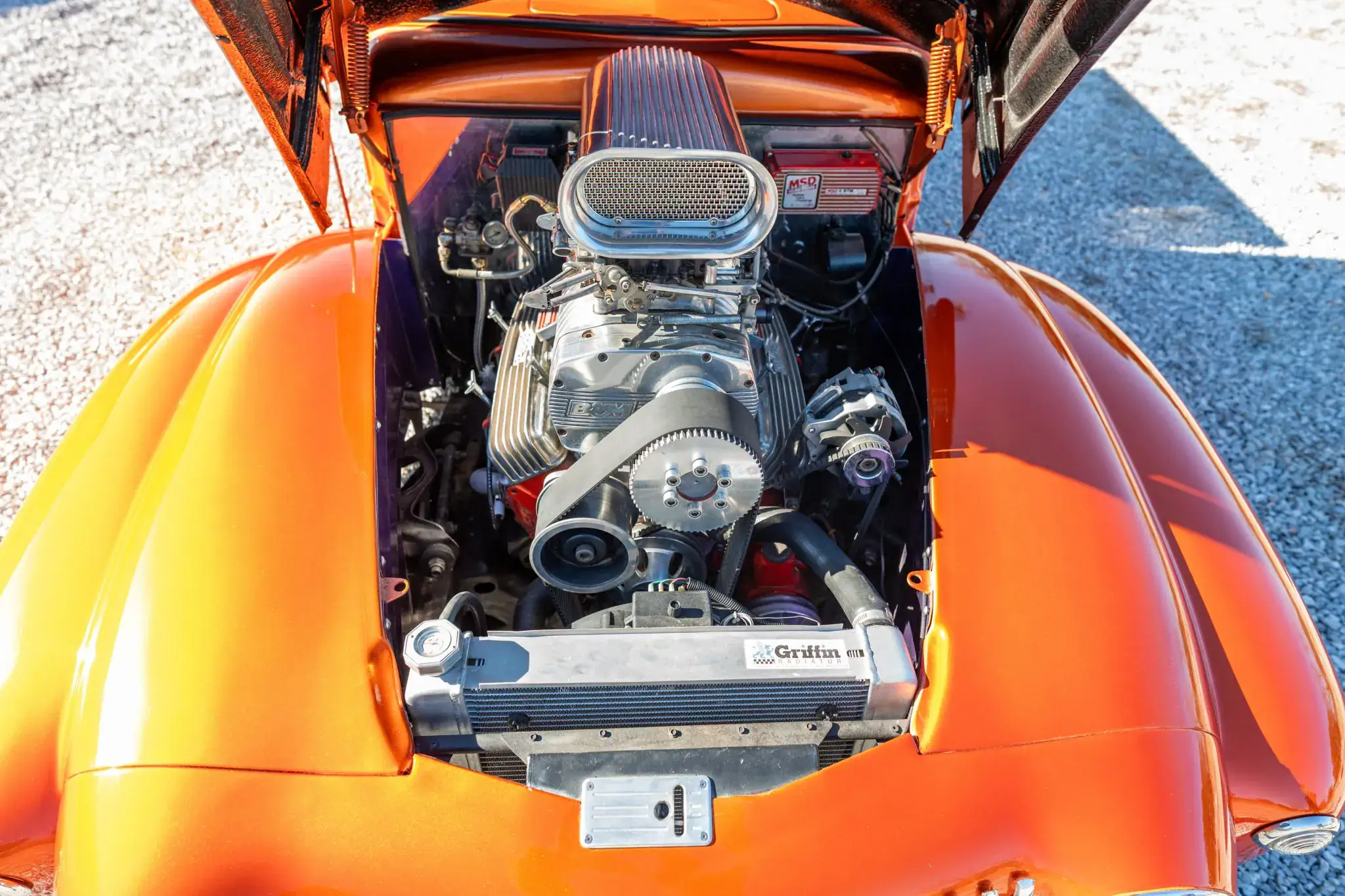 Il est équipé d’une boîte de vitesses manuelle à quatre rapports, de collecteurs d’échappement traités, de sorties d’échappement latérales, d’un radiateur en aluminium et d’un module d’allumage MSD avec avance automatique réglable en fonction de la pression de suralimentation. La carrosserie, avec son capot et ses ailes en fibre de verre, a été peinte en orange métallisé avant d’être montée sur un châssis rectangulaire sur mesure.