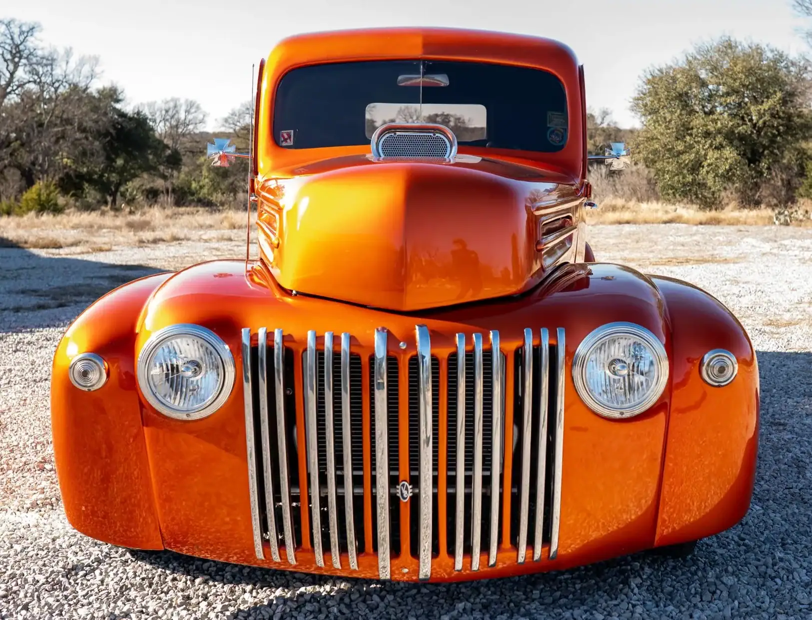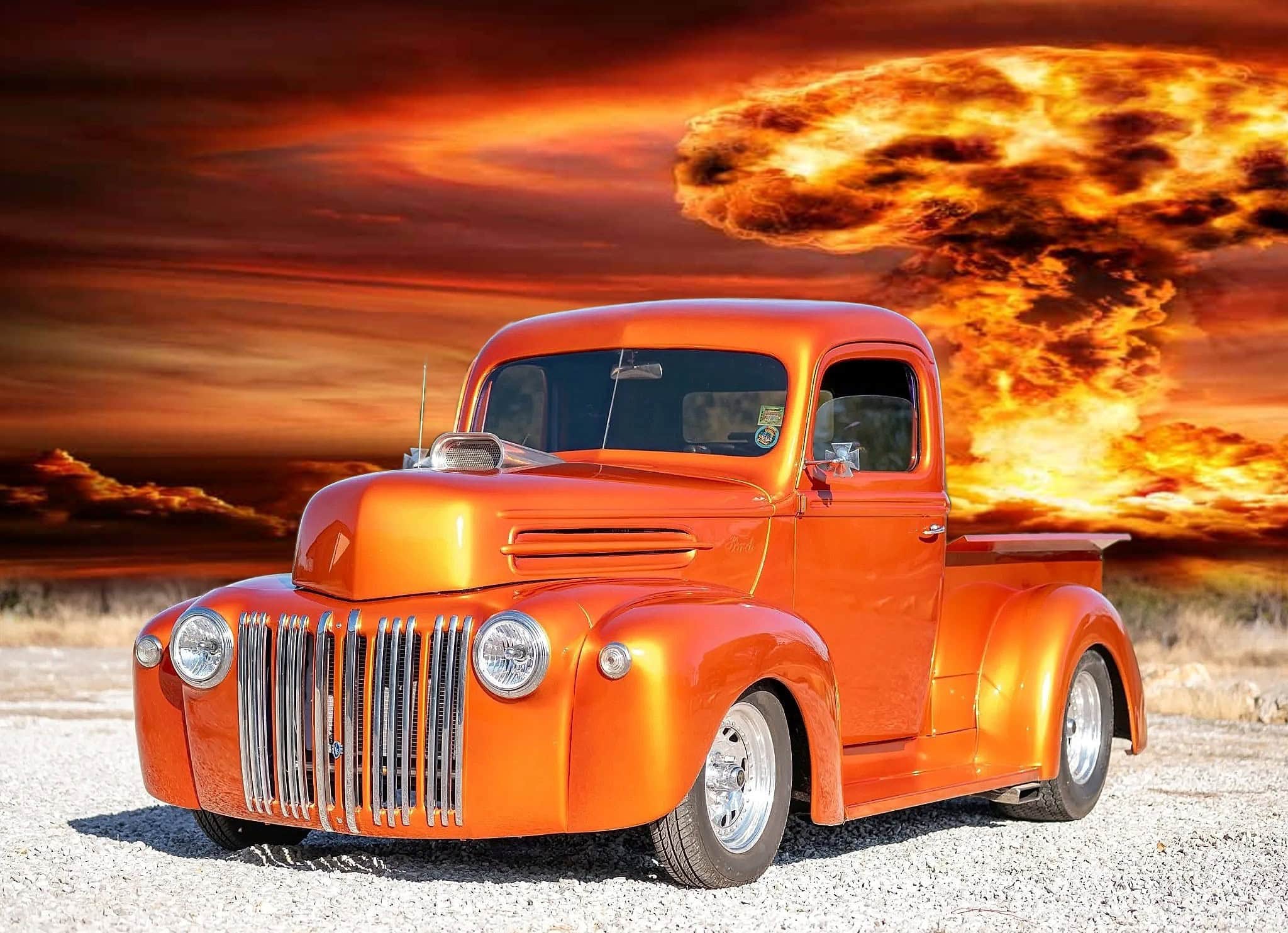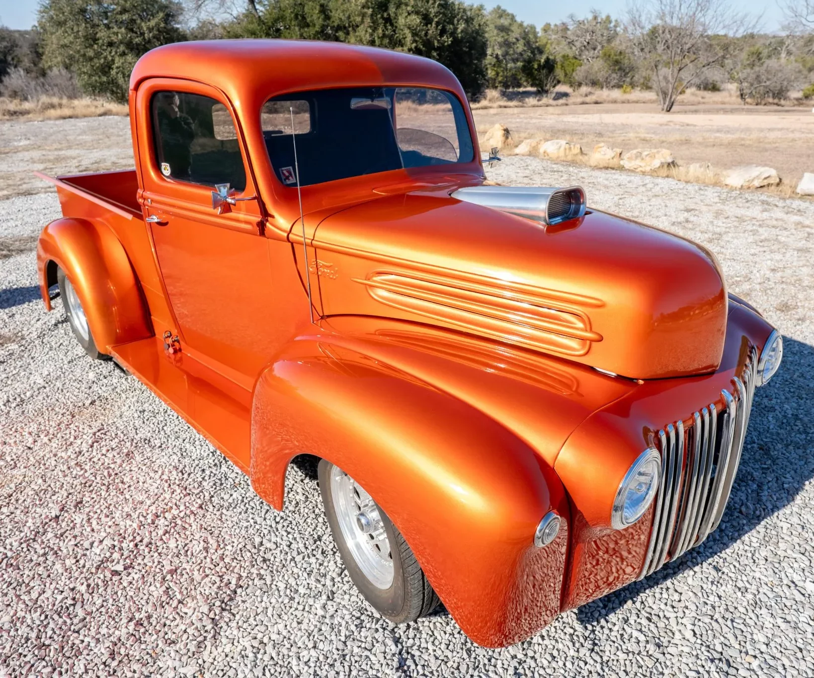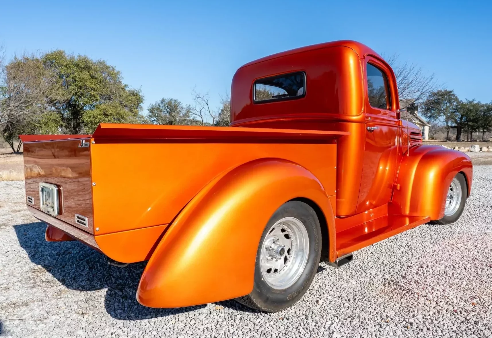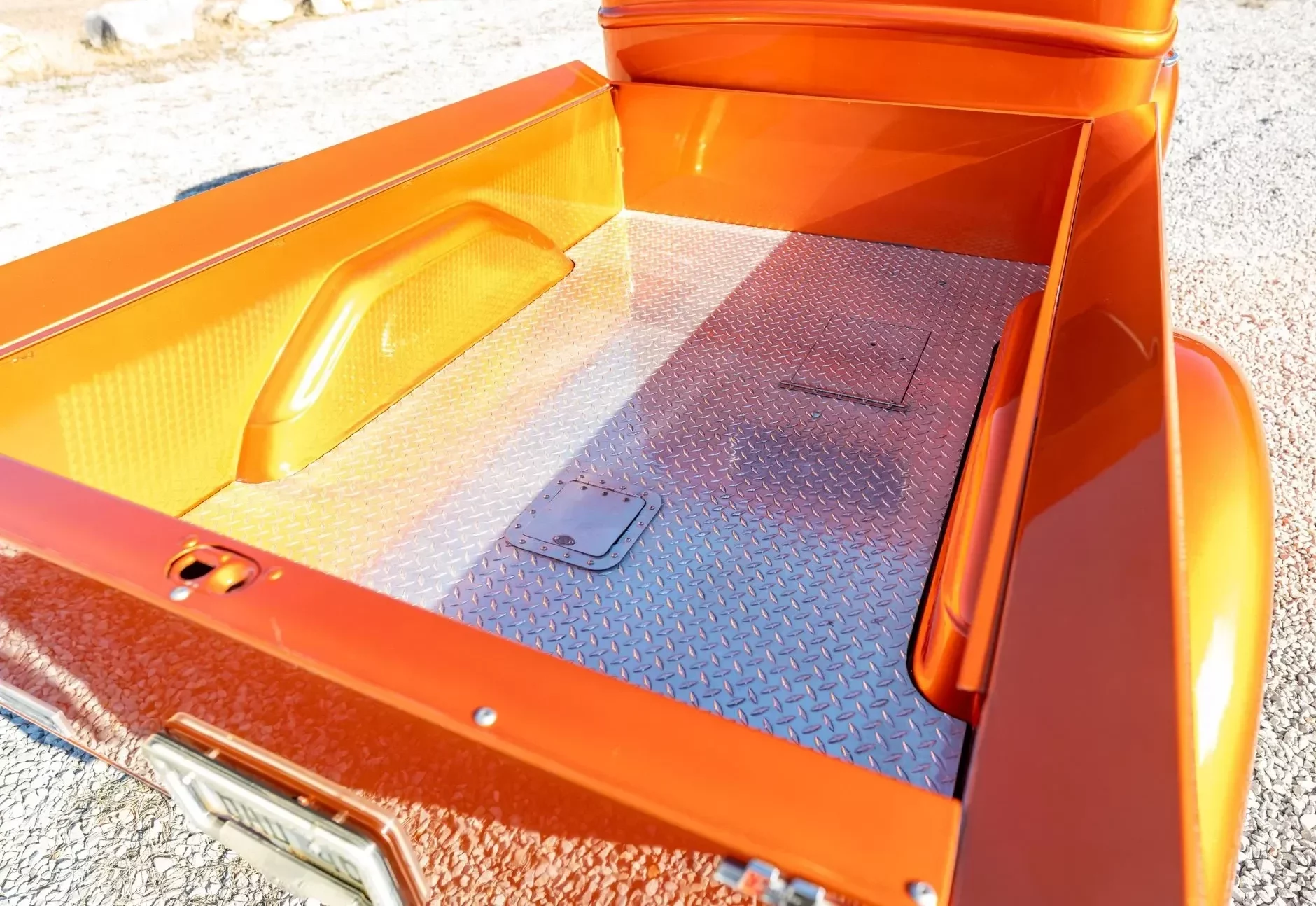 S’y trouve également une colonne de direction inclinable, d’un autoradio DVD, d’une chaîne stéréo CD Pioneer et de manomètres AutoMeter. Ce pick-up Ford modifié circule au Texas avec une carte grise de l’Arizona. La carrosserie arbore une teinte orange métallisée et est dotée d’une benne en acier réalisée sur mesure, ainsi que d’un capot et d’ailes en fibre de verre.