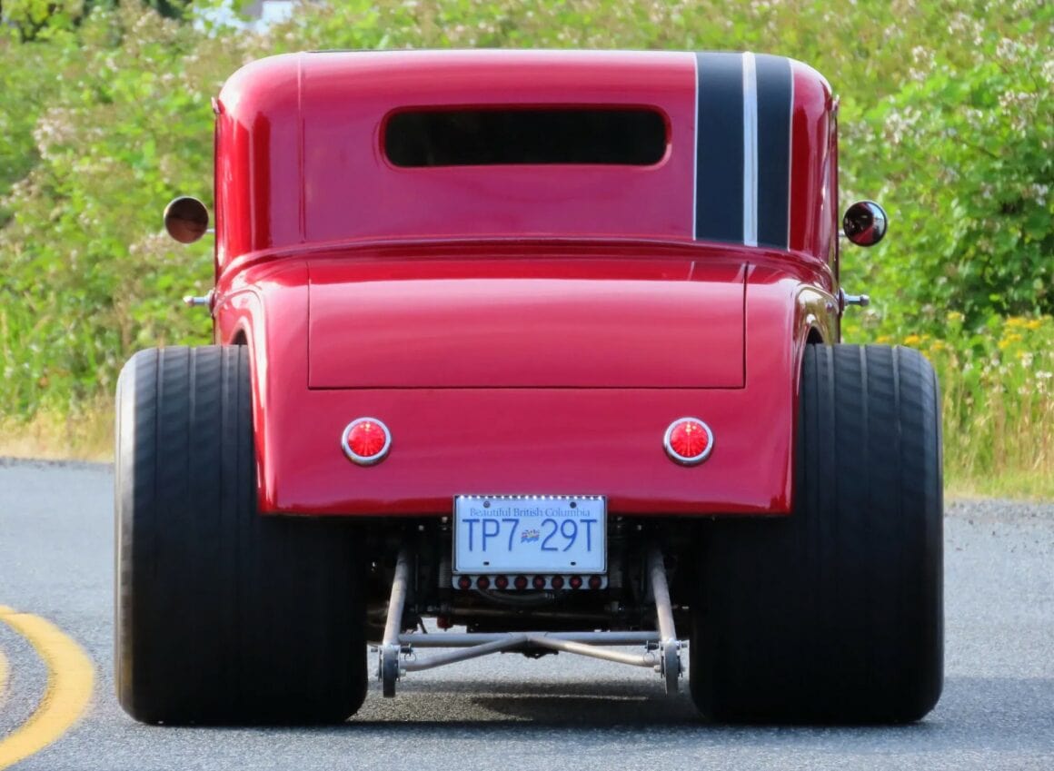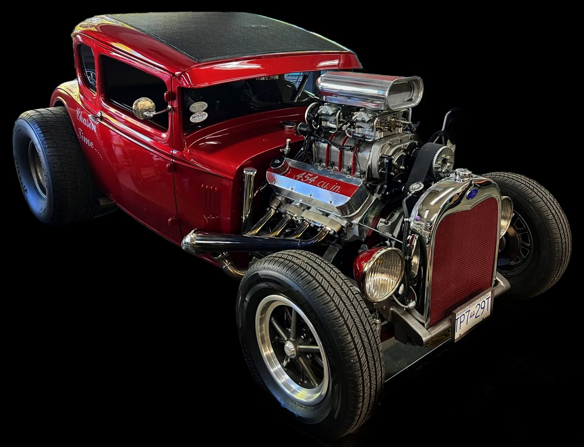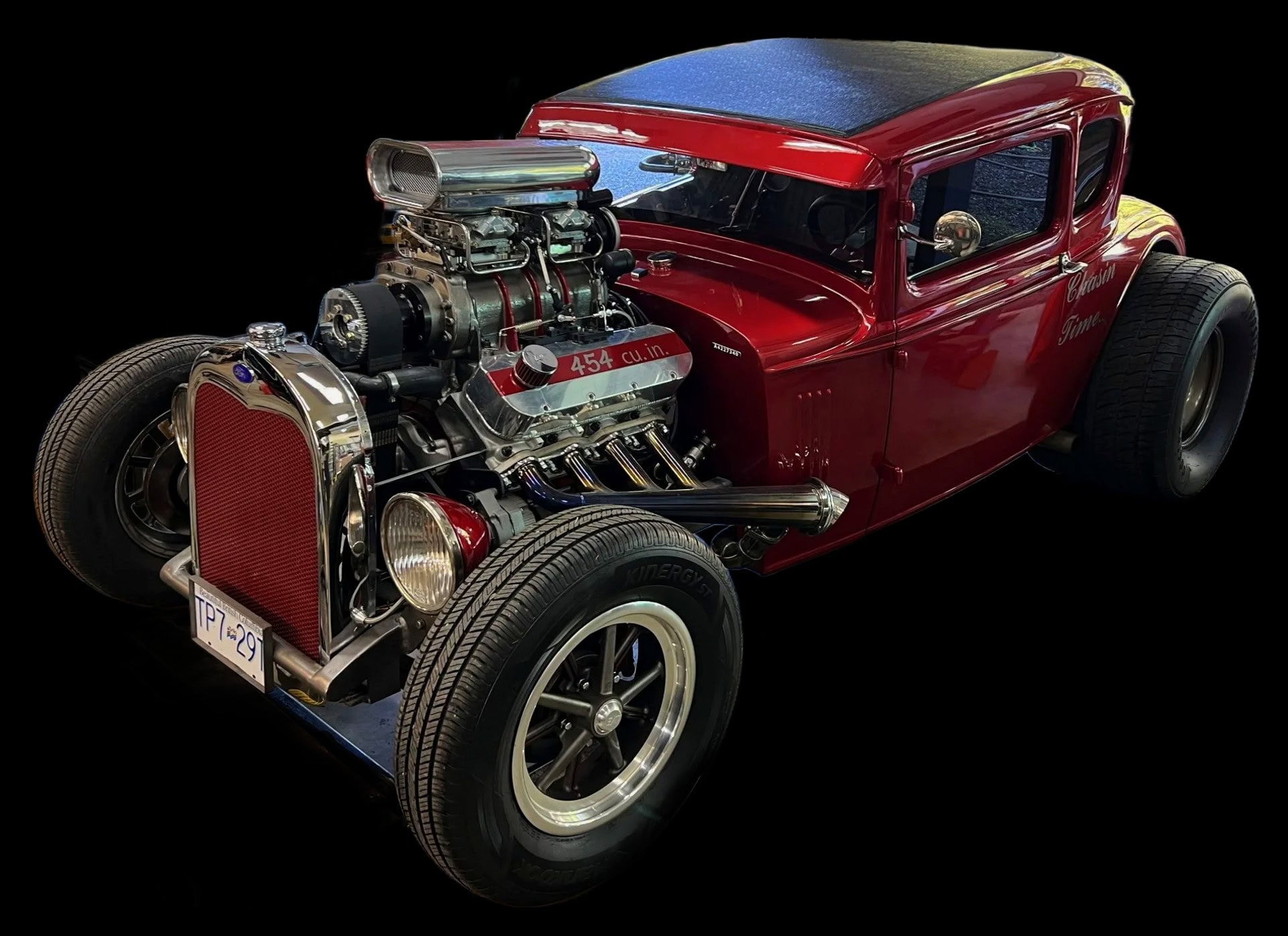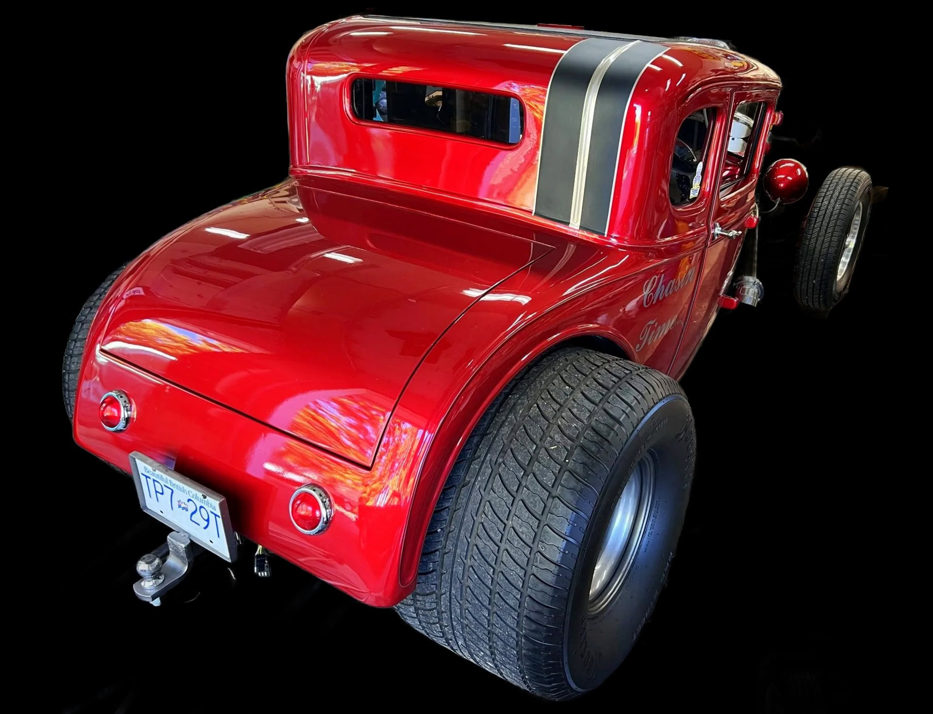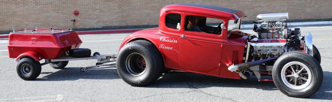 Une remorque utilitaire a été créée en correspondance au style et à la couleur du Hot Rod et abrite un réservoir de carburant auxiliaire. Cette voiture Modèle A a été applaudie par le public dans divers shows et louée par la presse comme étant un passe-temps hautement recommandé dans l’esprit créatif et pionnier du Canada… Car ce Hot Rod est Canadien. Le certificat d’immatriculation étant de Colombie-Britannique.