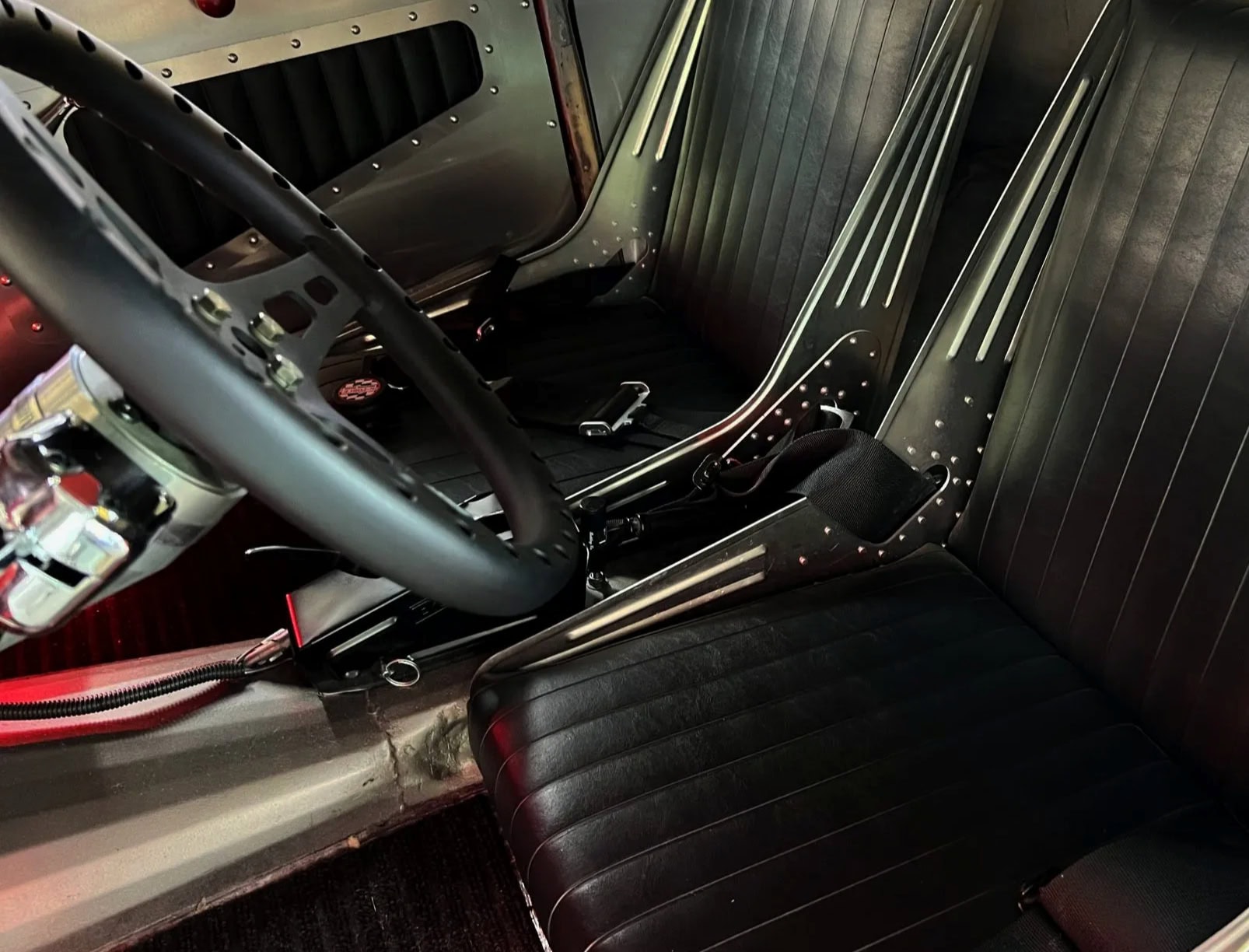 Le tout est couplé à une boîte automatique TH400 à trois vitesses plus overdrive et à un essieu arrière pont/différentiel de 9po. À l’intérieur, des sièges bas à dossier de style “bomber” sont montés de chaque côté d’un tunnel de transmission personnalisé, et des compteurs AutoMeter ont été installés. Des équipements supplémentaires incluent un ventilateur de radiateur électrique et un refroidisseur de transmission auxiliaire.