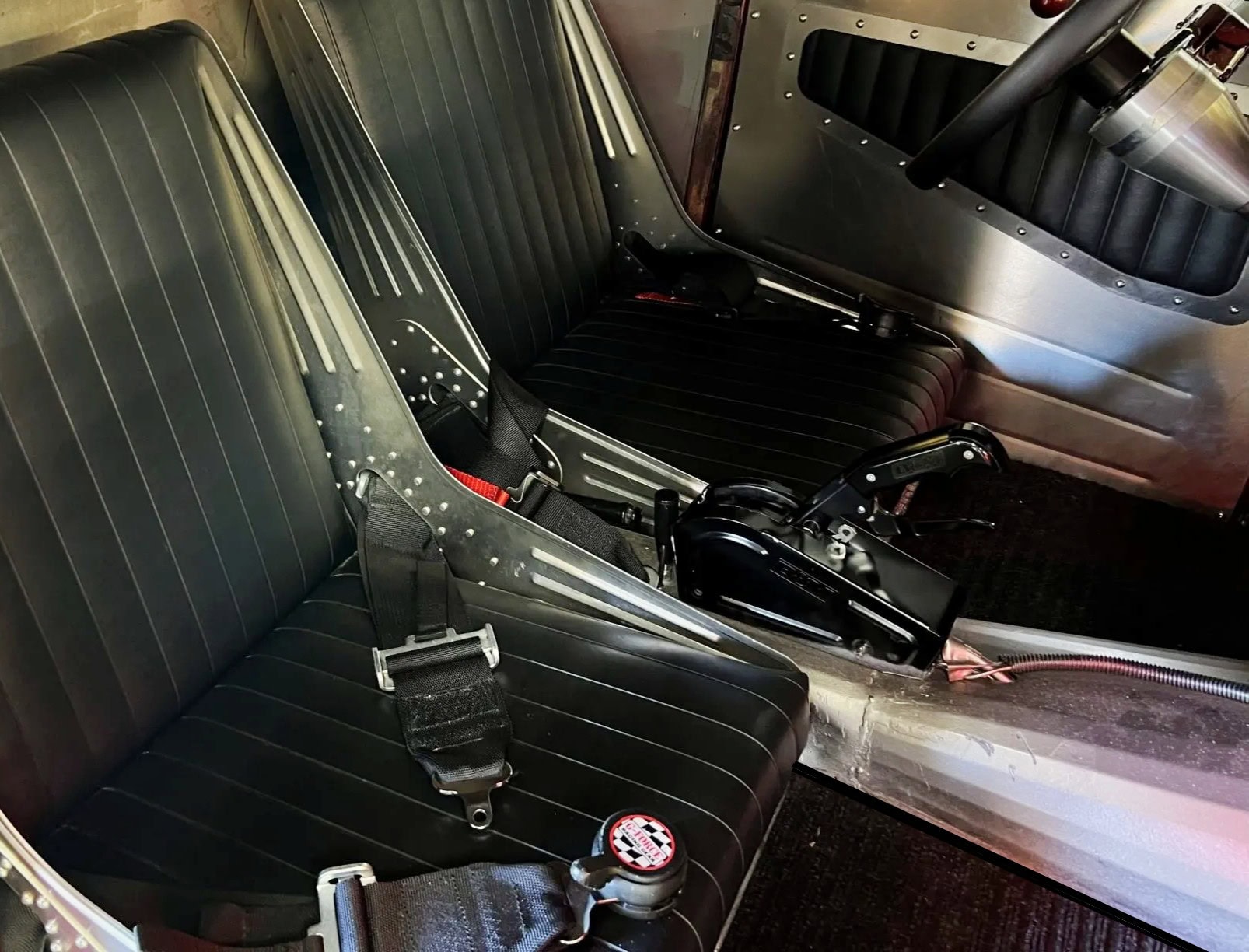 Il y a aussi des collecteurs de style “Lakester”, des tuyaux d’échappement latéraux avec silencieux MagnaFlow, des barres d’échelle arrière ainsi qu’une suspension avant à quatre barres, un ensemble arrière à quatre bras avec coilovers réglables, ainsi que des jantes E/T chaussées de pneus Hankook Kinergy ST 205/75 AV et Hoosier Pro Street Radial de 33×21,5 AR, toutes équipées de freins à disques.