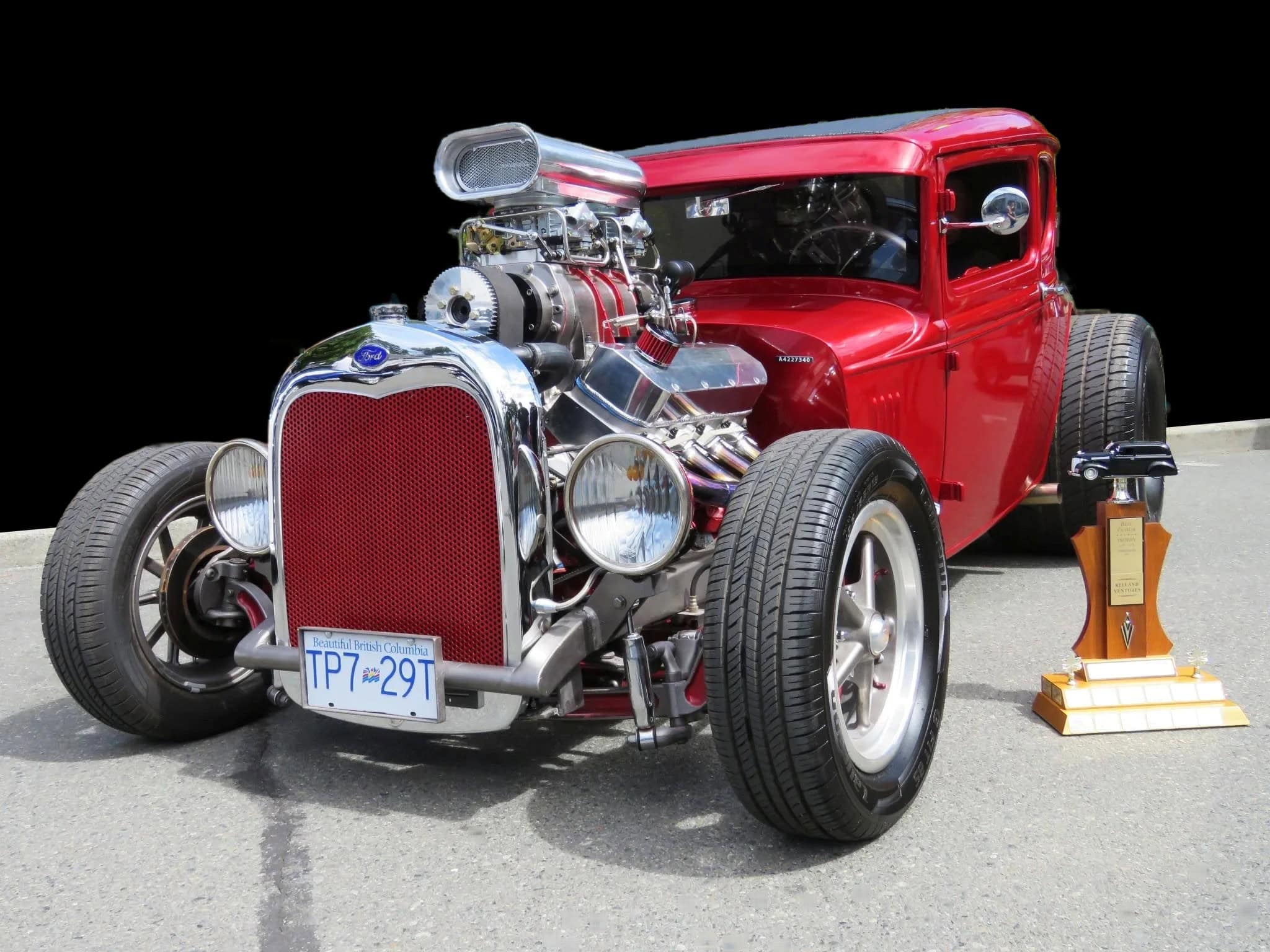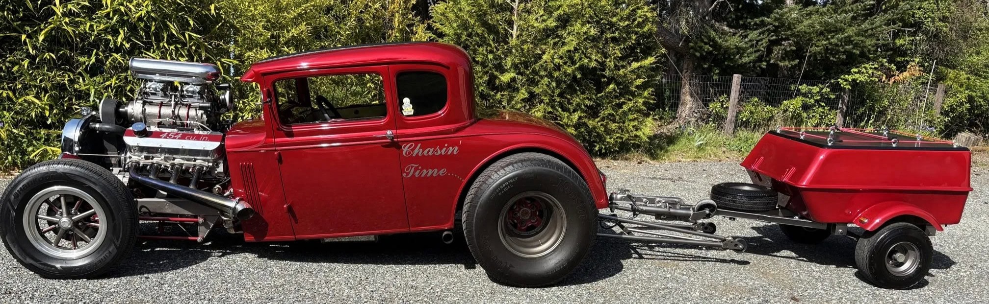 Une remorque utilitaire a été créée en correspondance au style et à la couleur du Hot Rod et abrite un réservoir de carburant auxiliaire. Cette voiture Modèle A a été applaudie par le public dans divers shows et louée par la presse comme étant un passe-temps hautement recommandé dans l’esprit créatif et pionnier du Canada… Car ce Hot Rod est Canadien. Le certificat d’immatriculation étant de Colombie-Britannique.