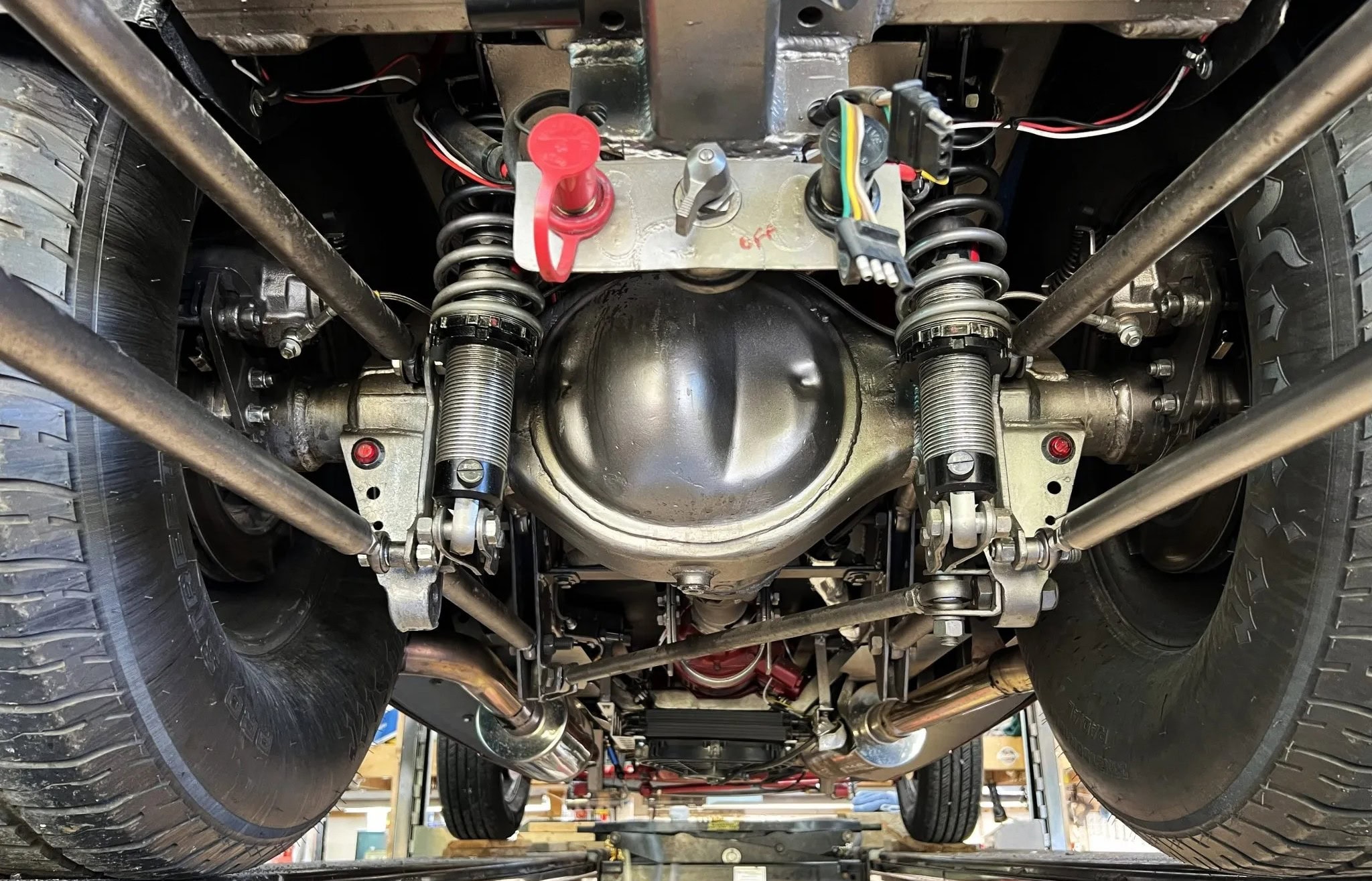 Il y a aussi des collecteurs de style “Lakester”, des tuyaux d’échappement latéraux avec silencieux MagnaFlow, des barres d’échelle arrière ainsi qu’une suspension avant à quatre barres, un ensemble arrière à quatre bras avec coilovers réglables, ainsi que des jantes E/T chaussées de pneus Hankook Kinergy ST 205/75 AV et Hoosier Pro Street Radial de 33×21,5 AR, toutes équipées de freins à disques.