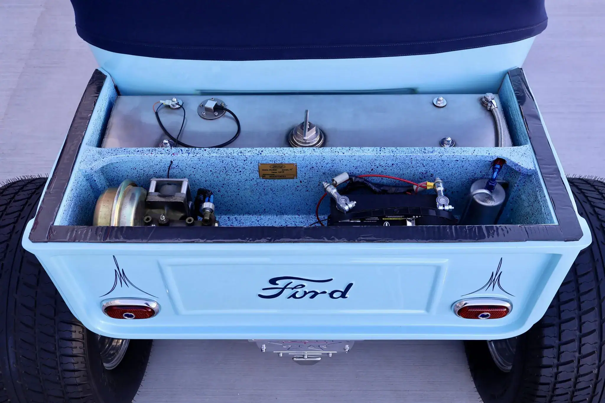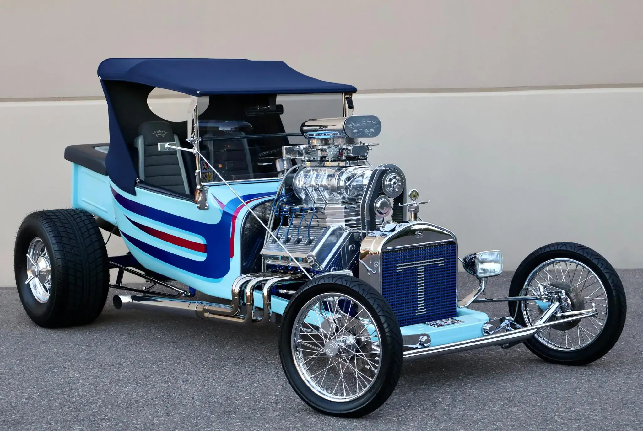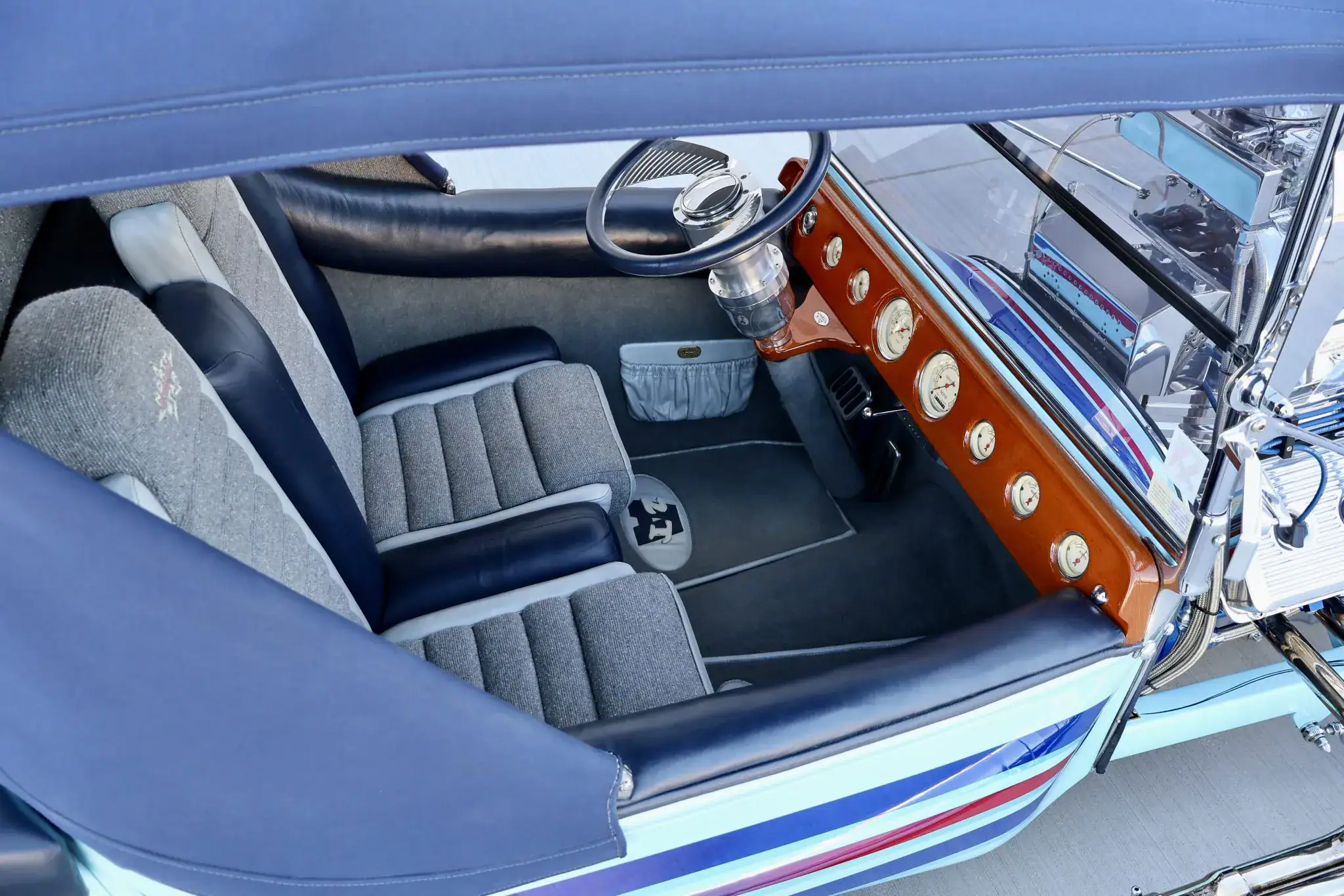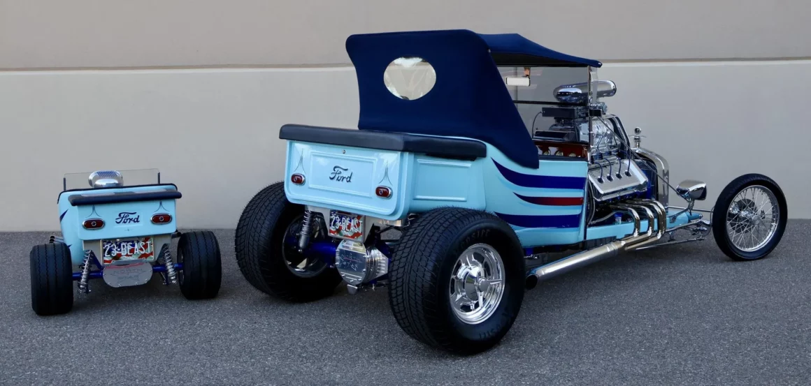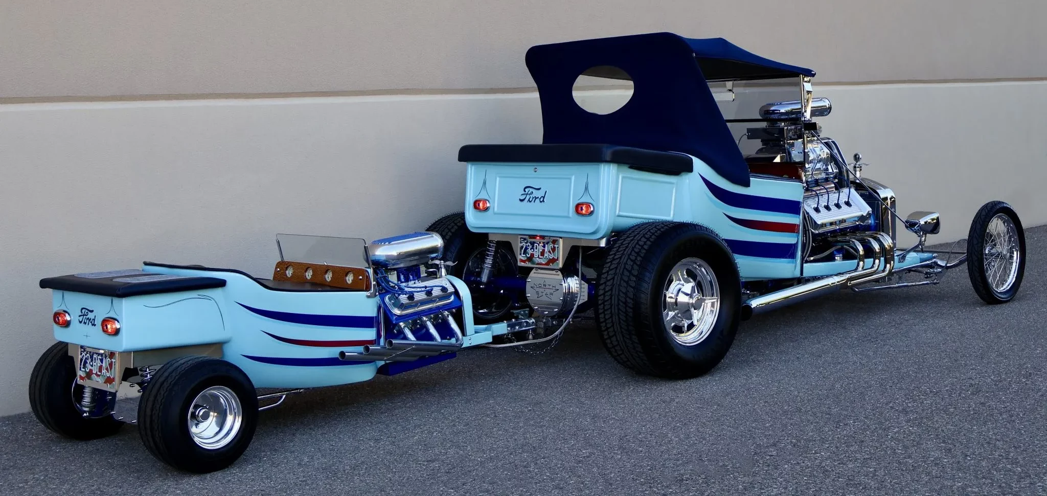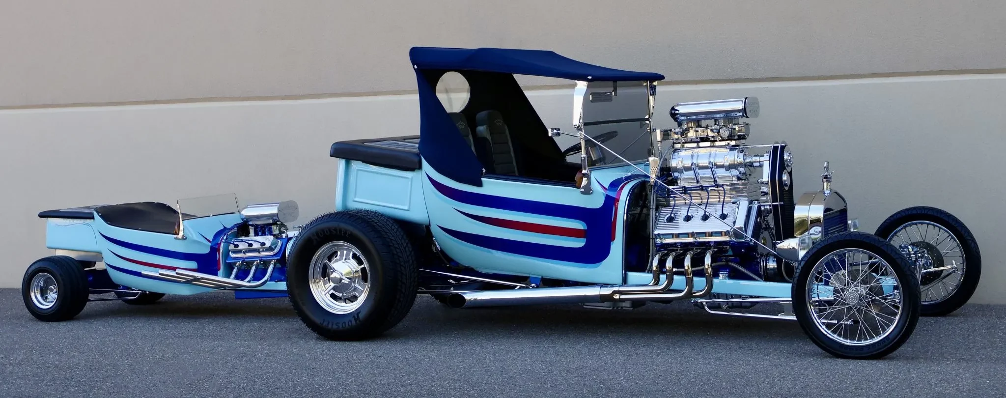 Le Hot Rod repose sur une suspension faite sur mesure avec barres d’échelle chromées, un avant “suicide” et des “coilovers” arrière réglables. La peinture bleu clair est complétée par des graphiques métallisés tricolores et la capote amovible est en Canvas bleu foncé. L’intérieur se résume à des sièges baquets, un volant en billette d’alu, un tableau de bord en bois et des compteurs “Classic Instruments”. Le Hot Rod est associé à une remorque assortie construite par “Bad Bobs”, équipée d’un frigo caché sous le faux moteur. Ce Hot Rod’T a remporté le 1er prix de l’Autorama de Detroit après son achèvement.