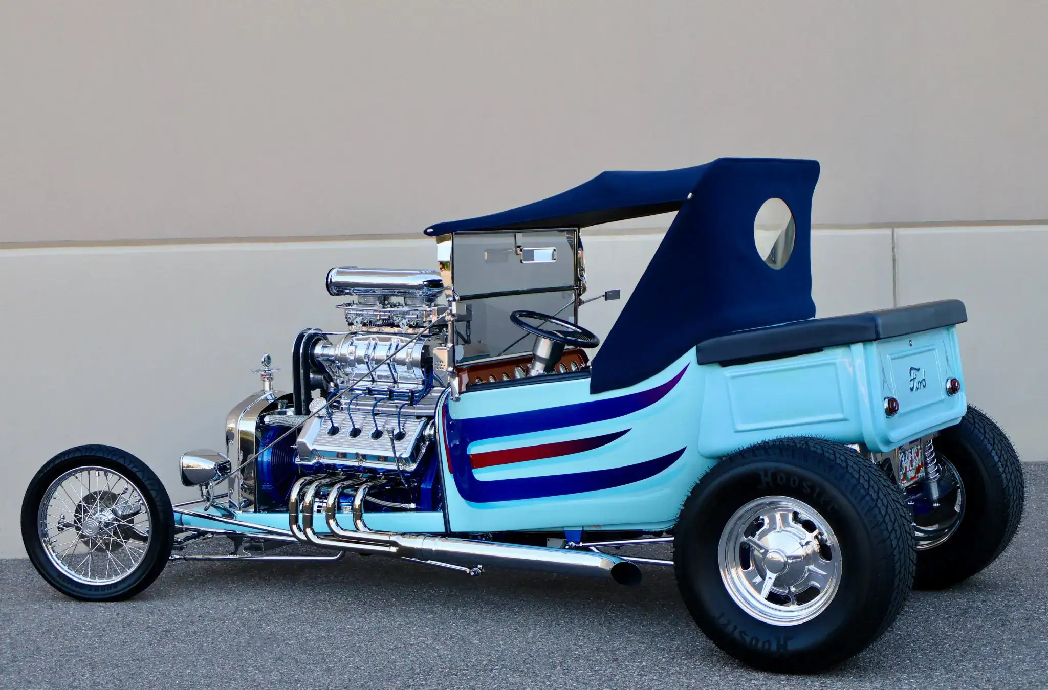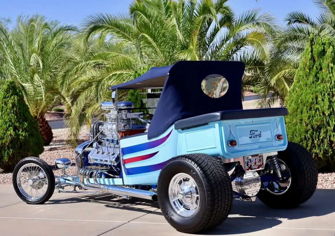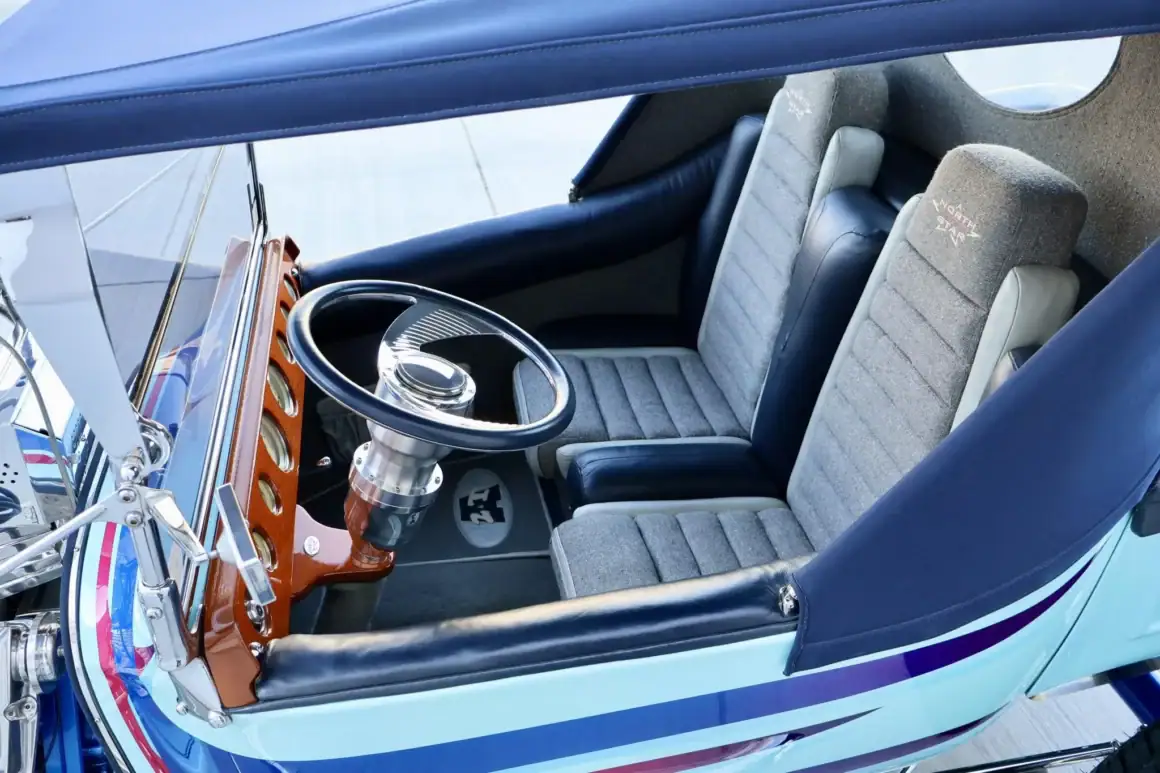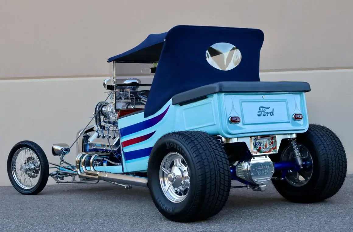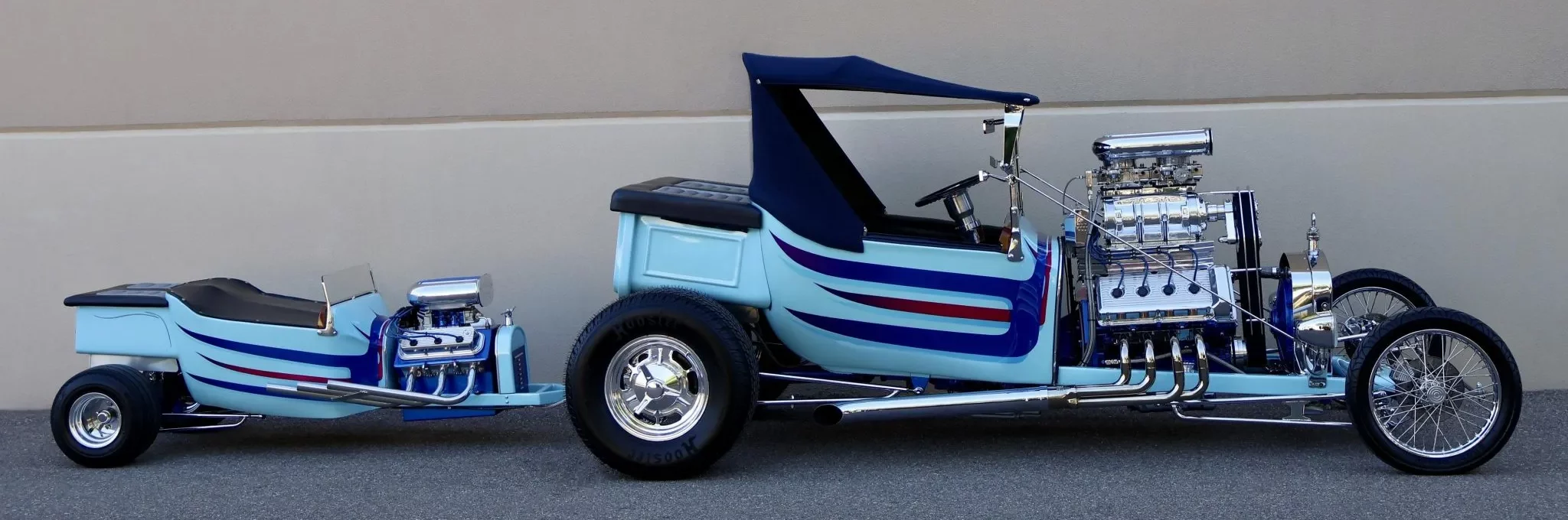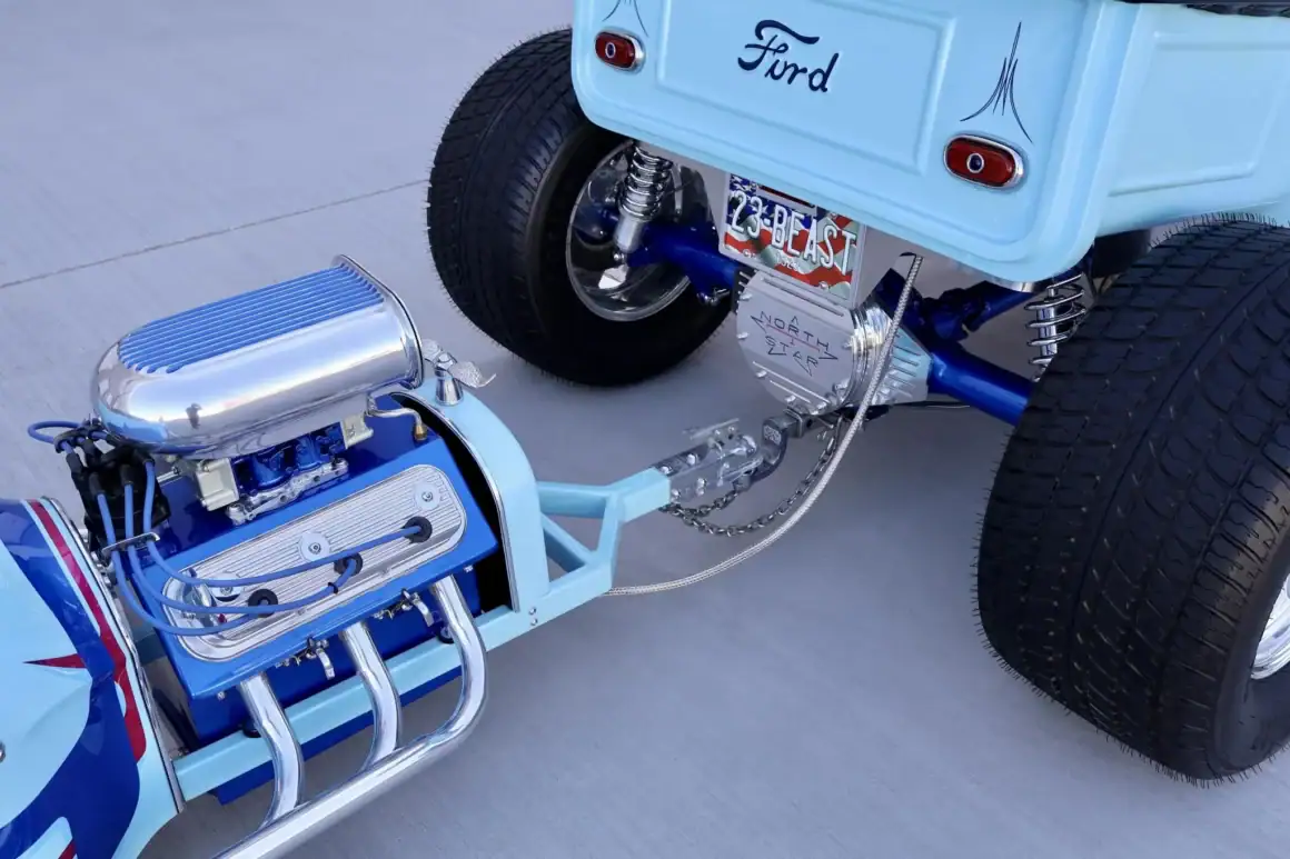 Le Hot Rod repose sur une suspension faite sur mesure avec barres d’échelle chromées, un avant “suicide” et des “coilovers” arrière réglables. La peinture bleu clair est complétée par des graphiques métallisés tricolores et la capote amovible est en Canvas bleu foncé. L’intérieur se résume à des sièges baquets, un volant en billette d’alu, un tableau de bord en bois et des compteurs “Classic Instruments”. Le Hot Rod est associé à une remorque assortie construite par “Bad Bobs”, équipée d’un frigo caché sous le faux moteur. Ce Hot Rod’T a remporté le 1er prix de l’Autorama de Detroit après son achèvement.