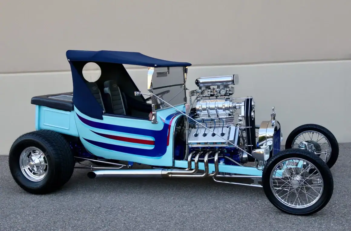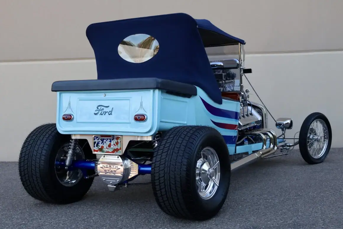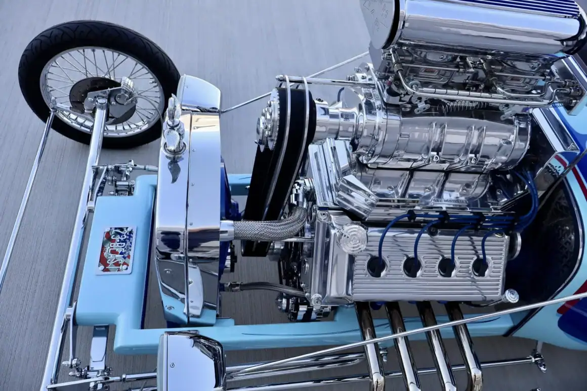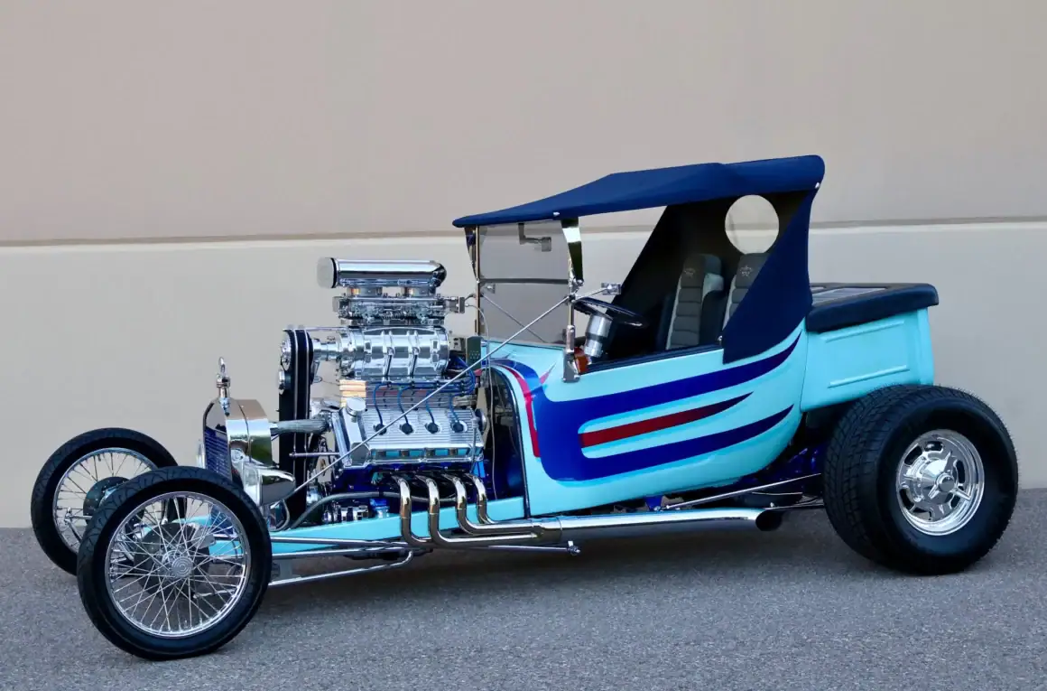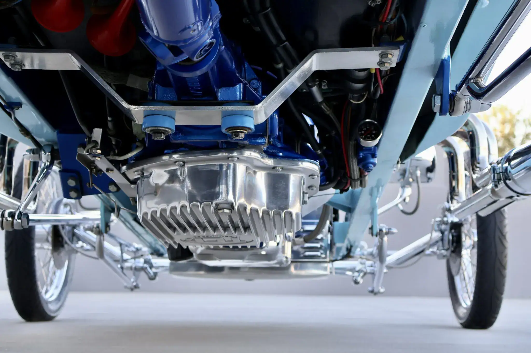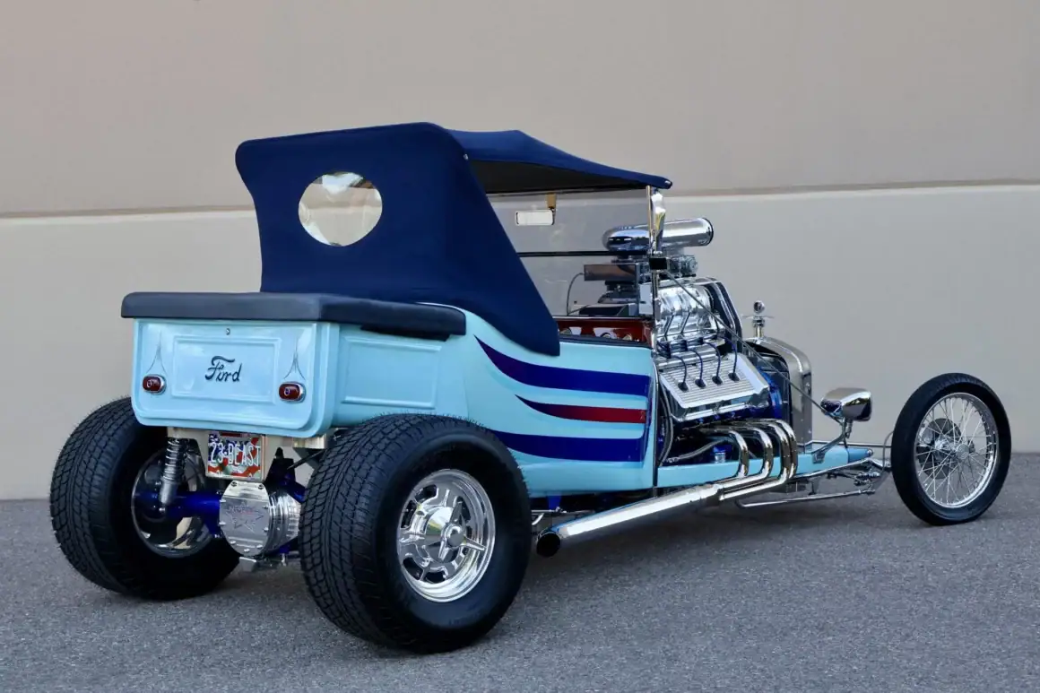 Le Hot Rod repose sur une suspension faite sur mesure avec barres d’échelle chromées, un avant “suicide” et des “coilovers” arrière réglables. La peinture bleu clair est complétée par des graphiques métallisés tricolores et la capote amovible est en Canvas bleu foncé. L’intérieur se résume à des sièges baquets, un volant en billette d’alu, un tableau de bord en bois et des compteurs “Classic Instruments”. Le Hot Rod est associé à une remorque assortie construite par “Bad Bobs”, équipée d’un frigo caché sous le faux moteur. Ce Hot Rod’T a remporté le 1er prix de l’Autorama de Detroit après son achèvement.