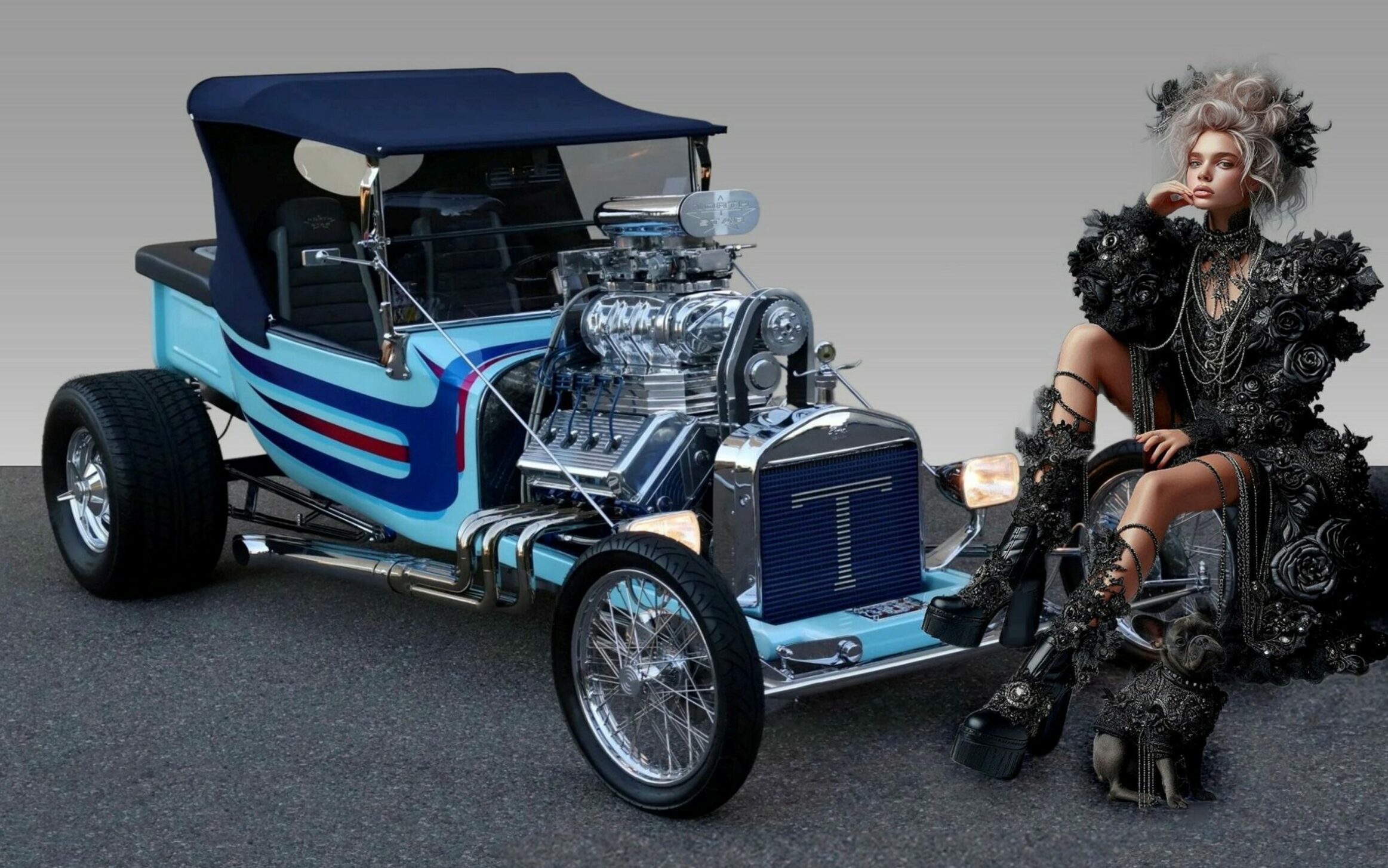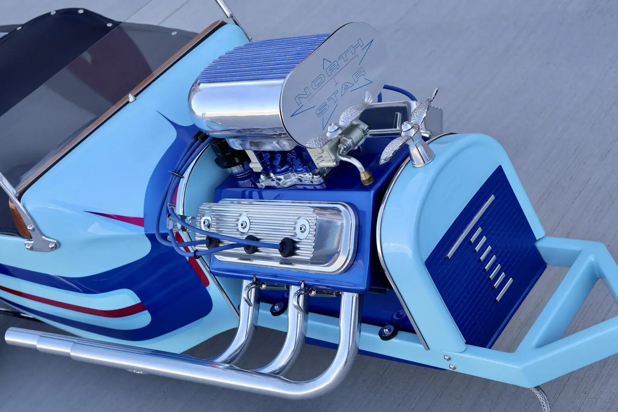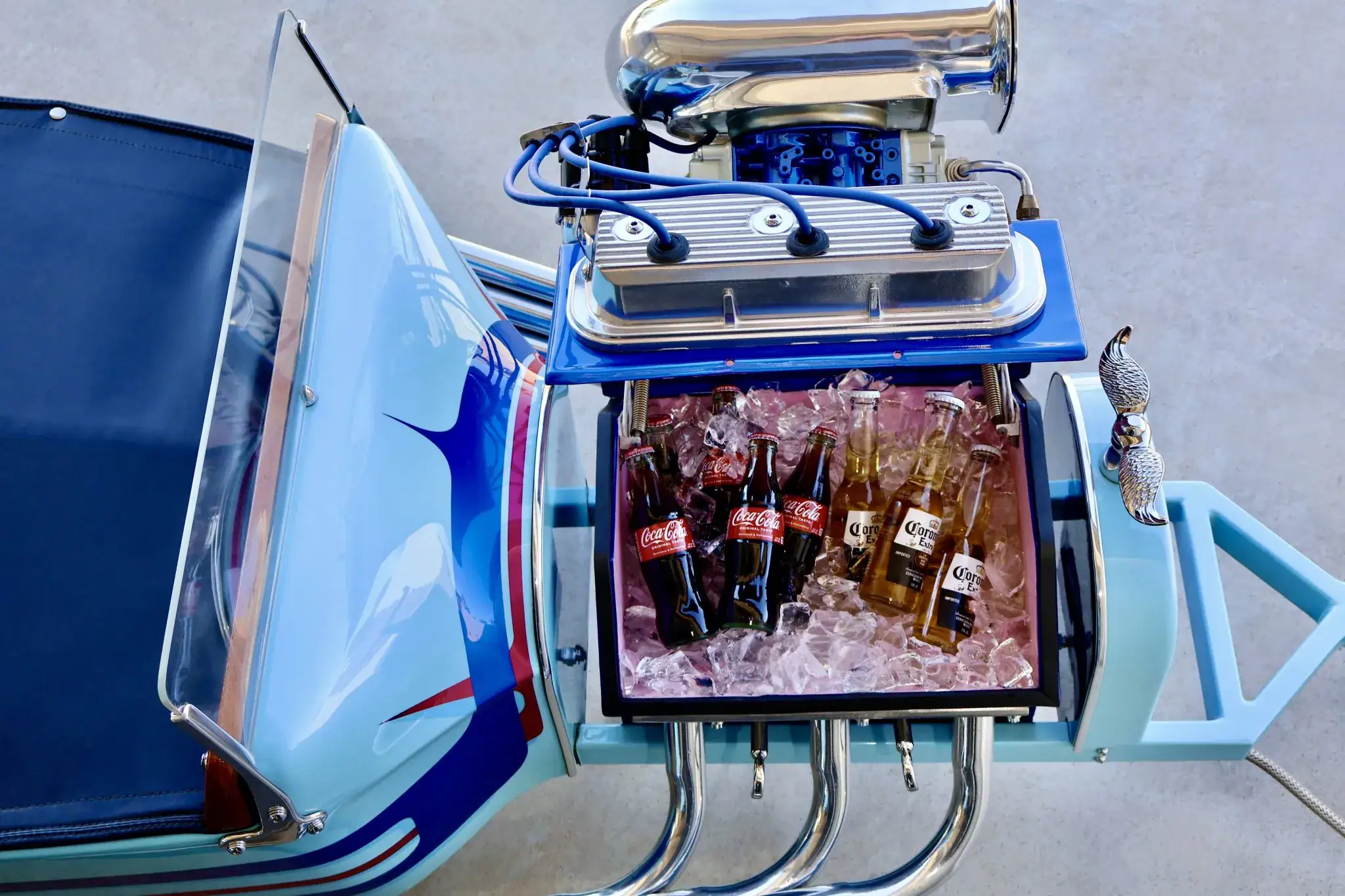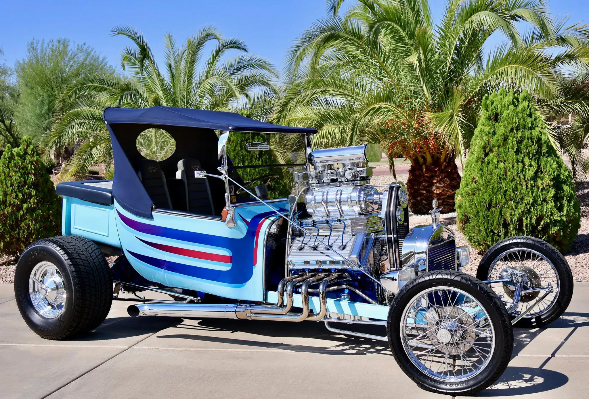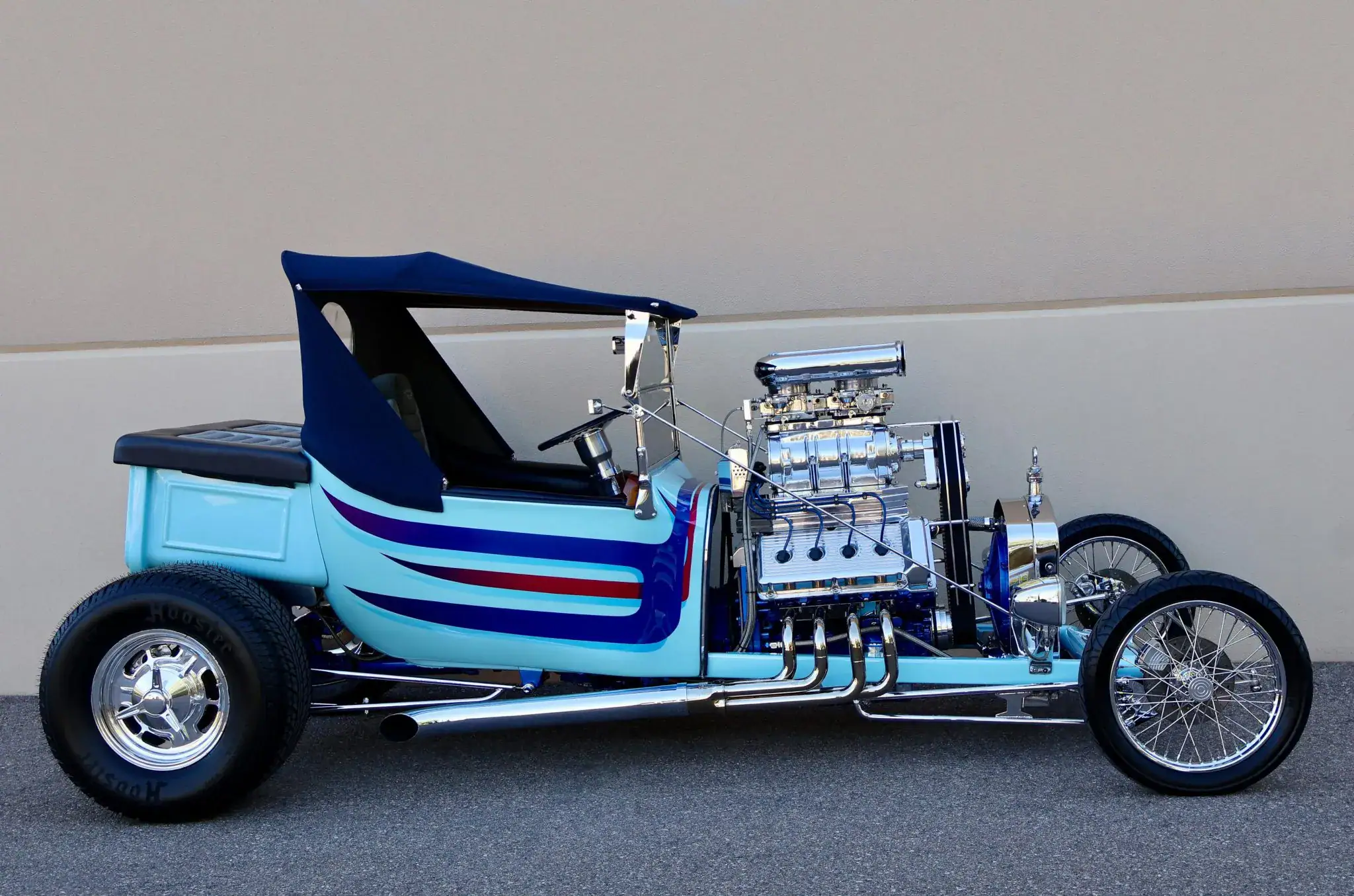 Le Hot Rod repose sur une suspension faite sur mesure avec barres d’échelle chromées, un avant “suicide” et des “coilovers” arrière réglables. La peinture bleu clair est complétée par des graphiques métallisés tricolores et la capote amovible est en Canvas bleu foncé. L’intérieur se résume à des sièges baquets, un volant en billette d’alu, un tableau de bord en bois et des compteurs “Classic Instruments”. Le Hot Rod est associé à une remorque assortie construite par “Bad Bobs”, équipée d’un frigo caché sous le faux moteur. Ce Hot Rod’T a remporté le 1er prix de l’Autorama de Detroit après son achèvement.