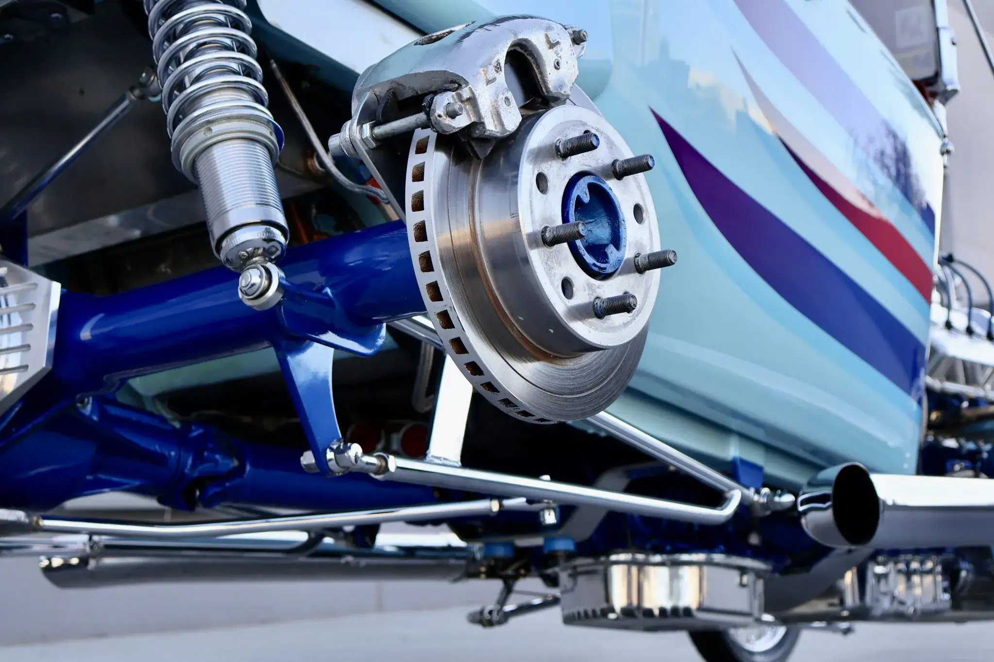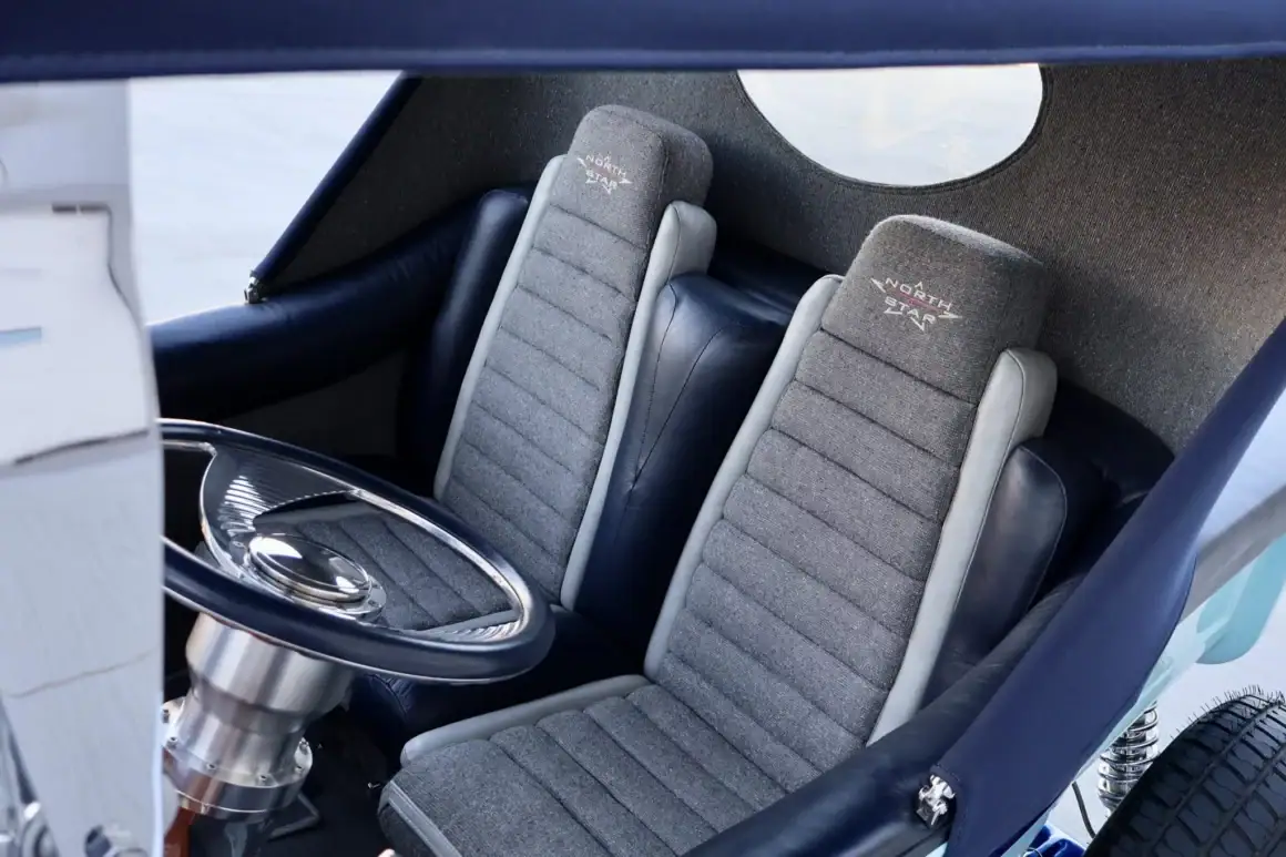 Des jantes à rayons de 18′ sont utilisées à l’avant, et les unités arrière sont des jantes alliages Boyd’s de 15po avec des pneus Hoosier. Les freins “à disques” aux quatre roues ont des étriers chromés. L’avant est dit “suicide” car il utilise un ressort à lames transversal chromé, des barres d’échelle, un essieu tubulaire et des amortisseurs à levier… Tout pour le look… Et à l’arrière se trouvent des barres échelles chromées, des liens triangulés et des coilovers avec amortos Carrera. Les sièges baquets sont garnis d’un tissu personnalisé avec une accent Northstar. Un rembourrage coordonné recouvre les panneaux latéraux.