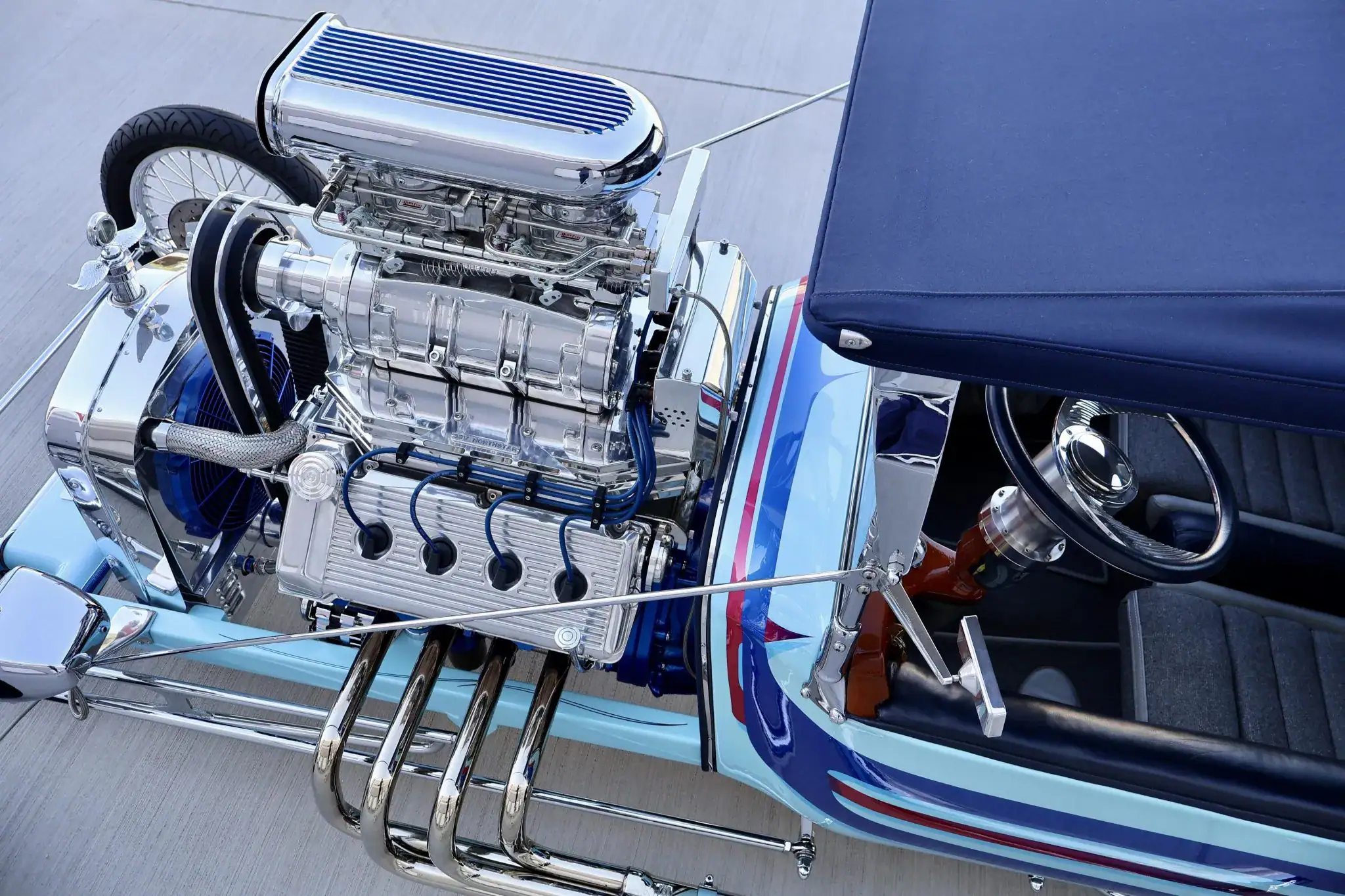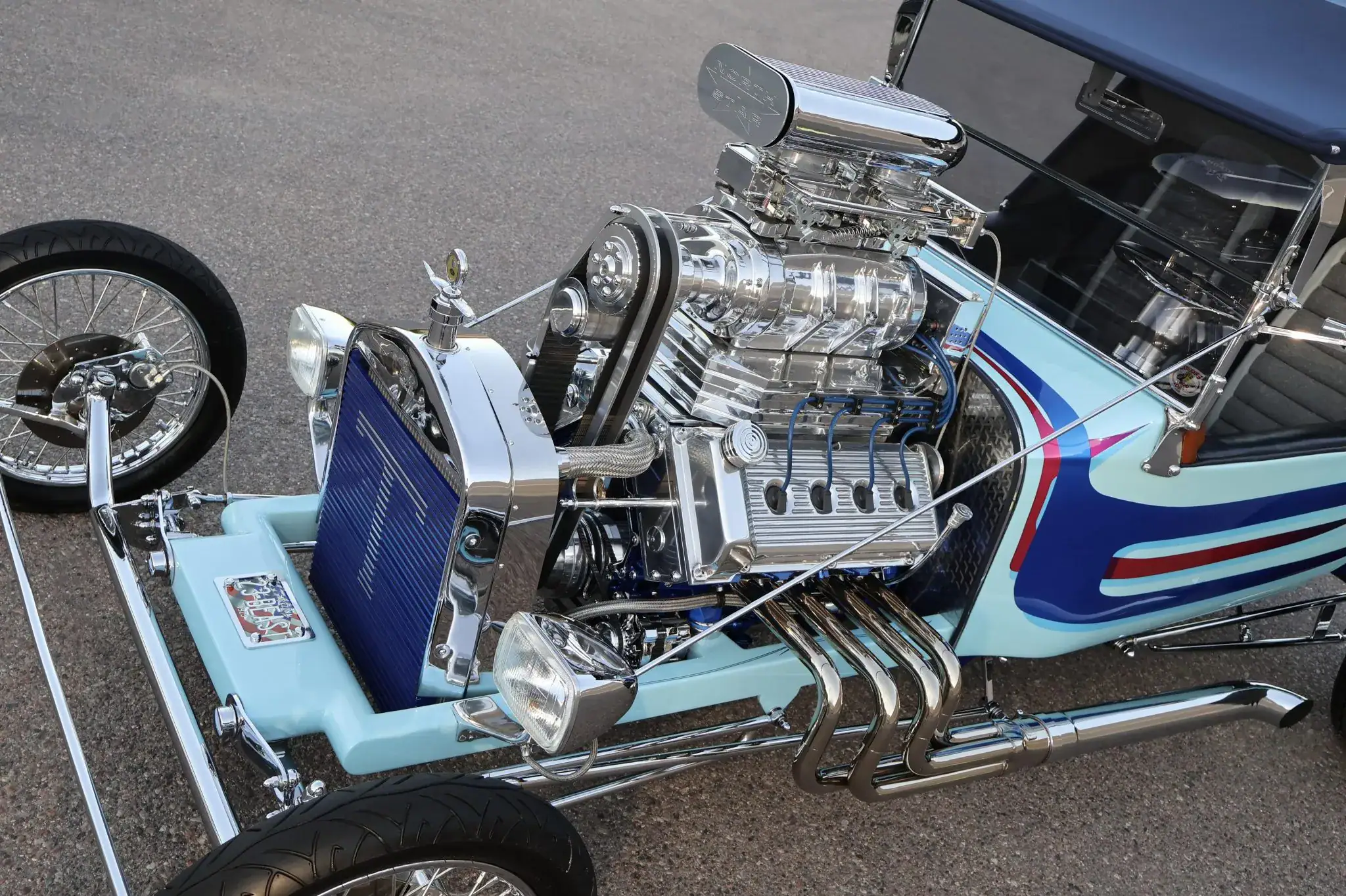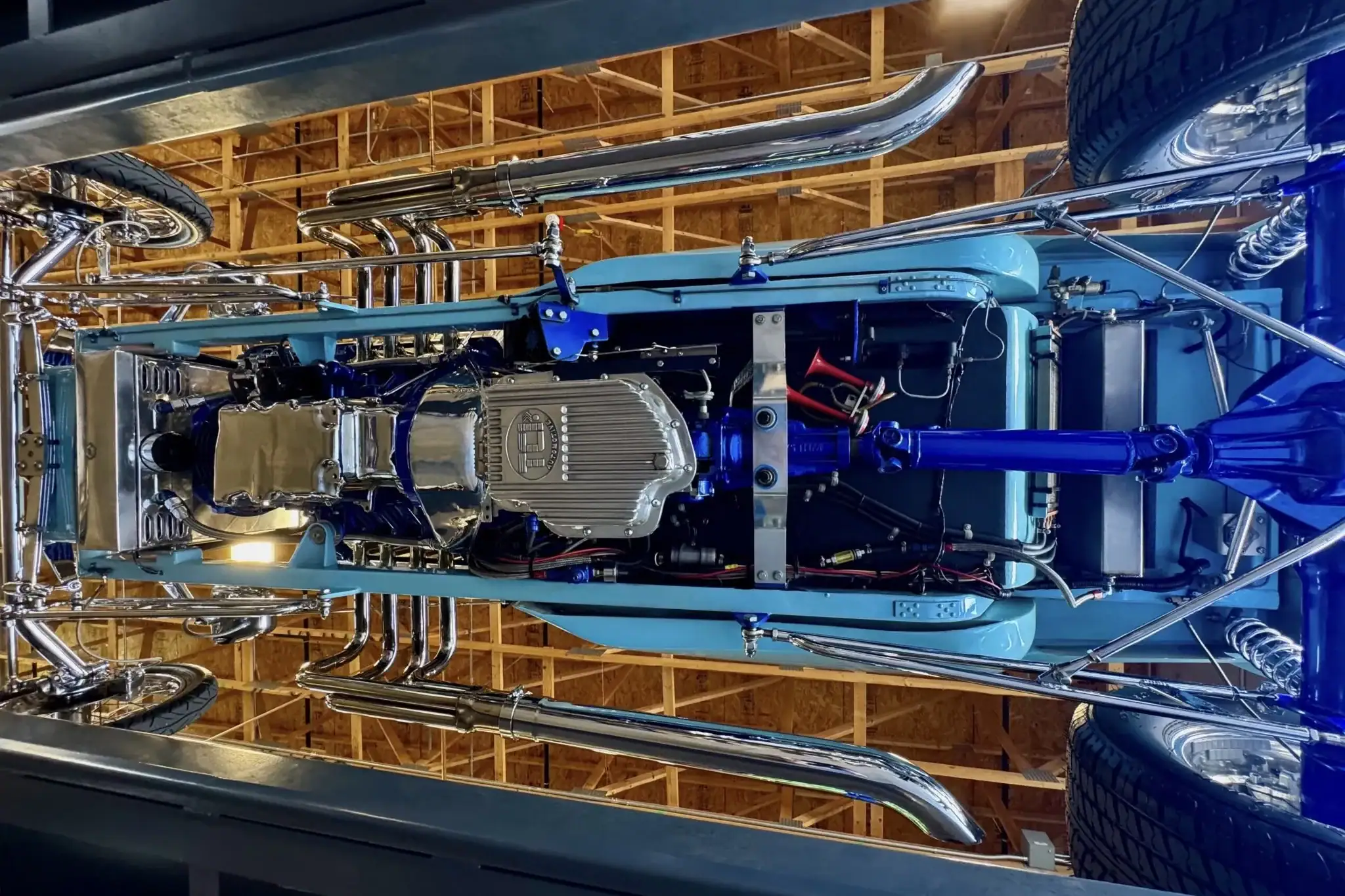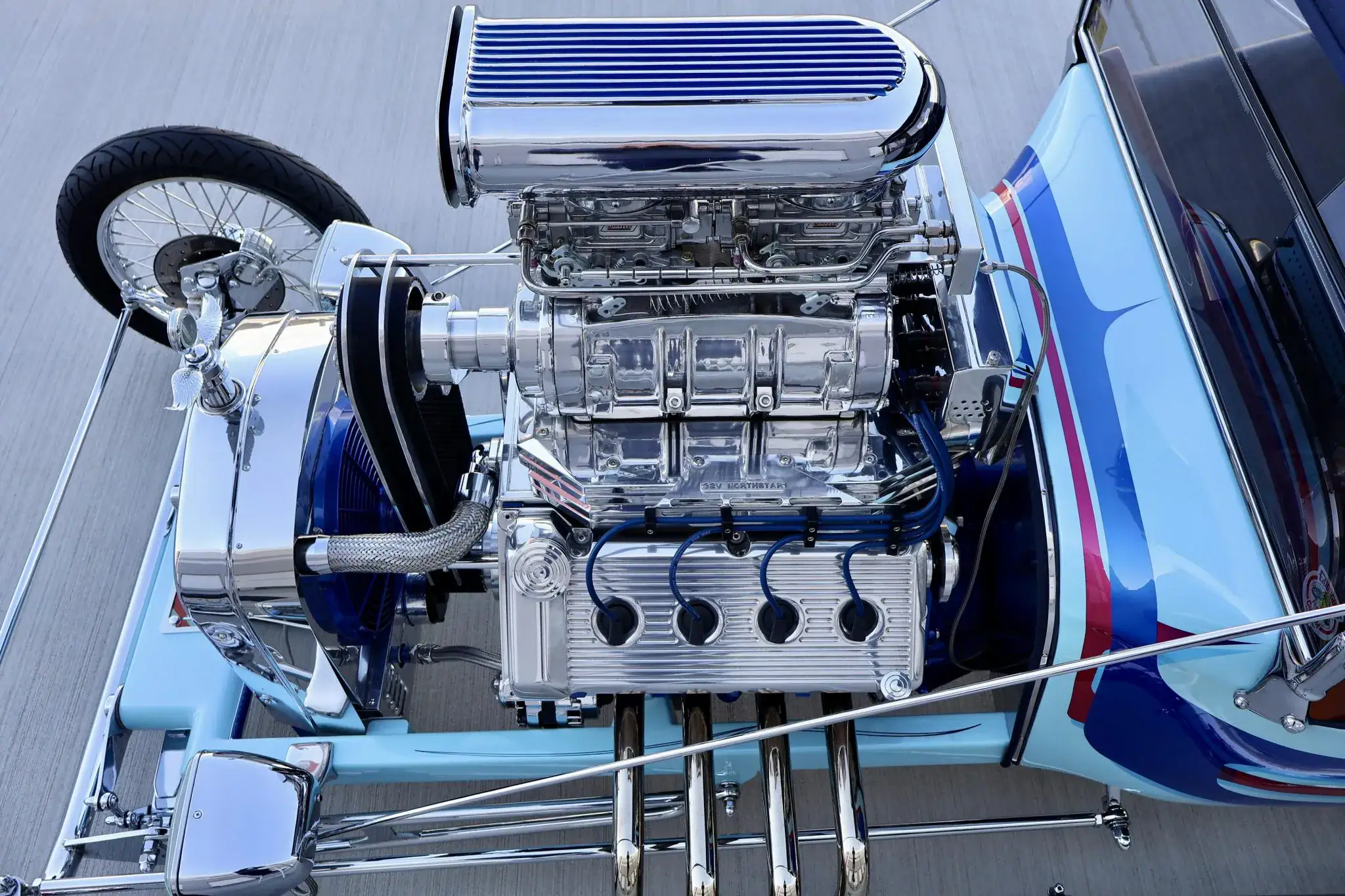 La carrosserie en fibre de verre du T de l’article (mais c’est pareil pour mon Novel’T, est montée sur un châssis en échelle basique. Le V8 Cadillac Northstar 4,6 litres a été re-conçu/re-construit pour ce Hot Rod’T avec un bloc peint comme la carrosserie en bleu foncé accentué par des détails chromés et polis. Il est surmonté d’un compresseur Dyer 6-71 avec deux carburateurs Quick Fuel à quatre corps et une prise d’air de style Hilborn avec une plaque Northstar personnalisée. Les en-têtes Sanderson sont reliés à des tuyaux de côté, le pare-feu présente un motif géométrique de type écaille de tortue de Bishamon.