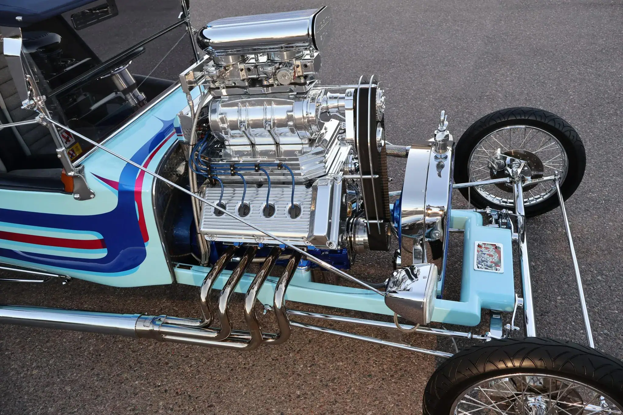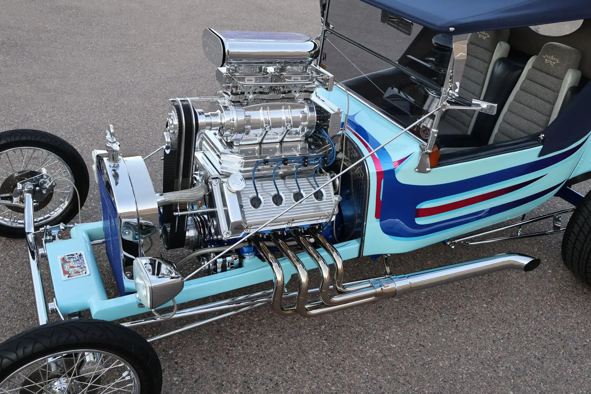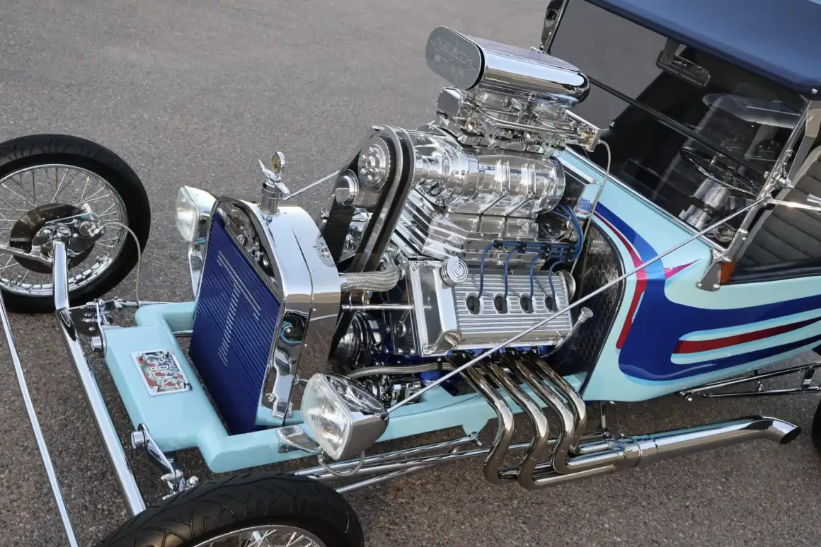La carrosserie en fibre de verre du T de l’article (mais c’est pareil pour mon Novel’T, est montée sur un châssis en échelle basique. Le V8 Cadillac Northstar 4,6 litres a été re-conçu/re-construit pour ce Hot Rod’T avec un bloc peint comme la carrosserie en bleu foncé accentué par des détails chromés et polis. Il est surmonté d’un compresseur Dyer 6-71 avec deux carburateurs Quick Fuel à quatre corps et une prise d’air de style Hilborn avec une plaque Northstar personnalisée. Les en-têtes Sanderson sont reliés à des tuyaux de côté, le pare-feu présente un motif géométrique de type écaille de tortue de Bishamon.