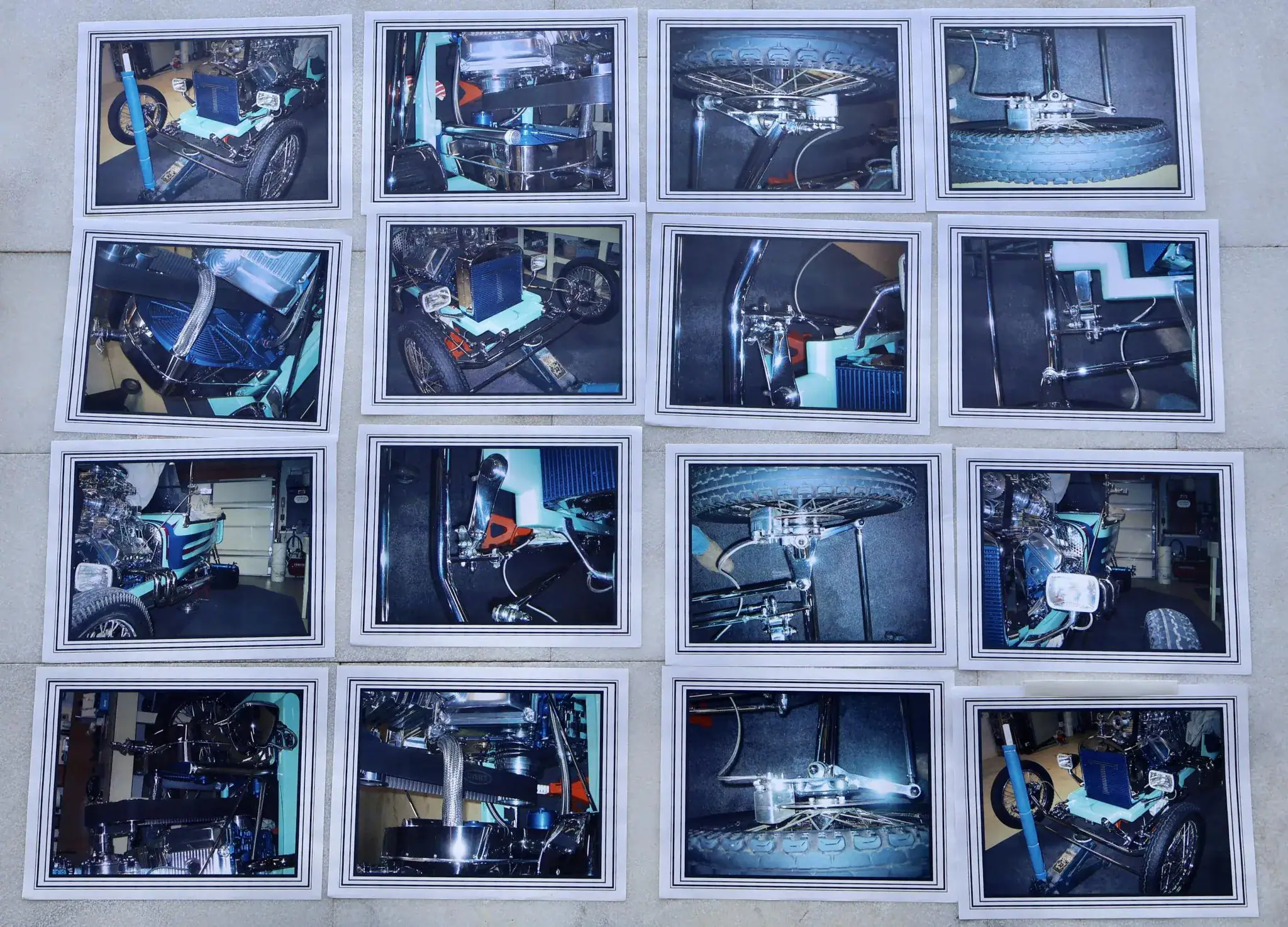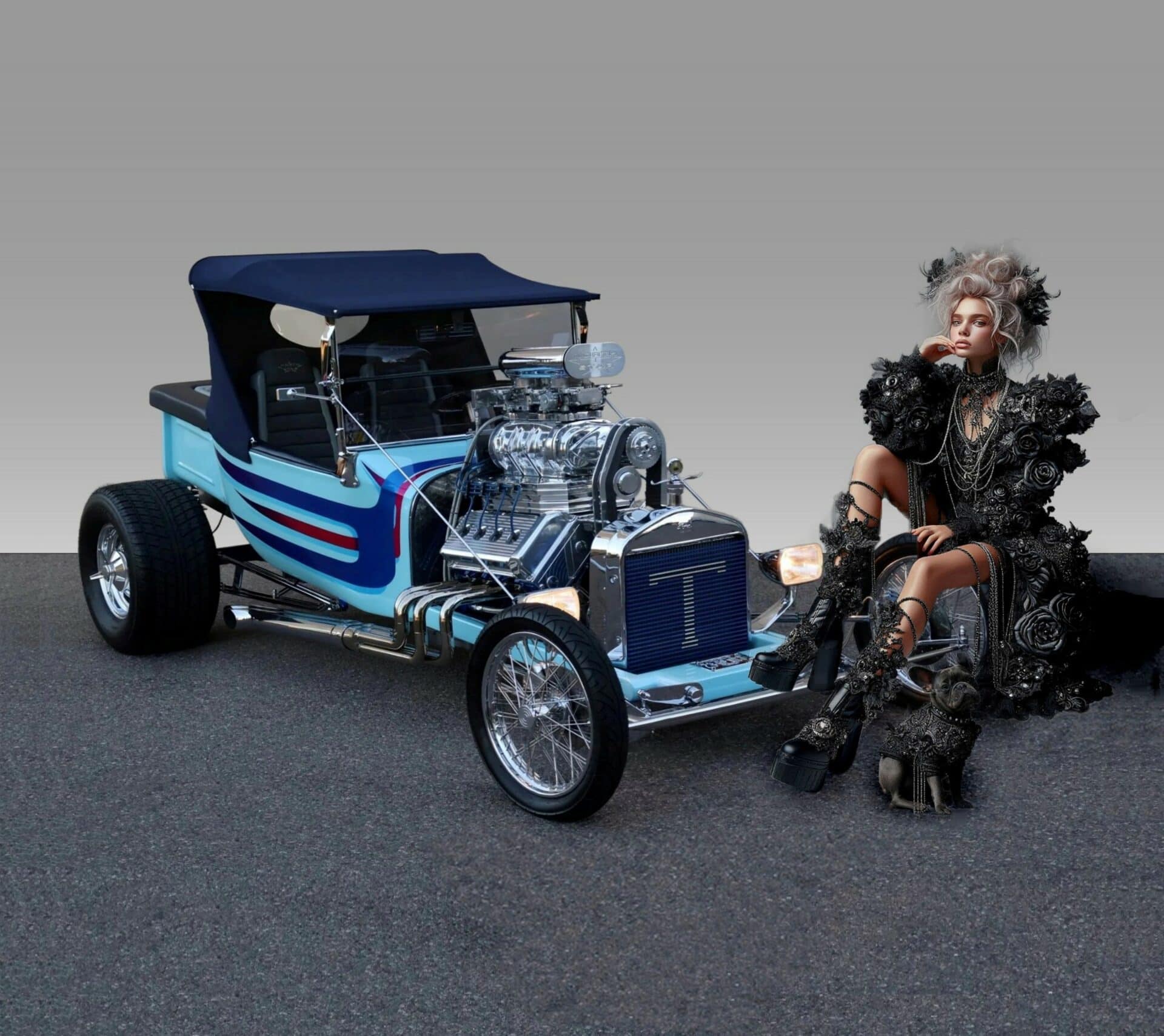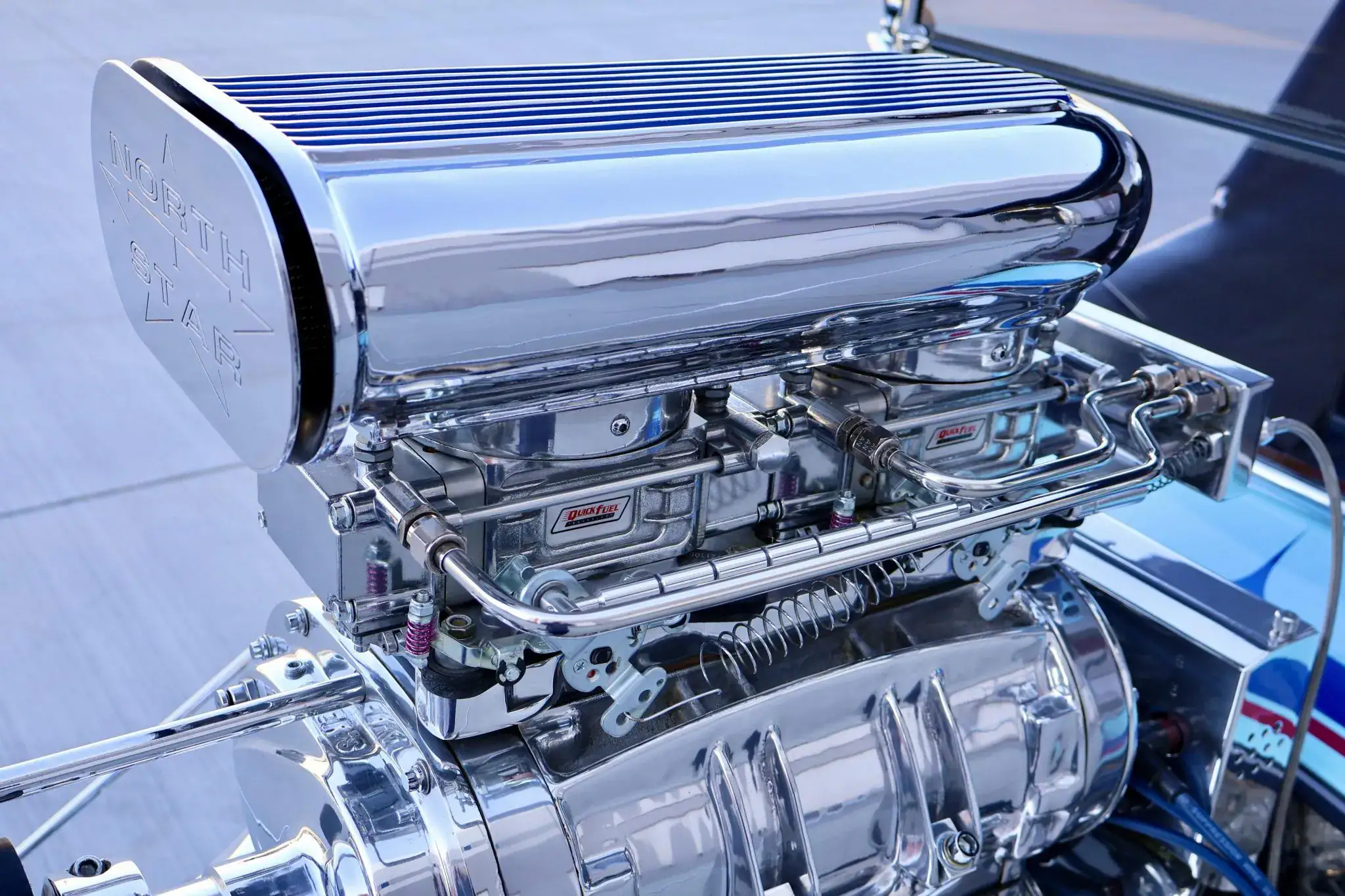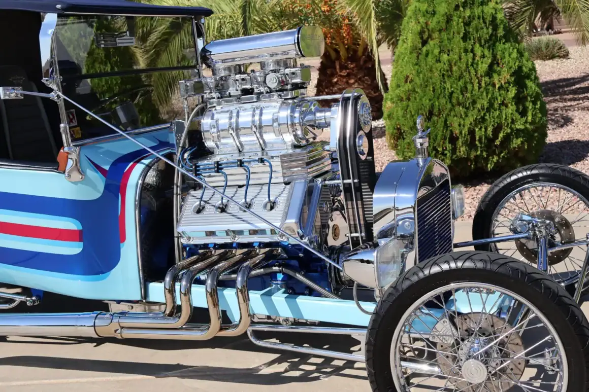La carrosserie en fibre de verre du T de l’article (mais c’est pareil pour mon Novel’T, est montée sur un châssis en échelle basique. Le V8 Cadillac Northstar 4,6 litres a été re-conçu/re-construit pour ce Hot Rod’T avec un bloc peint comme la carrosserie en bleu foncé accentué par des détails chromés et polis. Il est surmonté d’un compresseur Dyer 6-71 avec deux carburateurs Quick Fuel à quatre corps et une prise d’air de style Hilborn avec une plaque Northstar personnalisée. Les en-têtes Sanderson sont reliés à des tuyaux de côté, le pare-feu présente un motif géométrique de type écaille de tortue de Bishamon.