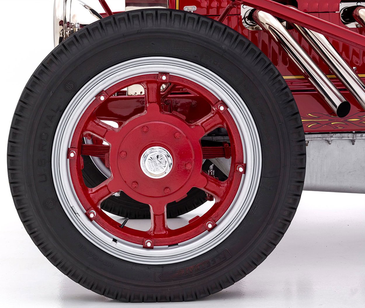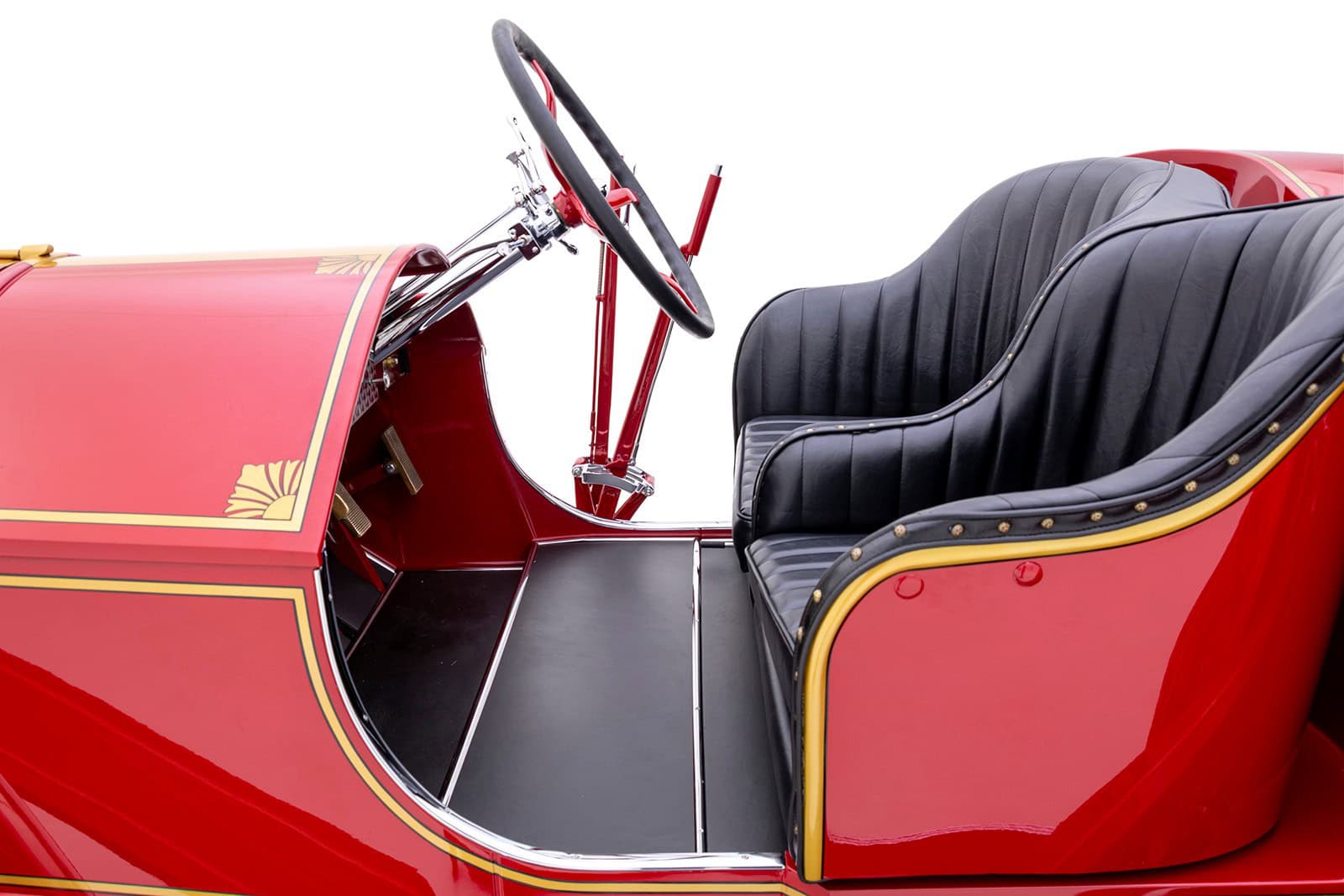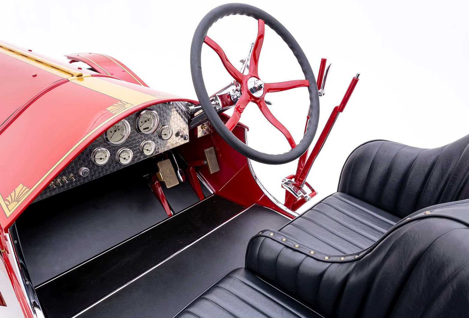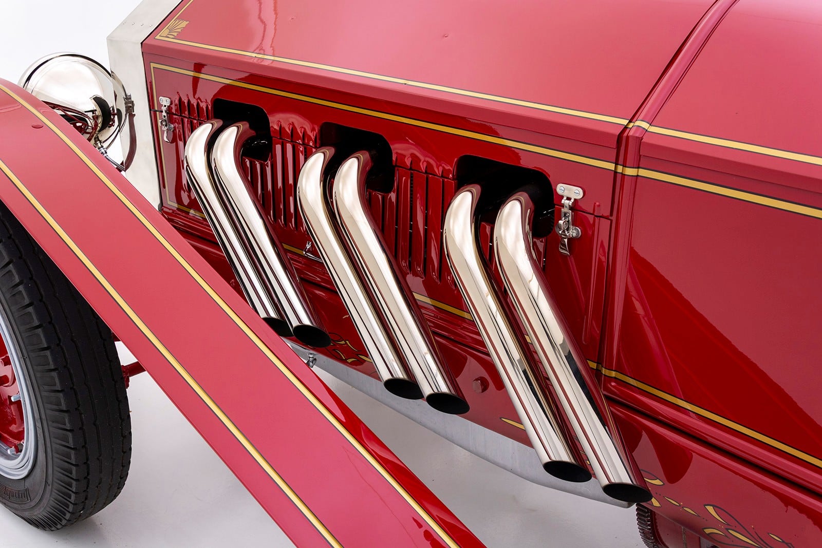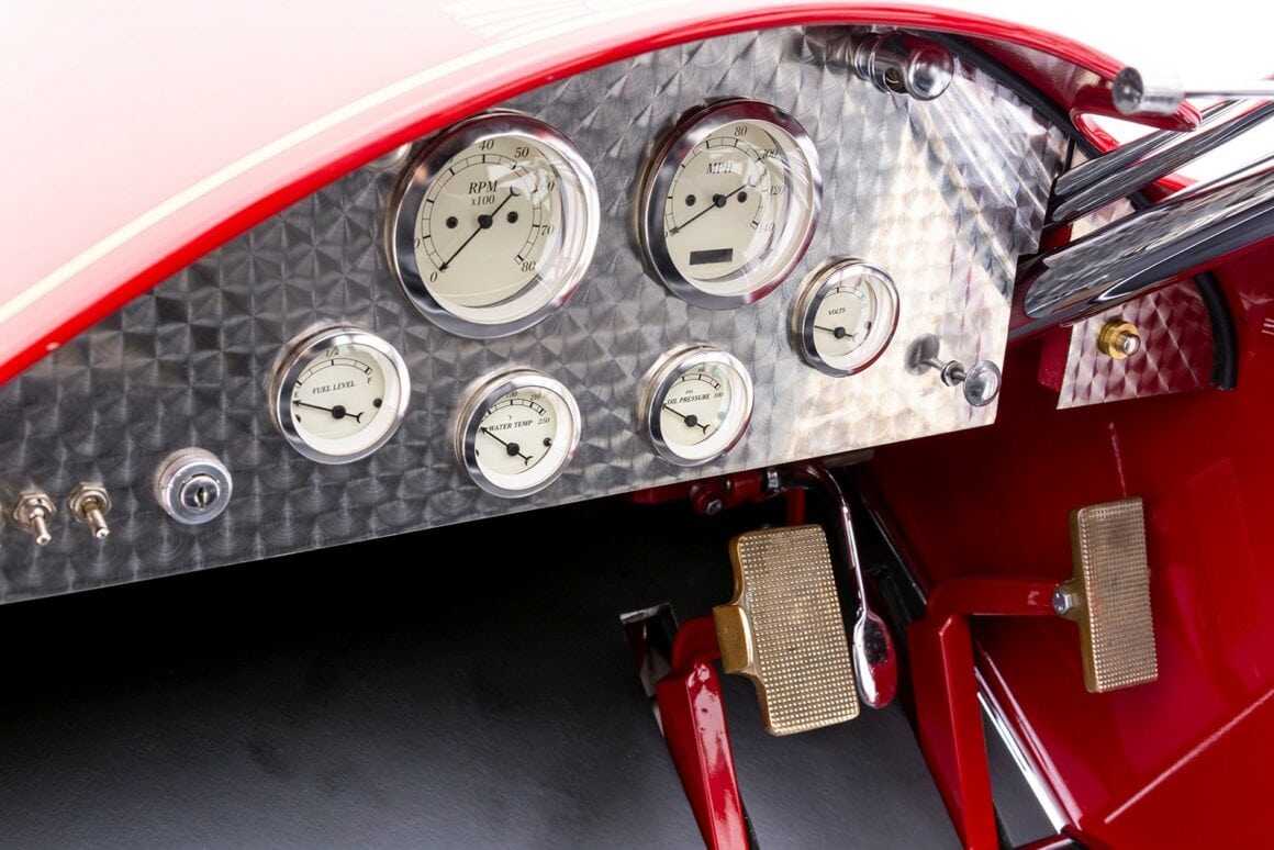 Même les ailes avant ont été allongées, ce qui a nécessité des marchepieds raccourcis. Longues et basses, les proportions capot long/pont court sont merveilleusement jugées pour masquer la taille du Type 45. Parmi les touches fabuleuses, citons des feux arrière en forme de cloche de plongée d’époque, une porte de golf intégrée avec des charnières polies convenablement charnues (Donald est Golfeur invétéré), un radiateur et des phares en nickel poli, des roues en acier LaFrance de couleur assortie avec des pneus ballon charnus, et bien plus encore. Bien qu’il soit visuellement époustouflant, ce Hot Rod étrange est également conçu pour être conduit, de sorte qu’il y a une direction assistée hydraulique, des leviers de vitesse et de freins assistés.