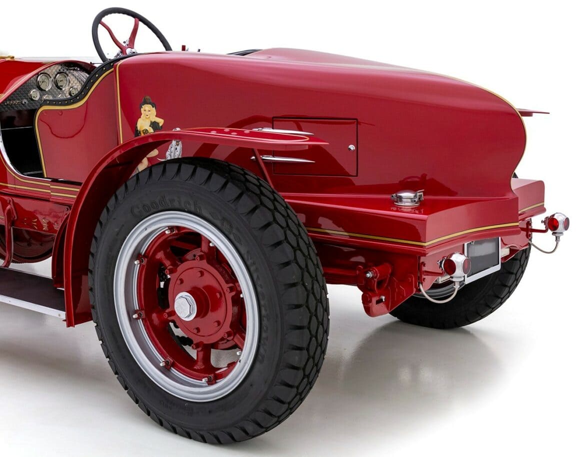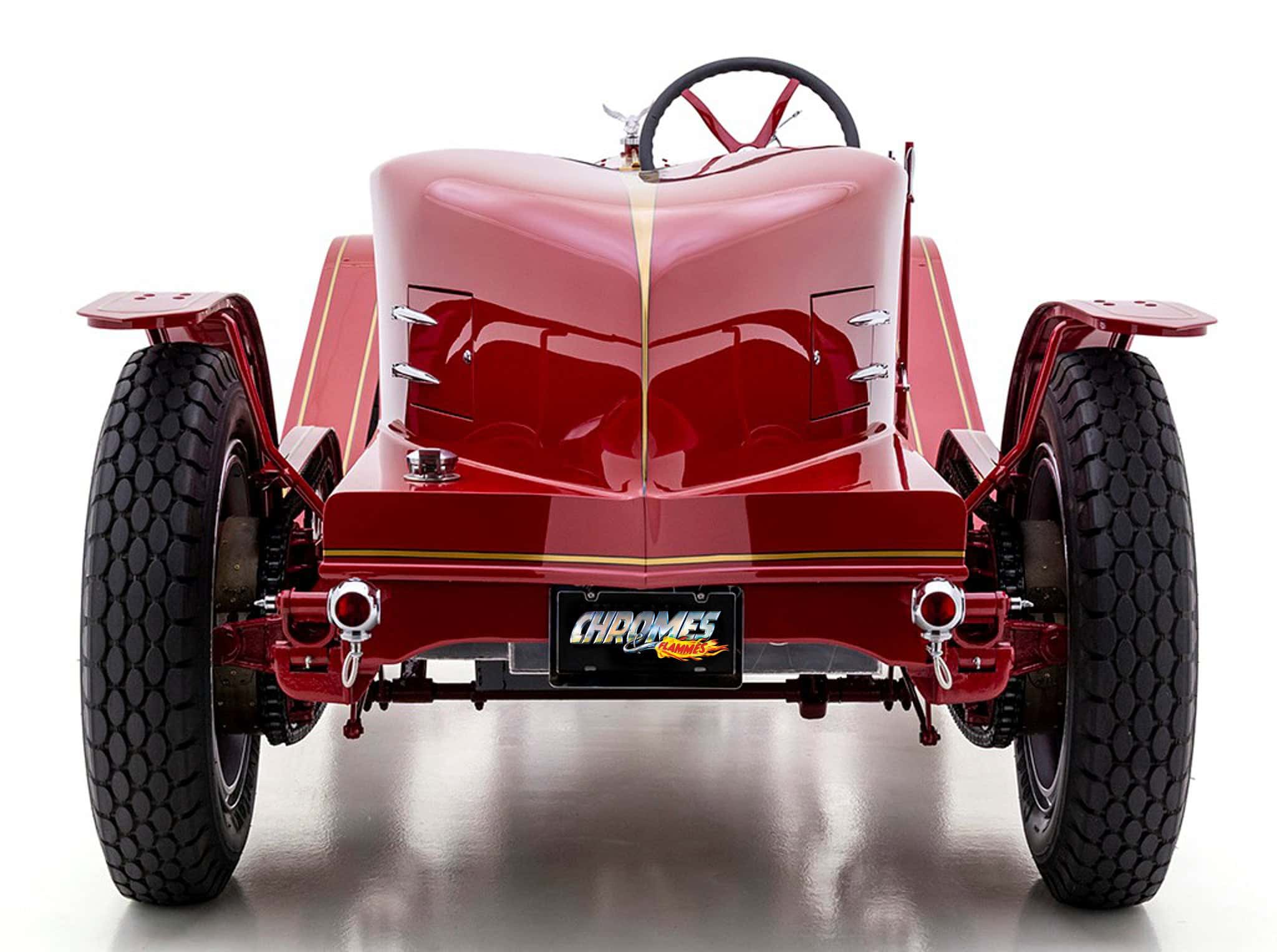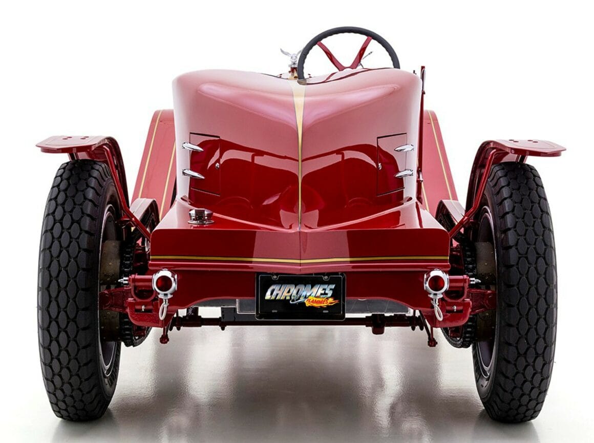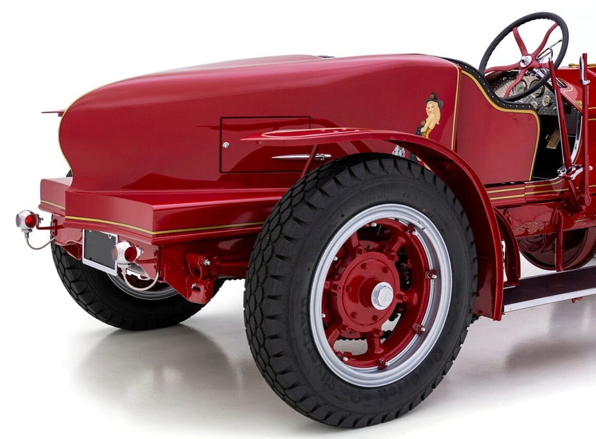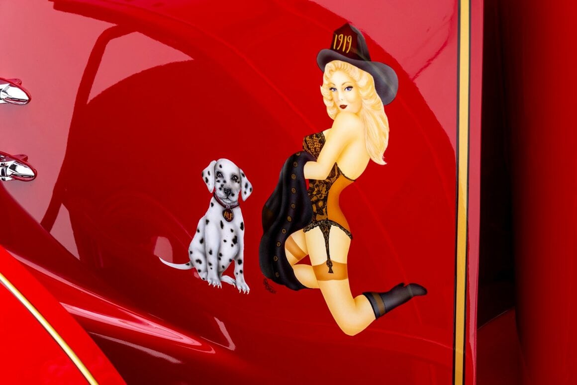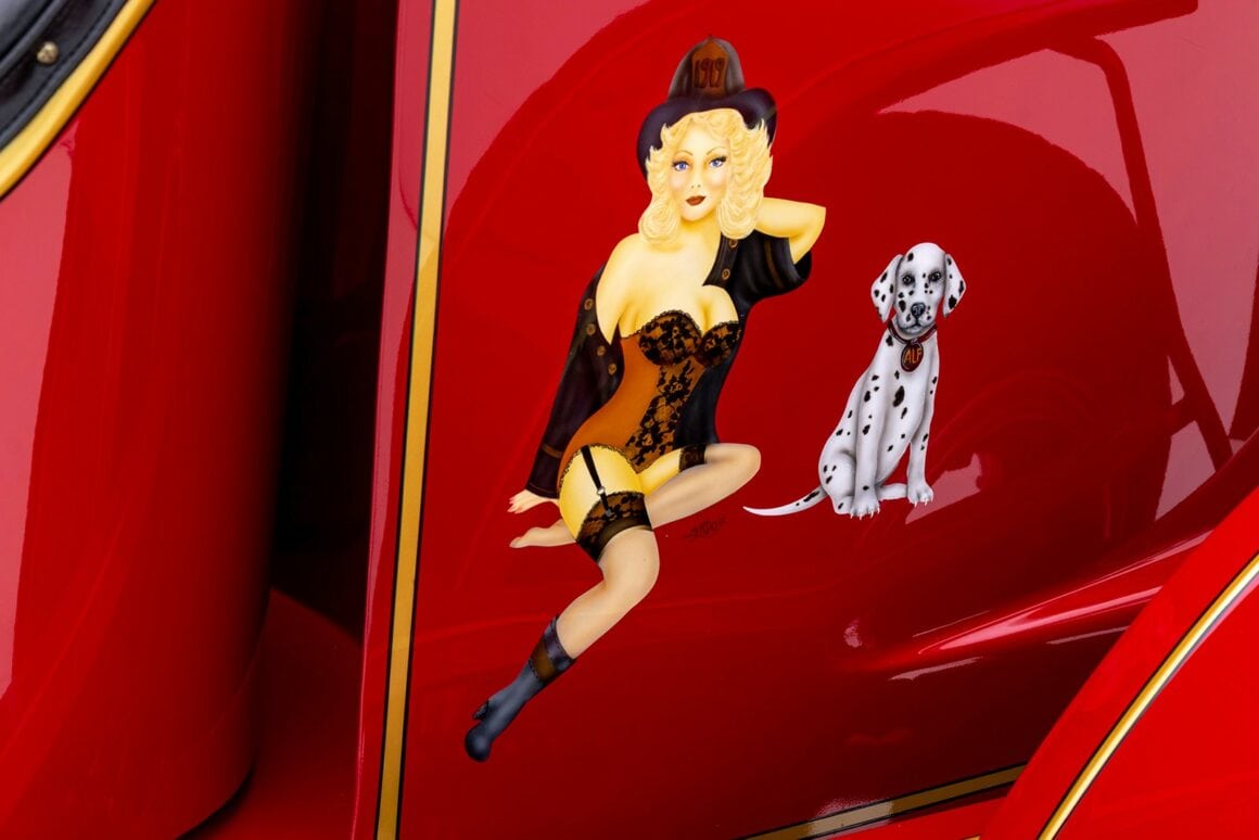 La bête peut atteindre 60 mph à un peu plus de 1.000 tr/min, tirant comme un train de marchandises tout au long du trajet. Les échappements brillamment polis sortant du capot et tournés vers le bas font connaître son arrivée bien avant que la peinture rouge brillante, les filets dorés et les pin-up à l’aérographe n’attirent l’attention ! Superbement réalisé et doté d’une présence et d’une qualité indéniables, ce puissant American Hot Rod LaFrance Speedster de 1919 est une bête exaltante, qui offrira certainement une expérience de conduite sans pareille… Donald m’a proposé un deal détaxé spécial ChromesFlammes pour 254.000$ et annule les taxes… J’hésite… Le cadeau présidentiel est Trumpesque, trop… Je vais y réfléchir…