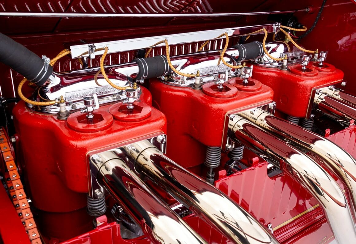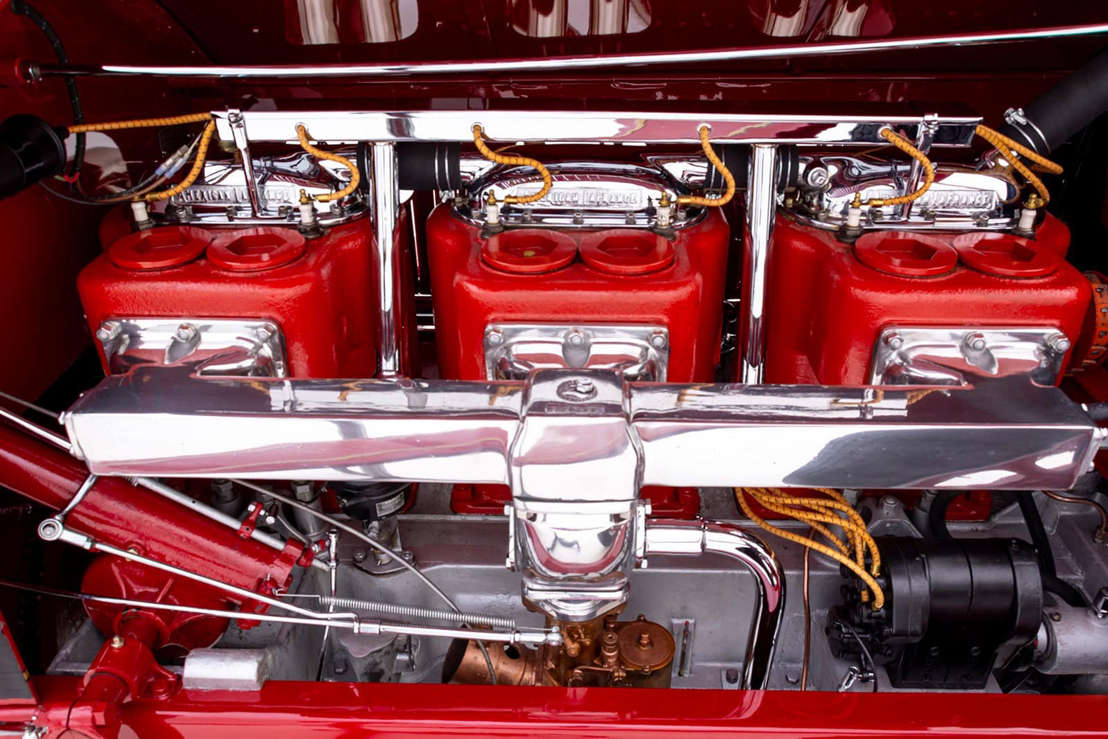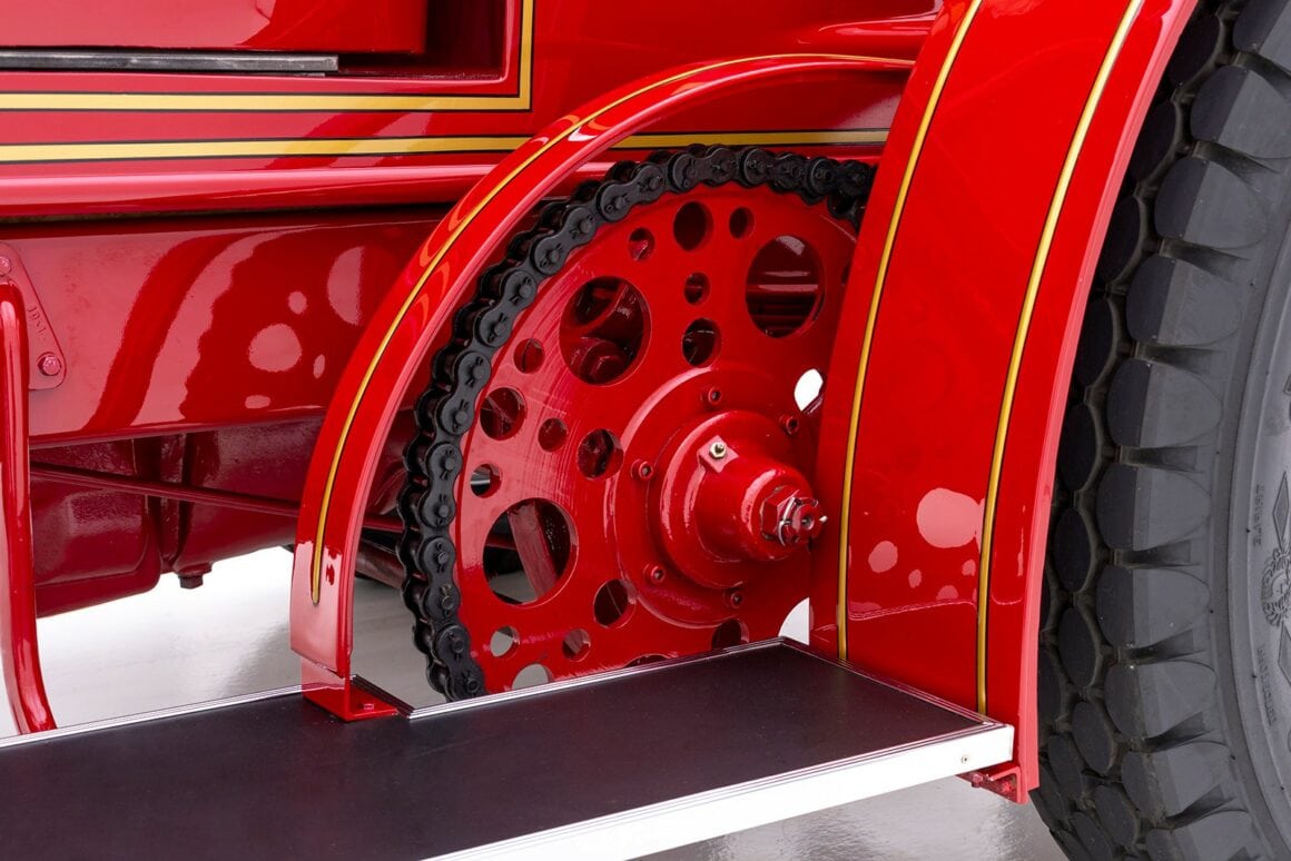 Il y a aussi les 2 sièges réglables, des clignotants et une gamme complète d’instruments dans le tableau de bord. Le propriétaire souvent coiffé d’une casquette rouge, le trouve fantastique à conduire et jure que sa bête s’est jusqu’à présent avérée remarquablement fiable. En ce qui concerne les déplacements dans des réunions de Hot Rodders, ce Hot Rod LaFrance n’aurait aucun mal à s’y rendre rapidement grâce à son énorme six cylindres en ligne, mais ce n’est plus à l’ordre du quelconque des jours présidentiels…. Avec un alésage de 5 1/2po et une course de 6po, il déplace 855 pouces cubes, soit environ 14.000cc. Il fournit un couple de torsion par l’intermédiaire d’une boîte à 3 vitesses entraînant deux pignons arrière à transmission par chaîne.