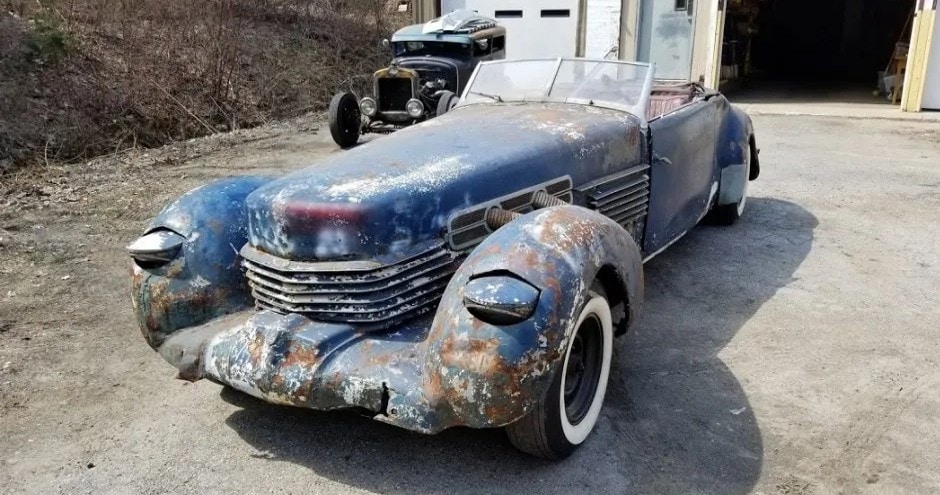 Je vous récapitule… Elle avait appartenu à un membre de la royauté et a ensuite failli devenir une voiture de course, avant d’être soudainement et mystérieusement abandonnée sur un terrain pendant des décennies, le propriétaire pensant que l’achat d’une nouvelle automobile était moins compliqué que de payer la réparation de la boite de vitesse… Une mentalité de gens riches. Le deuxième acheteur, bien que n’étant pas royal, était également une figure très connue de l’époque : Jerzy Wojtowicz, ancien pilote de chasse de la Seconde Guerre mondiale et un habitué des courses de stock-car. Wojtowicz voulait transformer la Cord en une machine de course, alors il a entrepris d’effectuer une variété de modifications sur elle… Mais il n’a jamais eu le temps de le faire. Il a simplement jeté la voiture dans un champ du Yorkshire…