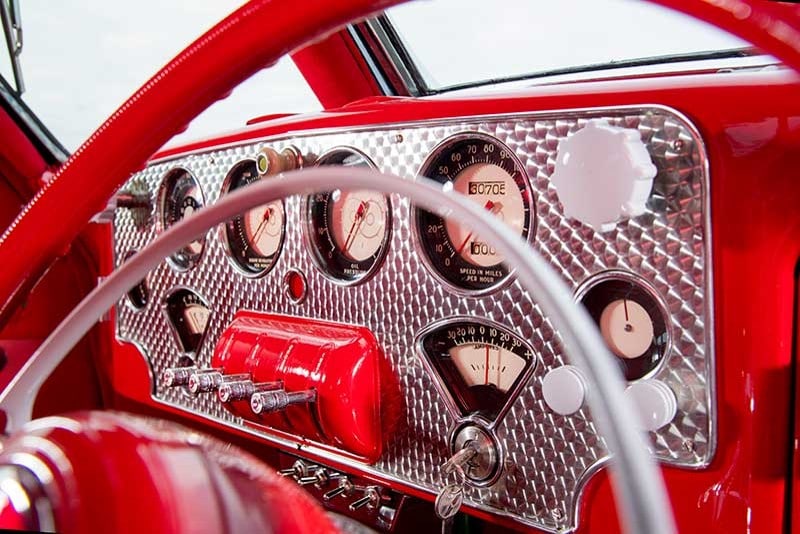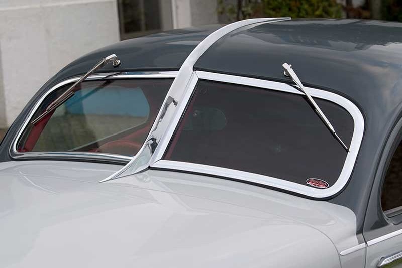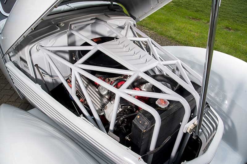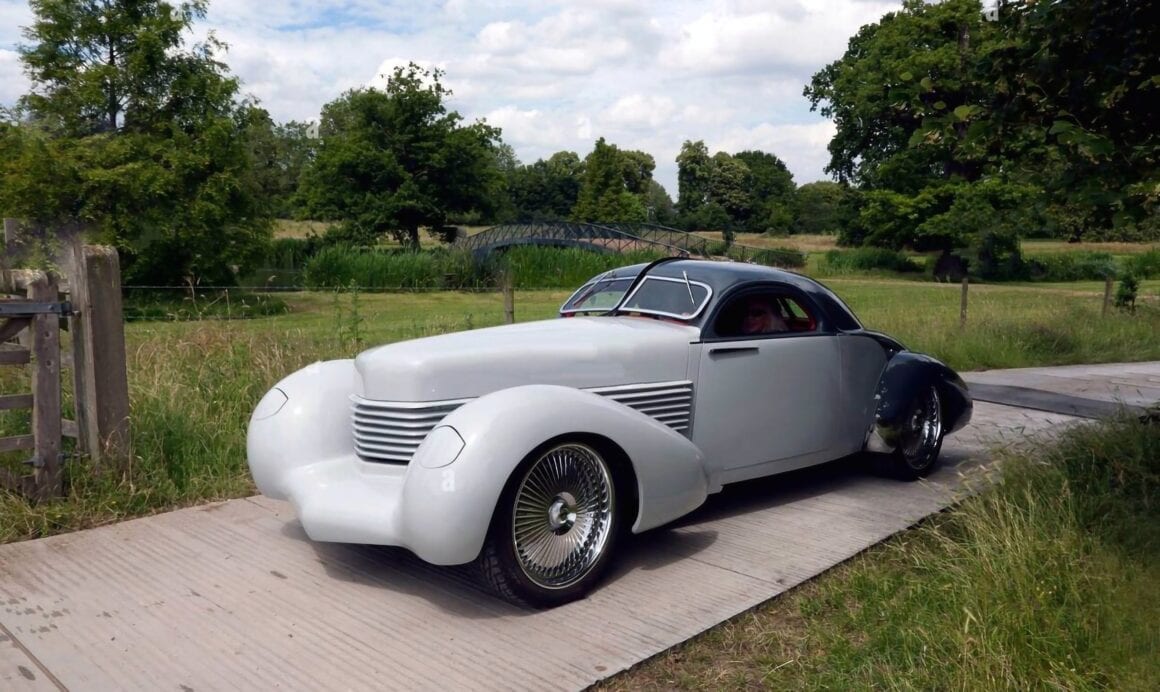 Elle y a passé les 50 années suivantes plus 20 en mises en vente sans pouvoir attirer un acheteur. Pendant ce temps, la nature a pris le dessus et les enfants locaux ont endommagé tout ce qui avait survécu à l’attaque de la nature… La Cord “Antitétanique’ est devenue la construction personnalisée la plus célèbre d’Andy Saunders, dévoilée en août 2017 aux Supernationals de Bedford au Royaume-Uni. Le résultat obtenu fut ce Coupé bicolore gris deux portes avec un intérieur rouge sang qui crie (en fait qui hurle), l’intemporalité et l’audace… Inspiré par une image qu’il avait vue sur une carte postale, Saunders a coupé l’arrière de la berline, élargi et retravaillé les ailes, allongé les portes, abaissé le toit et reconstruit l’arrière en utilisant des pièces d’une Volkswagen Beetle et d’une Jaguar Mk2. Le nez du cercueil cachant maintenant un V8 Chevrolet basique…
