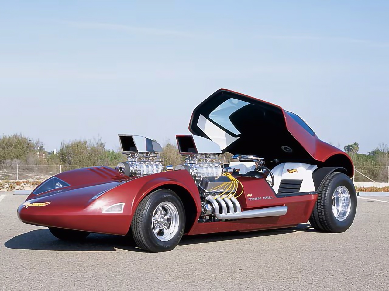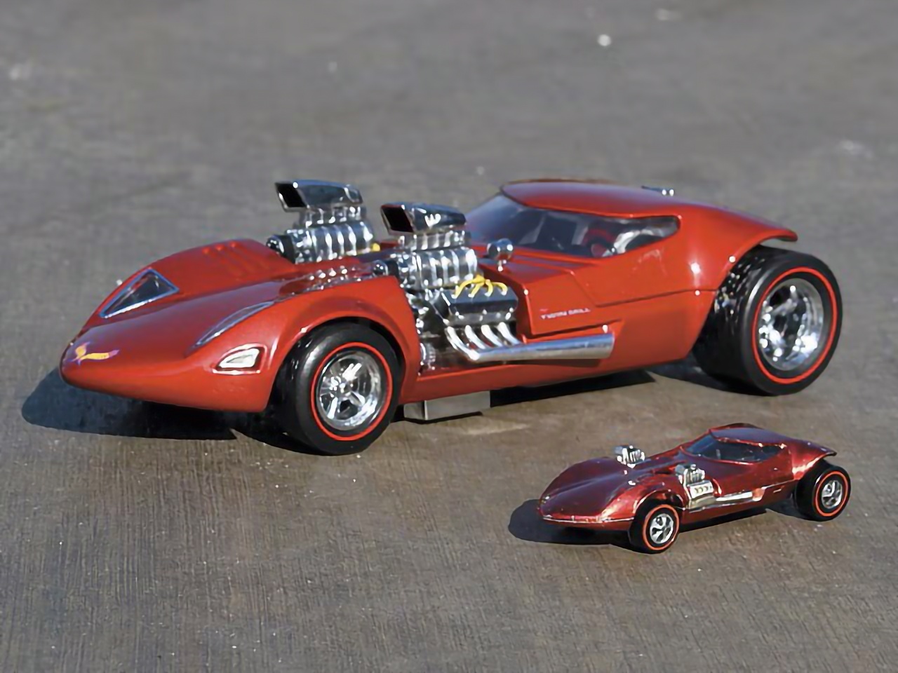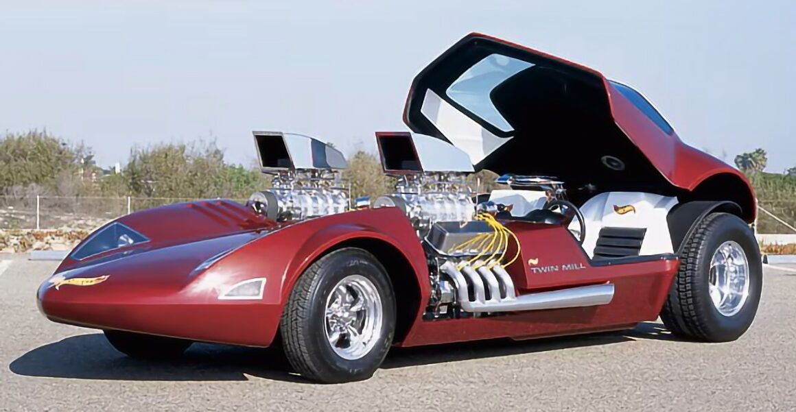 Ira Gilford a déclaré que sa version initiale avait des V-8 génériques avec des compresseurs 6-71 et des injecteur anti-bogues, et non les écopes géantes vues sur la version 1:1. Introduit dans la gamme Hot Wheels en 1969, il s’agissait du premier Hot Wheels personnalisé conçu en interne. À ce jour, quelque 12 millions d’exemplaires (je répète le chiffre magique : 12.000.000 de $) en ont été produits. Pour les collectionneurs avides de Hot Wheels, une Twin Mill au 1/64ième originale à l’état neuf et dans l’emballage pouvait coûter jusqu’à 800 $ (1.500 actuellement). Puis, à la surprise générale le créatif est décédé… S’est ajouté une affaire de droits d’auteur inextricable. Comme il allait être difficile de prouver la propriété du projet non enregistré, tout a été emporté le matin…