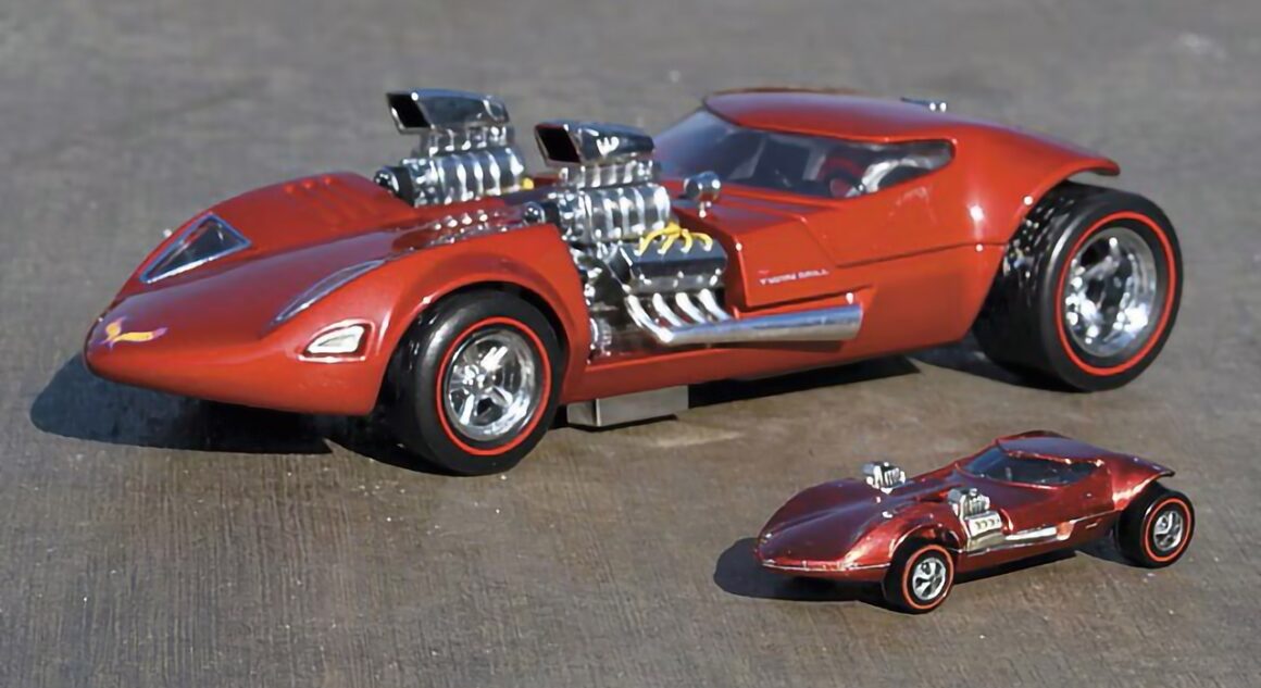 Le concepteur en chef de longue date de Hot Wheels, Larry Wood, est diplômé de ce Centre d’art et est un passionné de Hot Rods, il écrit et dessine pour le magazine Street Rodder de mon ami Tom McMullen (décédé il y a qqs temps) et est membre du club automobile Early Times. Entre-temps, pendant une courte période d’environ un an et demi, le concepteur de Hot Wheels était un autre diplômé du Centre d’art nommé Ira Gilford… Les premières Hot Wheels étaient des voitures de série comme les Camaro’s et les Mustang’s, avec une ressemblance occasionnelle réduite avec l’une ou l’autre voiture d’exposition personnalisée, comme la Red Baron… Mais vers 1968, Ira Gilford a reçu le feu vert pour concevoir ses propres Hot Wheels entièrement personnalisées.