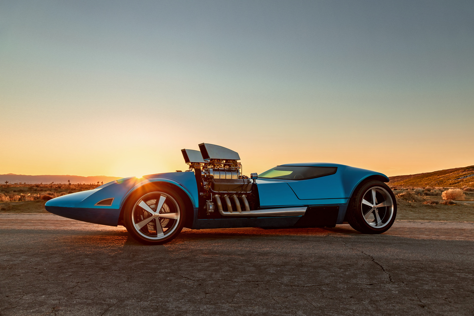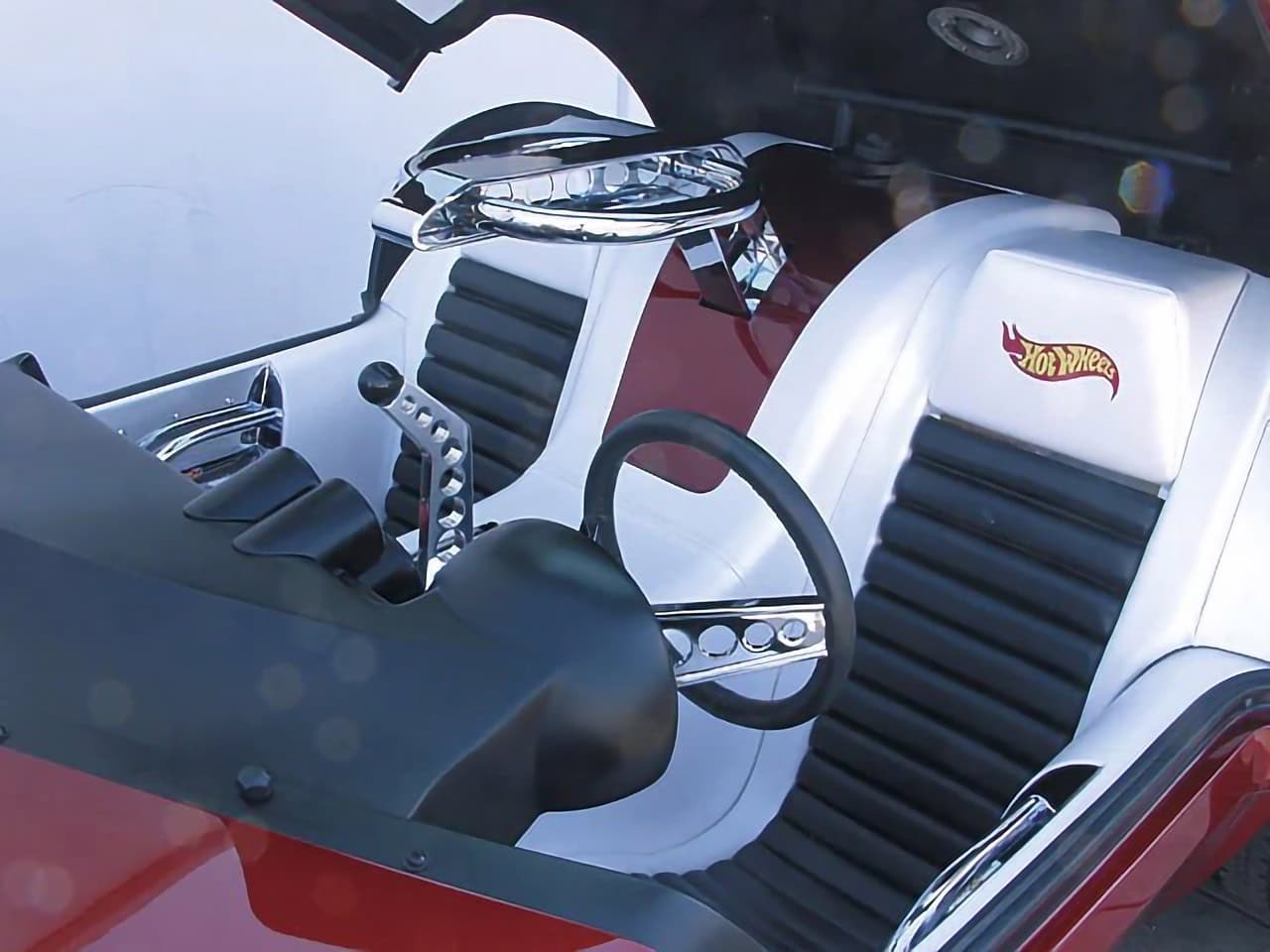 La majorité de la construction finale (y compris les deux moteurs avec compresseurs Mooneyham 8-71 502 GM Performance surmontés de carburateurs Edelbrock et une nouvelle et profonde peinture rouge flamme de chez Kolor me Kustom, judicieusement nommée Twin Mill Red)…, a été réalisée chez Carron Industries près de Dearborn. Ira Gilford était là et, pour le moins, la voiture a fait une forte impression sur la foule lorsque Dave McClelland l’a présentée. Mais ce qui est plus étonnant avec ce jouet géant, c’est que tout fonctionnait : phares, feux arrière, clignotants séquentiels et deux jeux complets de compteurs. Ça démarrait, ça s’arrêtait, ça tournait. Sauf que la couleur rouge ne transpirait pas le renouveau… On s’est alors juré de repeindre en bleu…