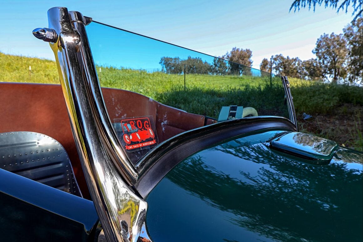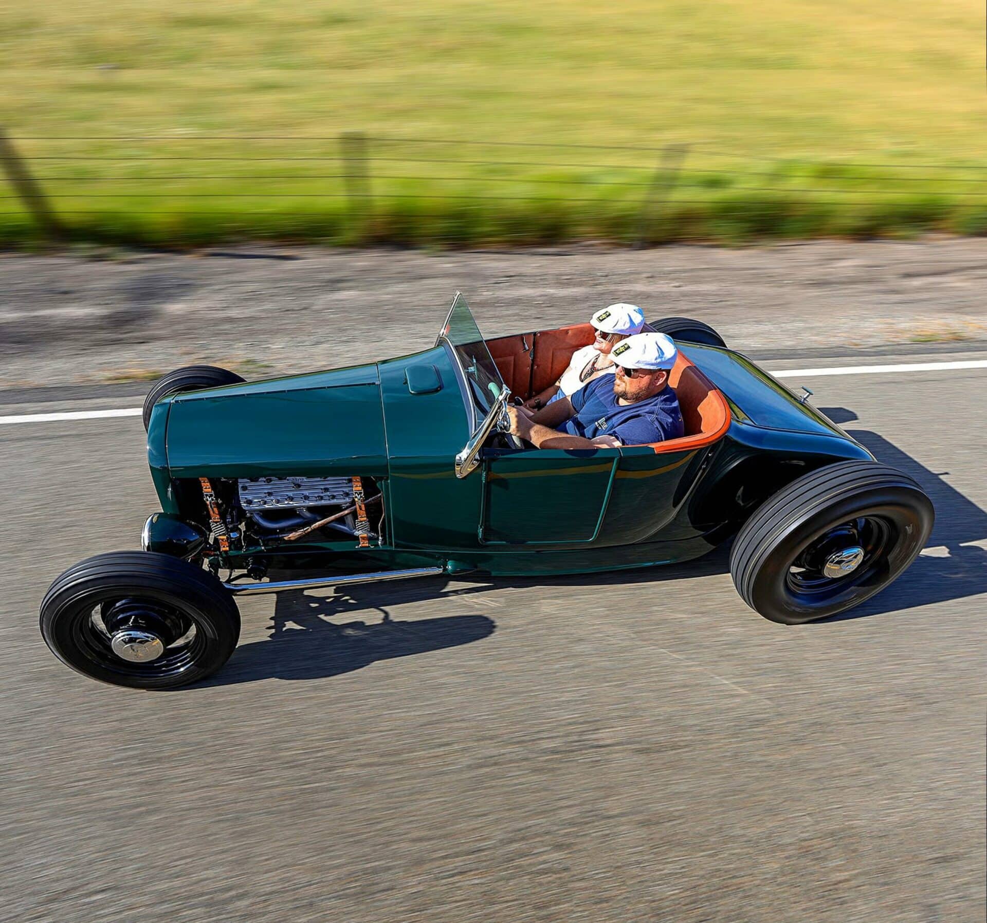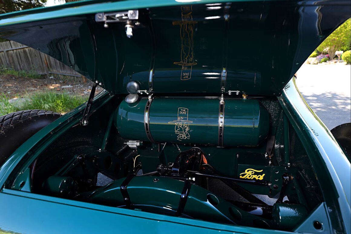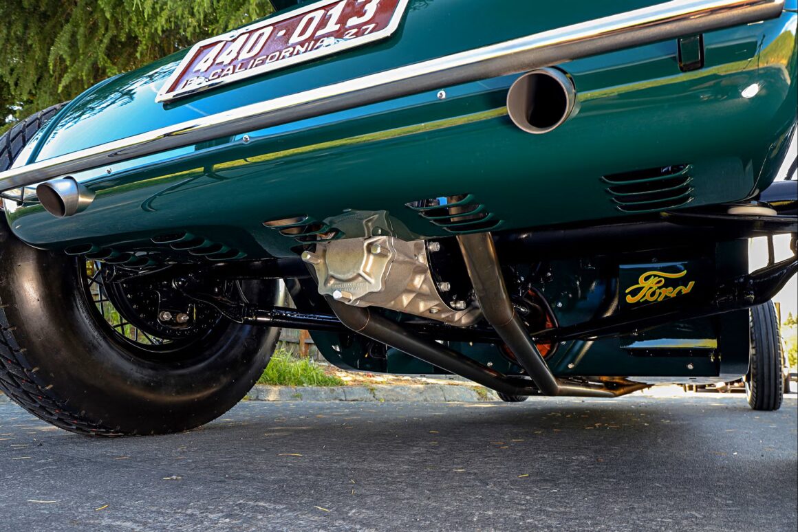 Pour ce qui concerne le Hot Rod de rêve de Tom Walsh de “NorCal”, son Hot Rod devait non seulement avoir la bonne apparence mais être suffisamment fiable pour faire le voyage depuis leur domicile jusqu’à Santa Barbara… Une épopée “gag” américaine de moins de 100kms… Mais le Hot Rod devait y arriver en utilisant des pièces entièrement adaptées de l’époque d’où venait la T… Cela signifiait qu’il n’y avait pas de trains roulants plus récents que 1953, pas de roues de moins de 15 pouces de diamètre et pas d’équipements modernes, tels que des freins à disque et autres. À l’exception du moteur, un V8 Flathead (à tête plate) construit vers 1947 par Ron Sterbenk, le châssis dans son intégralité est donc totalement antérieur à 1940, ce qui apparait stupide…
