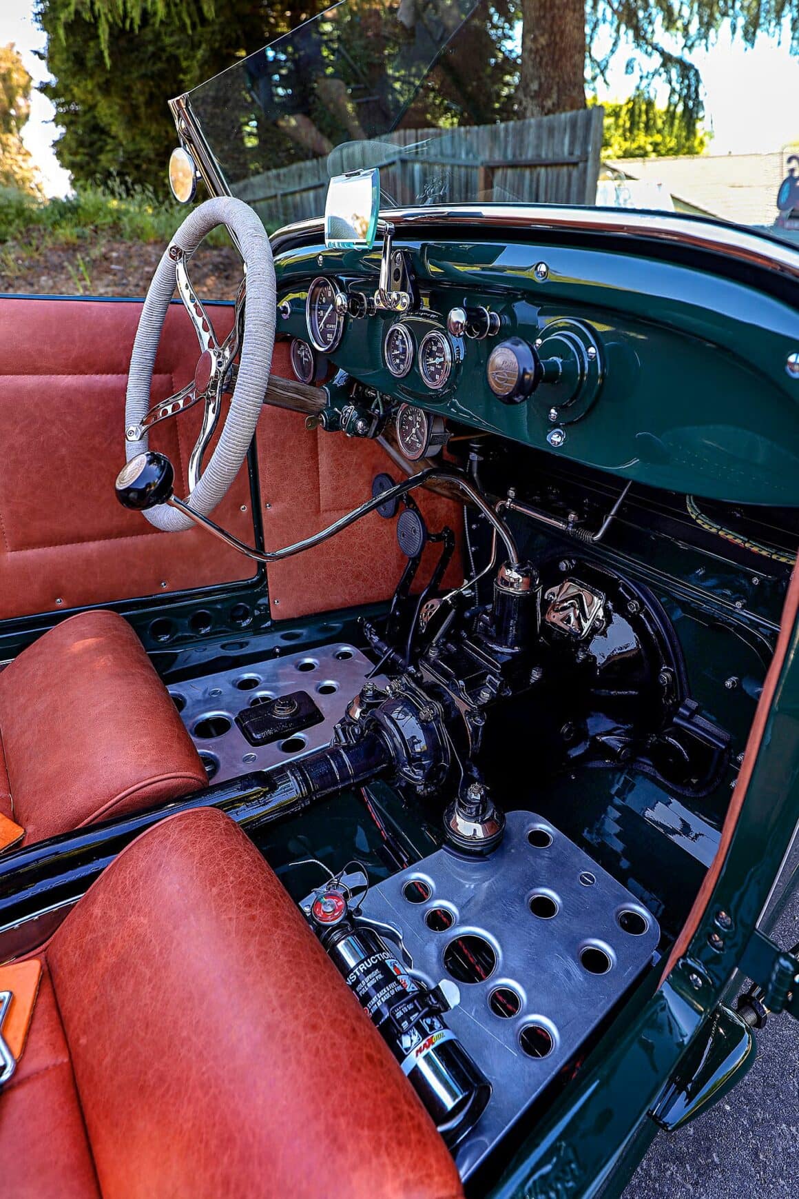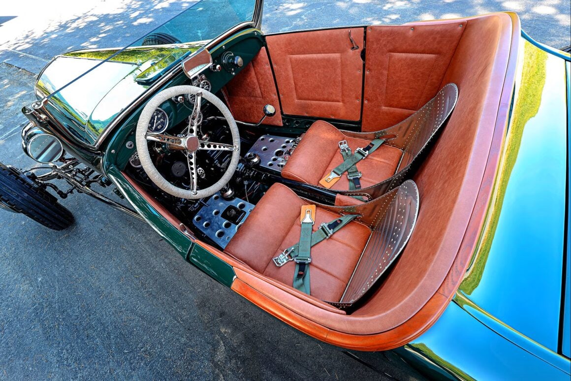 Voilà, j’arrive au bout et j’en suis aise… L’intérieur est ce que l’on attend de Sid Chavers (pour autant que vous connaissez qui il est) , avec une touche traditionnelle parfaite, c’est-à-dire que Sid Chavers a recouvert l’hémisphère arrière du cockpit, les bases des sièges (provenant d’un bombardier) et les panneaux de porte en cuir marron, tandis que le sol a été recouvert d’un panneau d’aluminium à fossettes plutôt contrasté. Les compteurs sont des Stewart-Warner, le volant est un authentique modèle T retourné. Avec tout ce qu’il faut, Tim, Justin et Cindy Walsh ont réussi à faire leur “trek” et retour prévu pour assister à l’entièreté de la course de plage : “The Race of Gentleman”, dans le plus pur style traditionnel (familial) ! Voilà… Terminé… Bye… Au plaisir… Salut…