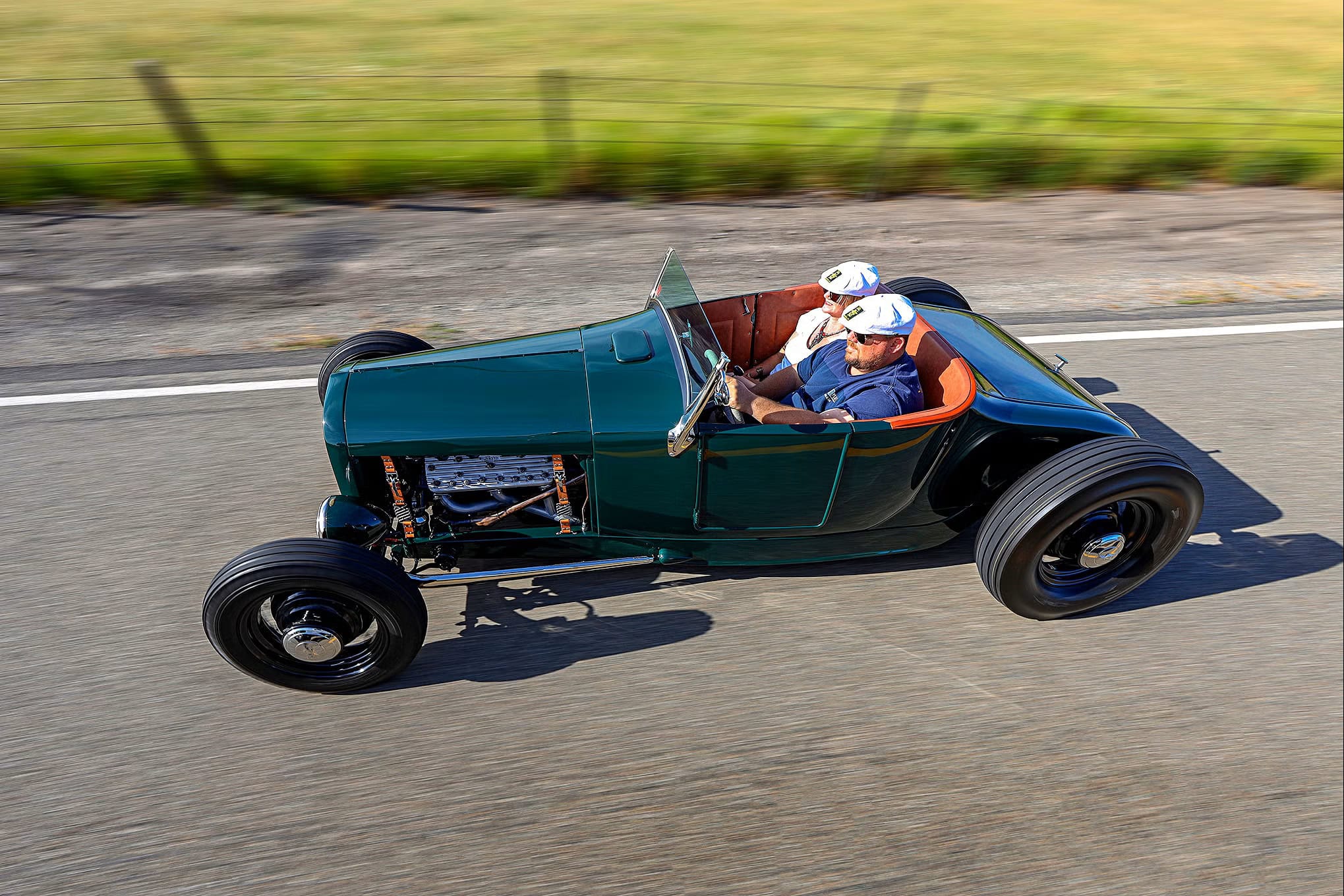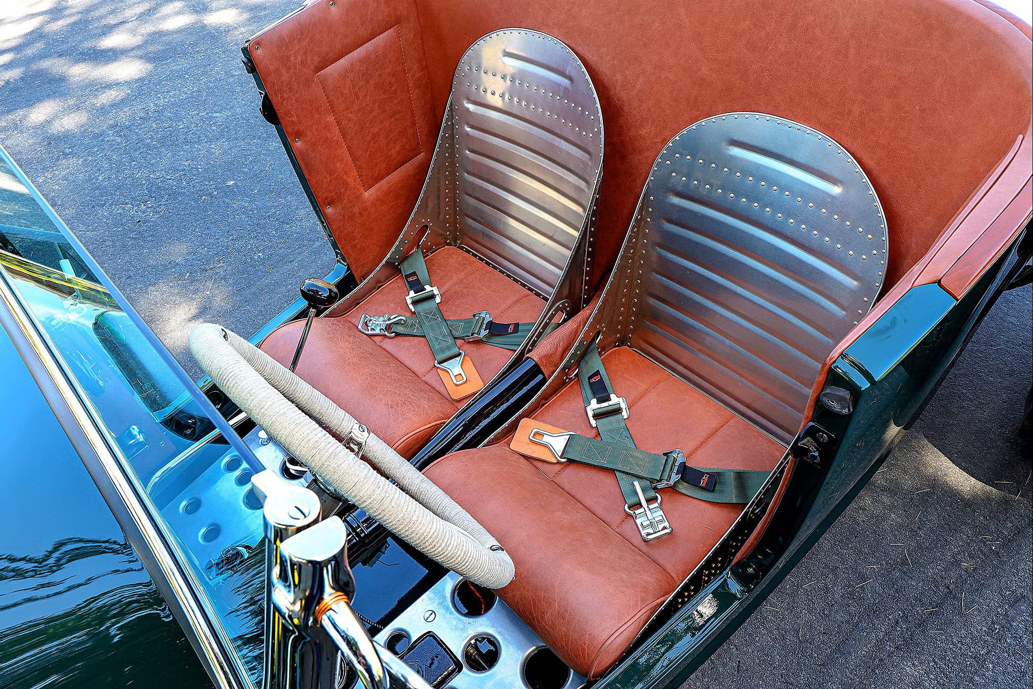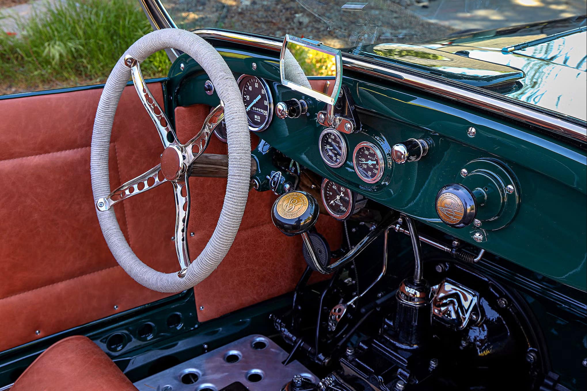 Voilà, j’arrive au bout et j’en suis aise… L’intérieur est ce que l’on attend de Sid Chavers (pour autant que vous connaissez qui il est) , avec une touche traditionnelle parfaite, c’est-à-dire que Sid Chavers a recouvert l’hémisphère arrière du cockpit, les bases des sièges (provenant d’un bombardier) et les panneaux de porte en cuir marron, tandis que le sol a été recouvert d’un panneau d’aluminium à fossettes plutôt contrasté. Les compteurs sont des Stewart-Warner, le volant est un authentique modèle T retourné. Avec tout ce qu’il faut, Tim, Justin et Cindy Walsh ont réussi à faire leur “trek” et retour prévu pour assister à l’entièreté de la course de plage : “The Race of Gentleman”, dans le plus pur style traditionnel (familial) ! Voilà… Terminé… Bye… Au plaisir… Salut…