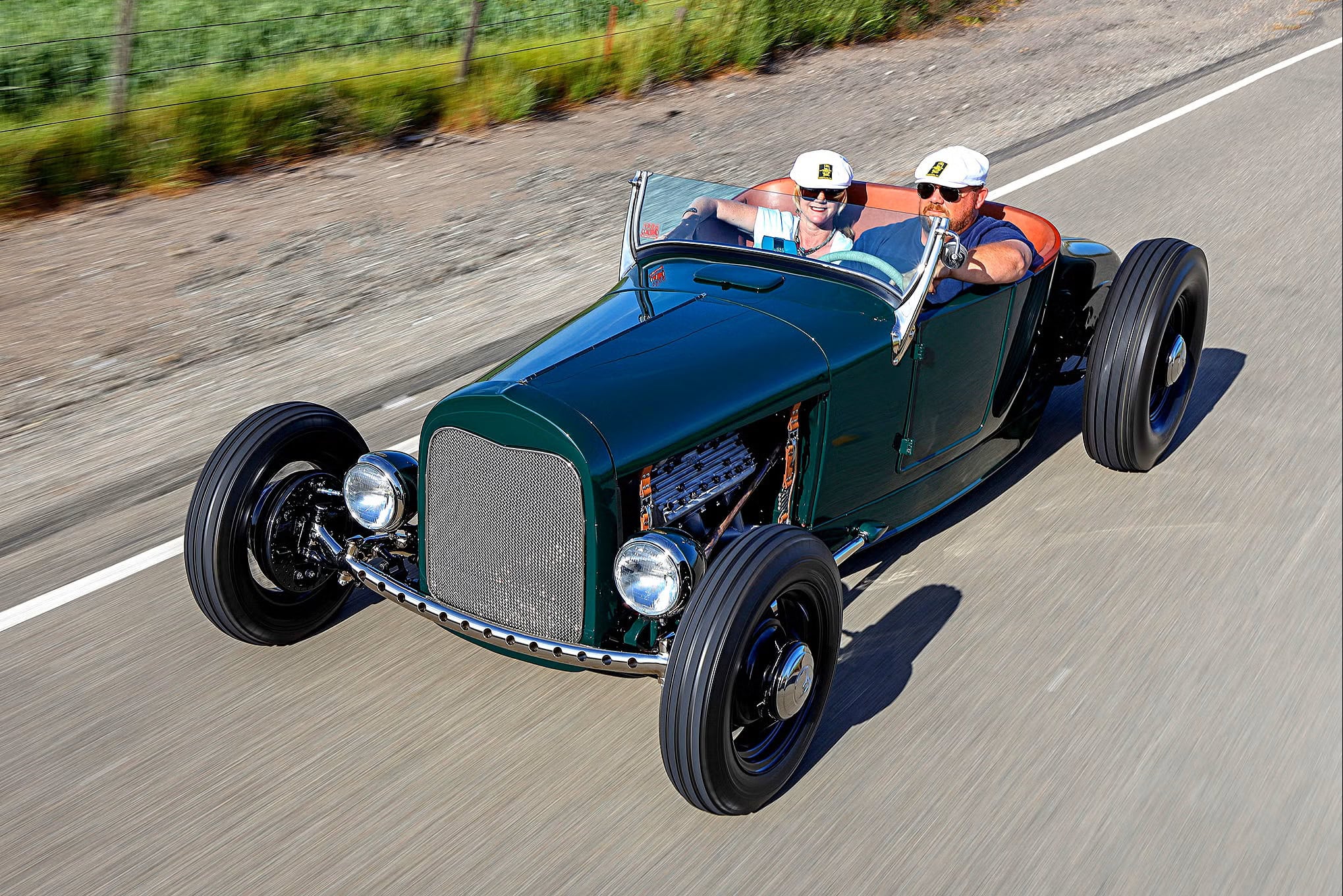 Quoiqu’il en soit et en coûte, Tom Walsh à utilisé un essieu Ford V8-60 de 1937 percé et à ressorts Deuce avec un châssis plate-forme 109po comprenant des freins Ford 1940, une direction, des triangles fendus, un chargement par le haut de 1939 et un Pont/Différentiel/Banjo de 1940 équipé de jantes Halibrand imitant les jantes à rayons Ford 1935 de 16 pouces portant des pneus à plis diagonaux Firestone Deluxe Champion de taille 500&890… Waouhh ! C’est la première fois qu’un guide de compréhension expliquant le “pourquoi du comment” a été édité en photocopies… La carrosserie du Hot Roadster, achetée à la fin des années ’90 à un dénommé Jim Stroupe a été comme ressuscitée par Jim Hendricks et Guy Ruchonnet, des carrossiers/garagistes.