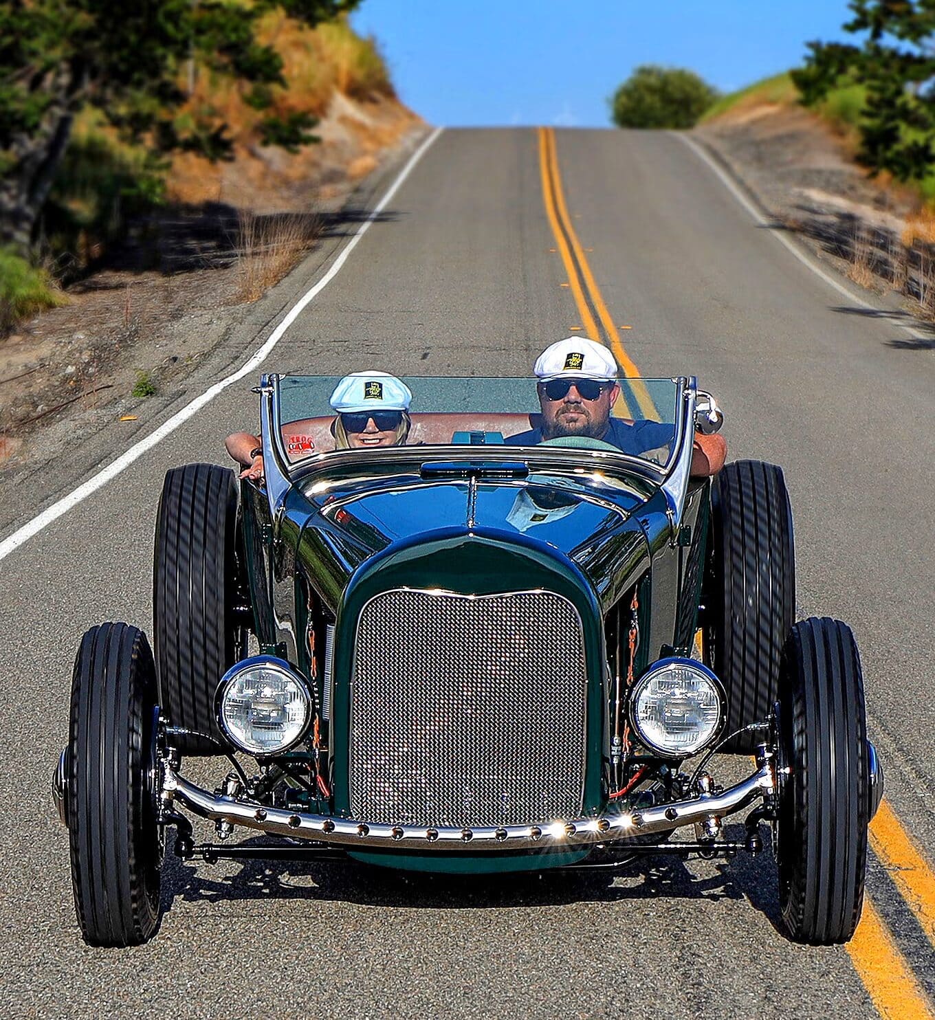 Pour ce qui concerne le Hot Rod de rêve de Tom Walsh de “NorCal”, son Hot Rod devait non seulement avoir la bonne apparence mais être suffisamment fiable pour faire le voyage depuis leur domicile jusqu’à Santa Barbara… Une épopée “gag” américaine de moins de 100kms… Mais le Hot Rod devait y arriver en utilisant des pièces entièrement adaptées de l’époque d’où venait la T… Cela signifiait qu’il n’y avait pas de trains roulants plus récents que 1953, pas de roues de moins de 15 pouces de diamètre et pas d’équipements modernes, tels que des freins à disque et autres. À l’exception du moteur, un V8 Flathead (à tête plate) construit vers 1947 par Ron Sterbenk, le châssis dans son intégralité est donc totalement antérieur à 1940, ce qui apparait stupide…