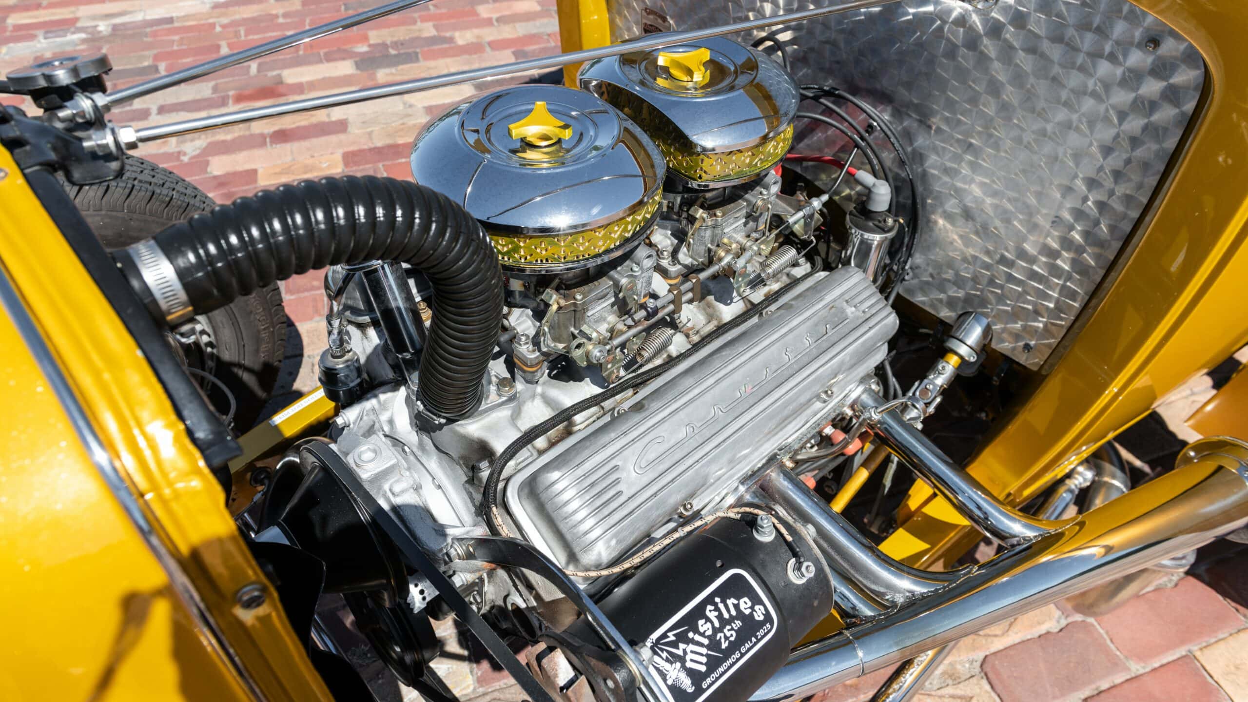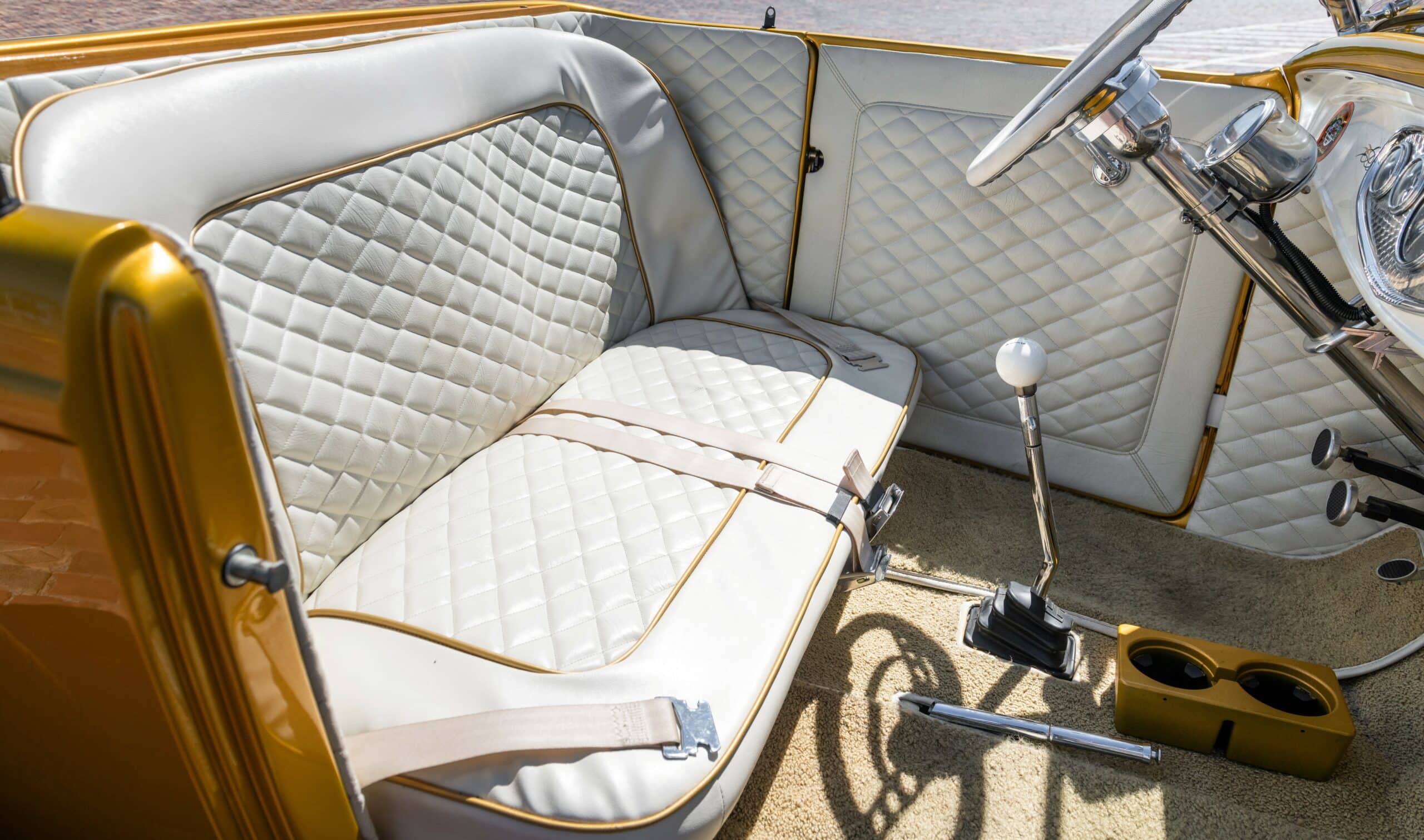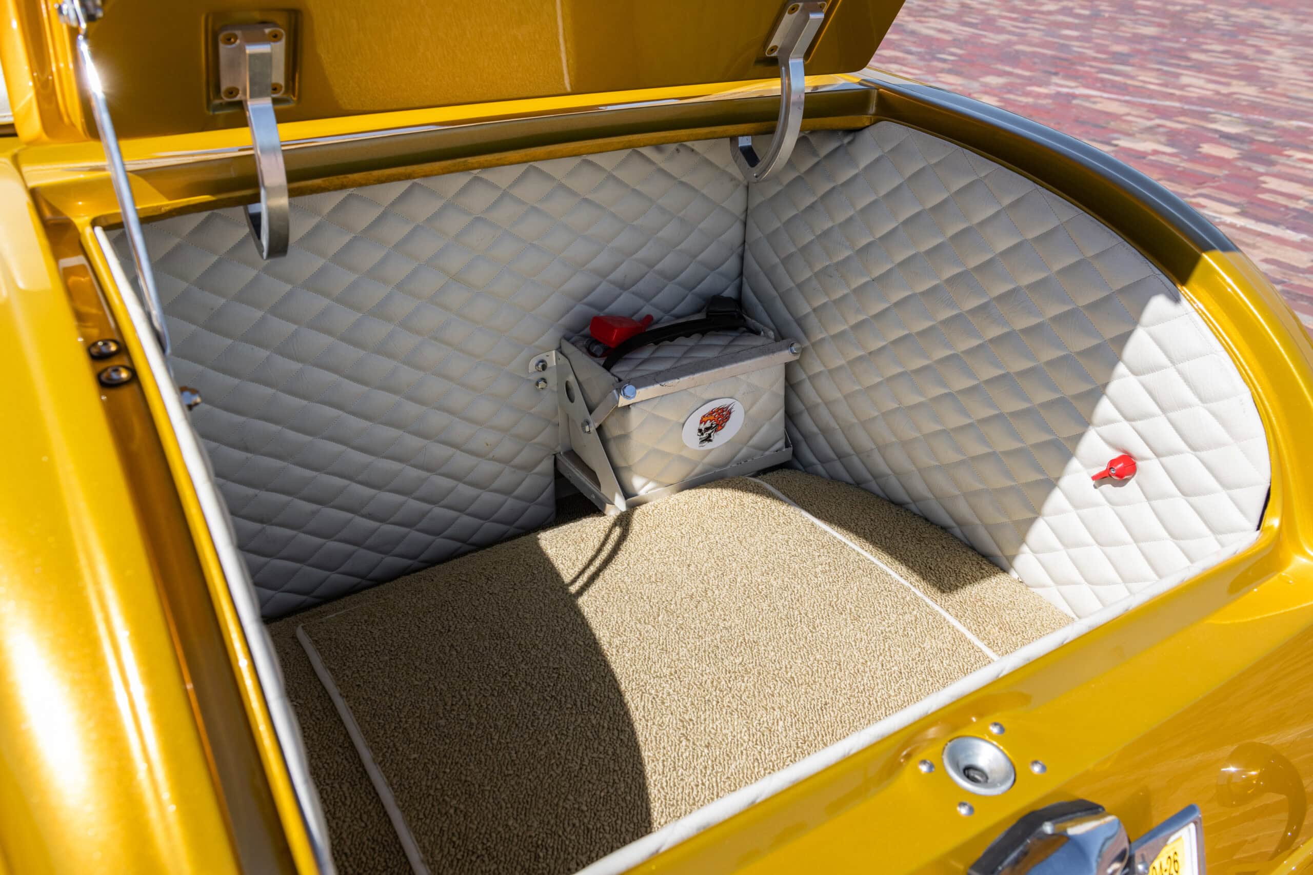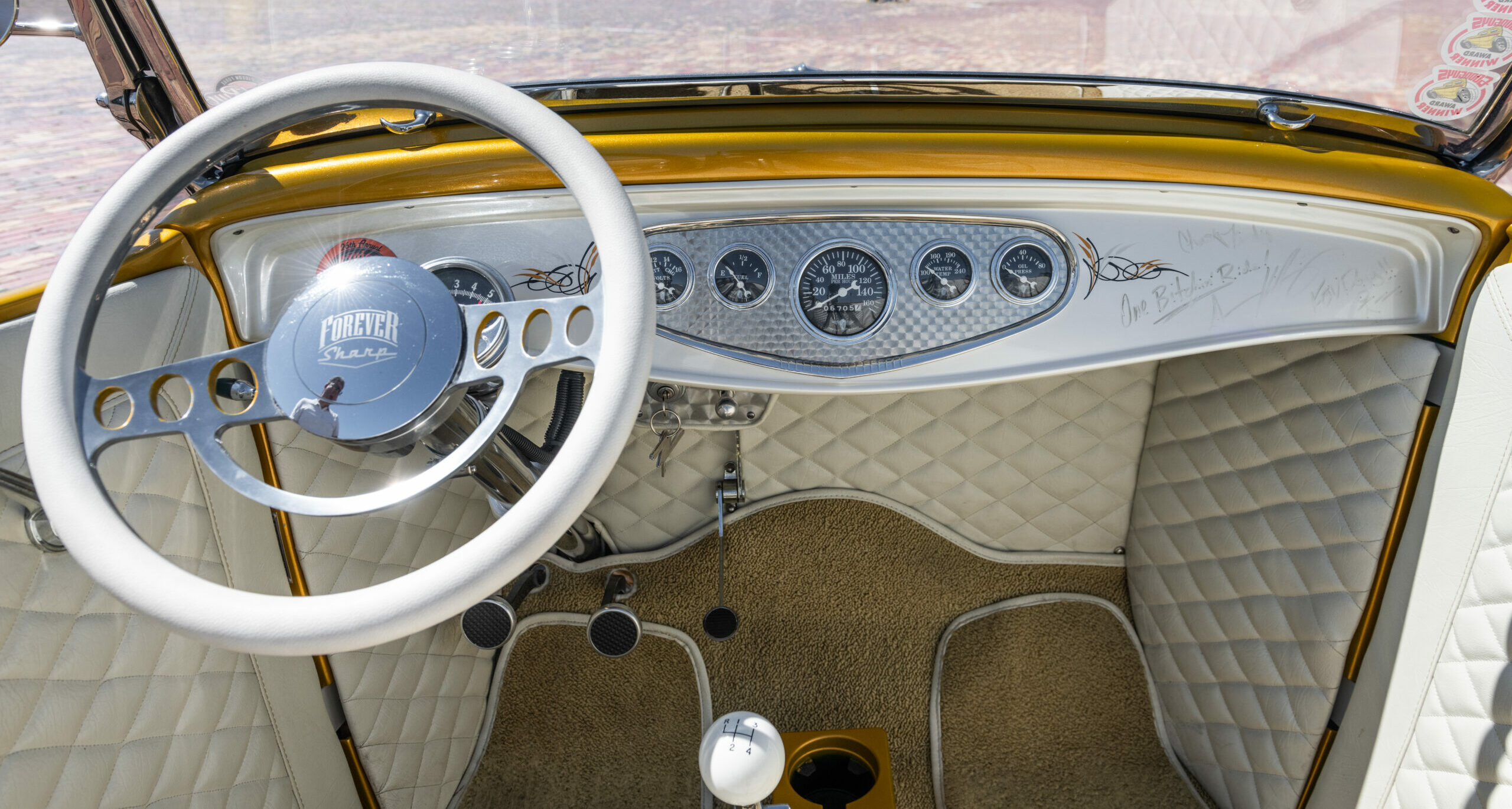 C’est pour vous donner à penser : “Waouuuuuhhh, la peinture et les jantes de style vintage combinées aux larges pneus à flancs blancs sont saisissantes !”. Ce Hot Rod Ford 1932 est motorisé d’un V8 de 283ci (4,6 litres) à double carburateur quadruple corps. Ils sont couplés à une boîte de vitesses manuelle Saginaw T-10 à quatre rapports… Arborant une peinture métallisée “House of Kolor Solar Gold”, une capote “Sid Chavers” blanche nacrée et un intérieur en vinyle marin blanc et or, ce Hot Roadster Custom primé de nombreux premiers prix avec Coupes en fer-blanc et moches trophées en terre cuite…En écoutant les récents discours de Trump, on ne peut s’empêcher de penser que cet engin se trouve dans une “réalité parallèle”…