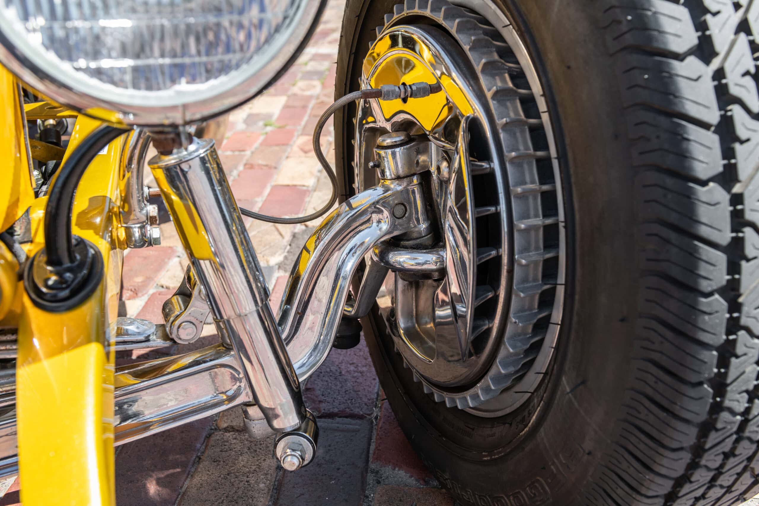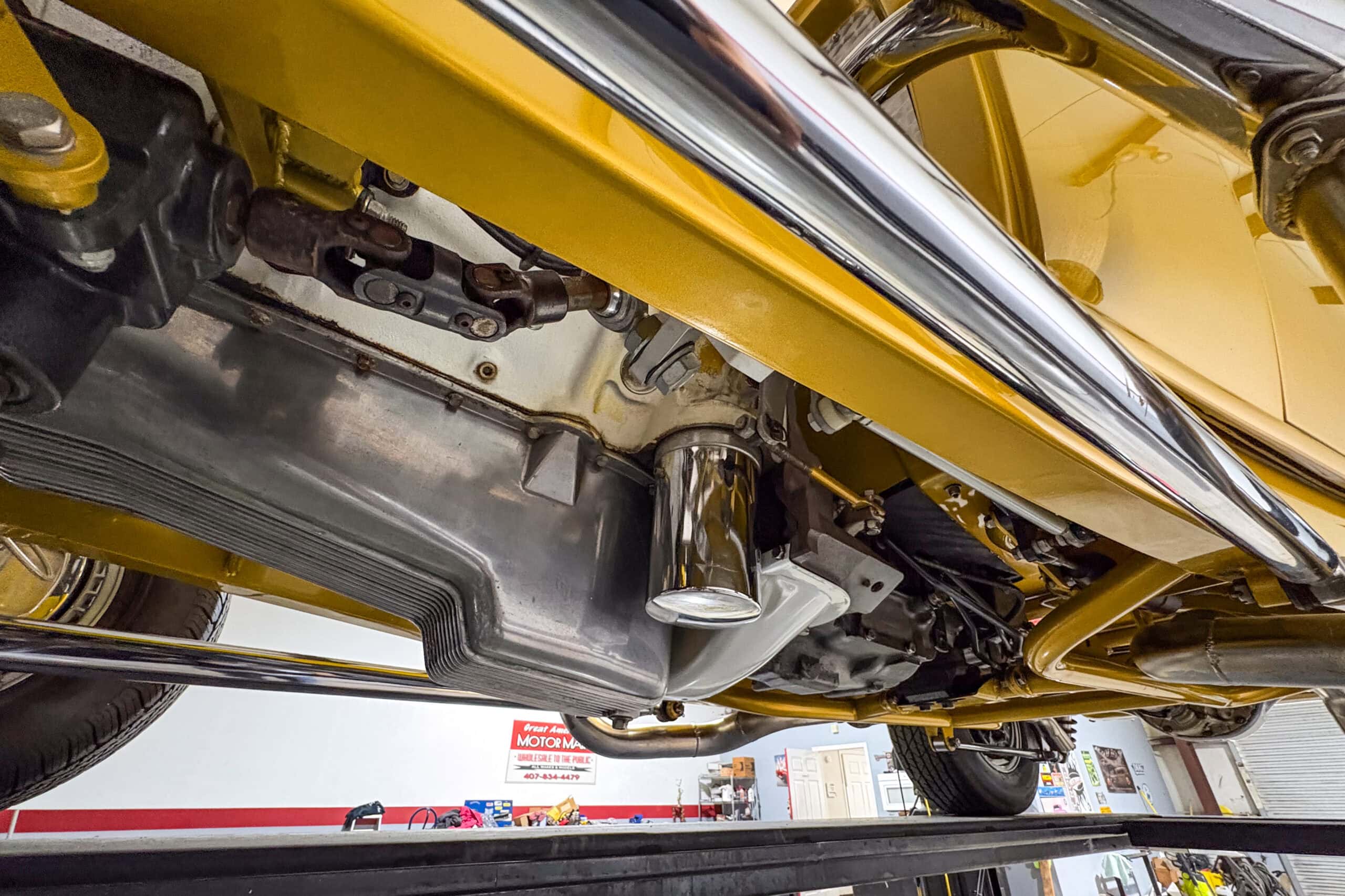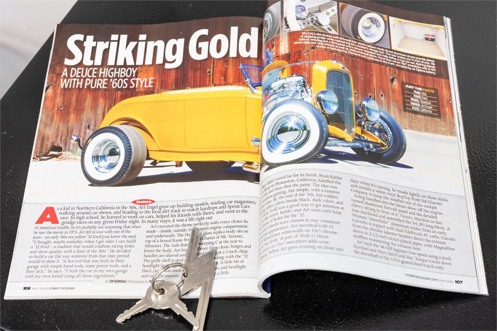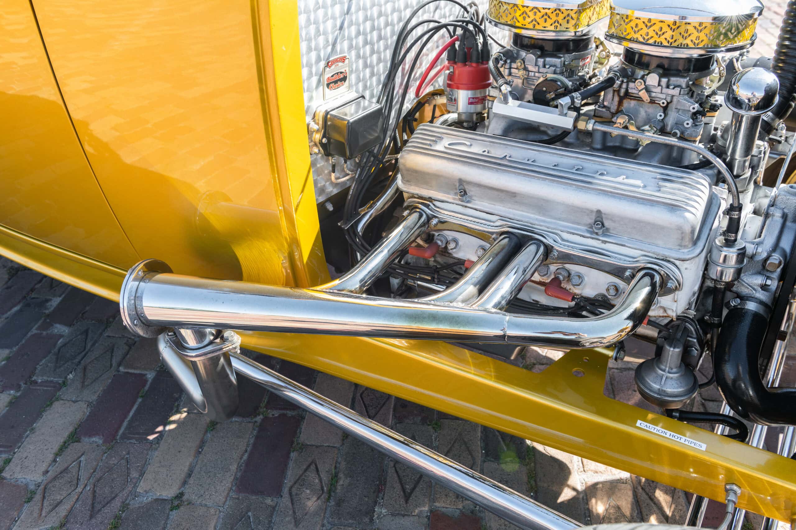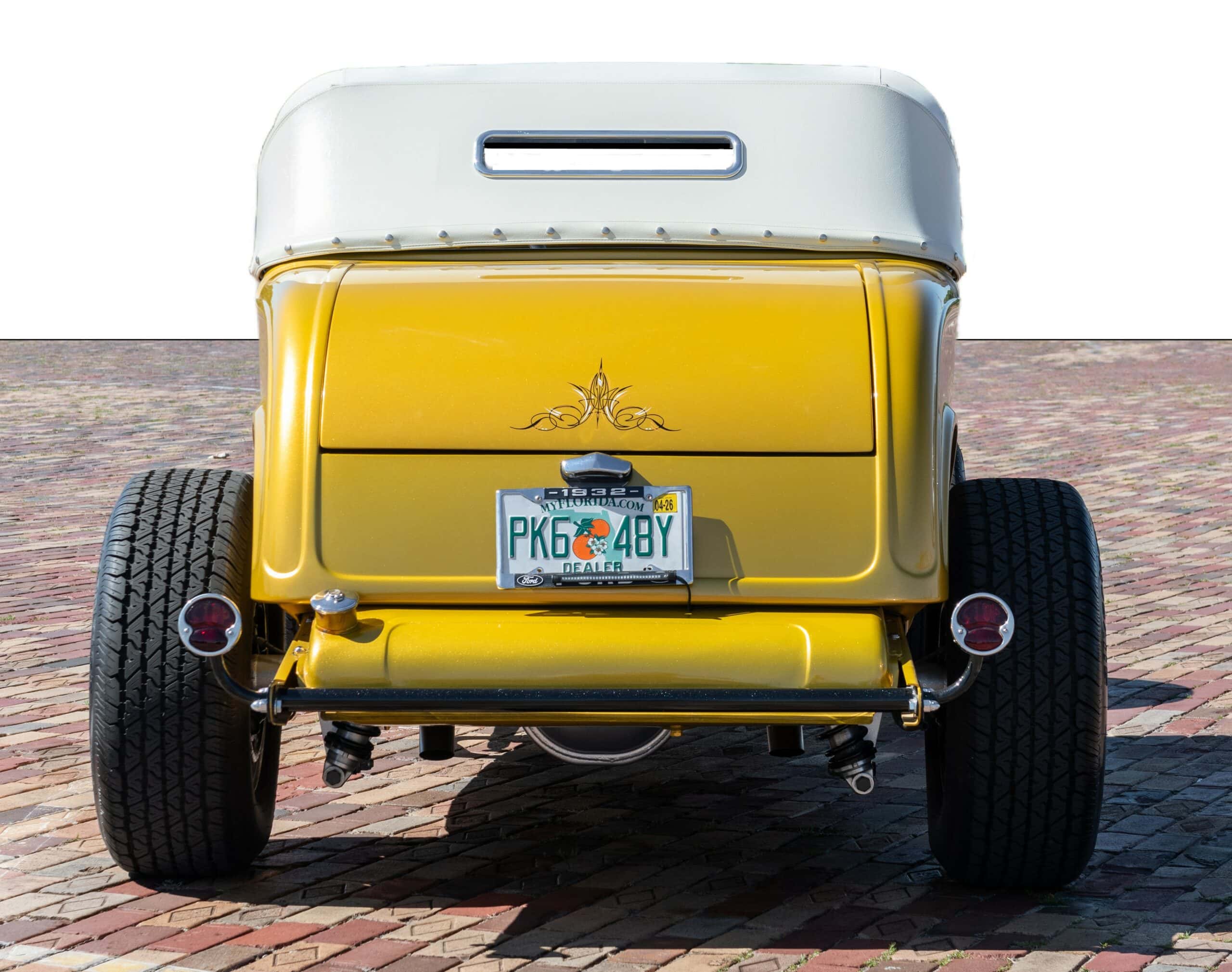 C’est pour vous donner à penser : “Waouuuuuhhh, la peinture et les jantes de style vintage combinées aux larges pneus à flancs blancs sont saisissantes !”. Ce Hot Rod Ford 1932 est motorisé d’un V8 de 283ci (4,6 litres) à double carburateur quadruple corps. Ils sont couplés à une boîte de vitesses manuelle Saginaw T-10 à quatre rapports… Arborant une peinture métallisée “House of Kolor Solar Gold”, une capote “Sid Chavers” blanche nacrée et un intérieur en vinyle marin blanc et or, ce Hot Roadster Custom primé de nombreux premiers prix avec Coupes en fer-blanc et moches trophées en terre cuite…En écoutant les récents discours de Trump, on ne peut s’empêcher de penser que cet engin se trouve dans une “réalité parallèle”…