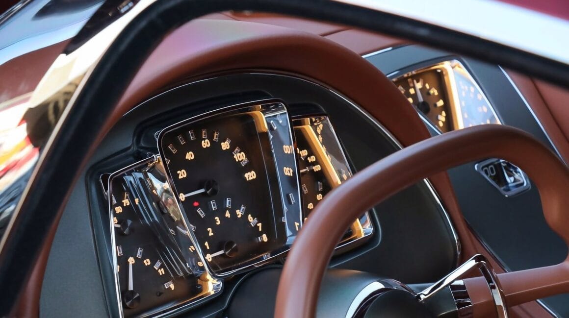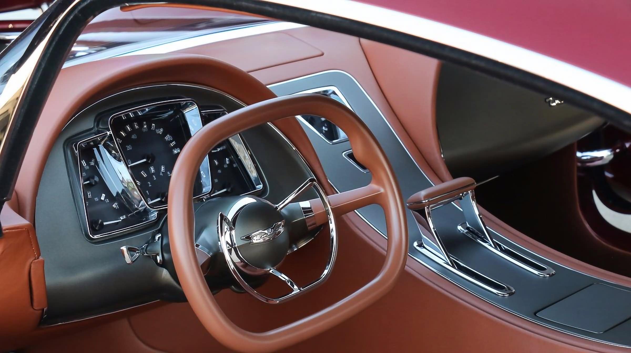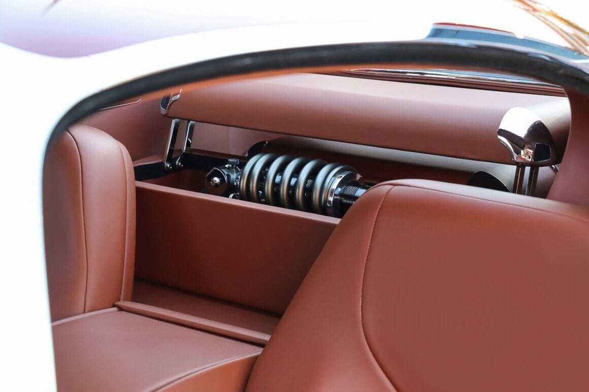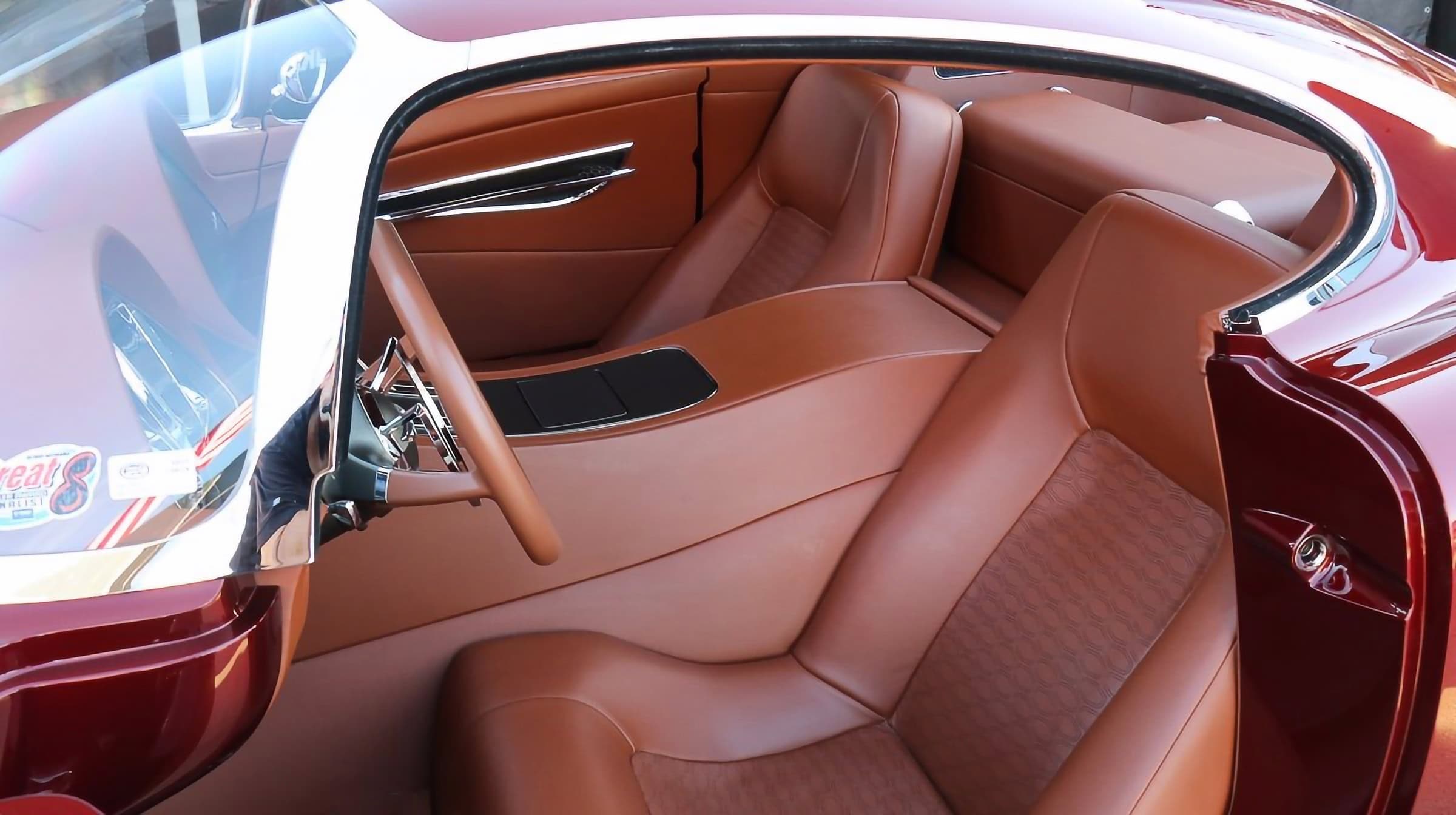 Il est de la gamme de peintures de la novelle société : “Modern Classikk Kindig Akzo Nobel”. Il y a tout autant à l’intérieur, où le tableau de bord, la console, les sièges personnalisés et autres sont imprimés en 3D puis ont été recouverts d’un cuir “terre de Sienne” par “JS Custom Interiors”. Les compteurs personnalisées intègrent de l’or blanc et des diamants dans le lettrage, tandis que le volant unique s’incline vers le haut pour faciliter l’entrée et la sortie. Un levier de vitesses de style avion s’élève de la console centrale, tandis que les tapis de sol ont été usinés en aluminium, poncés, peints en noir, garnis d’acier inoxydable.