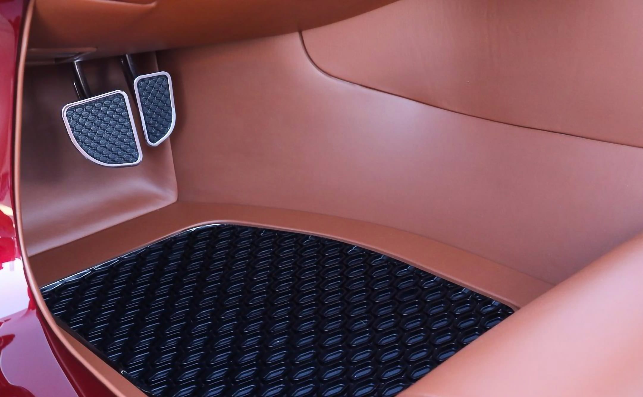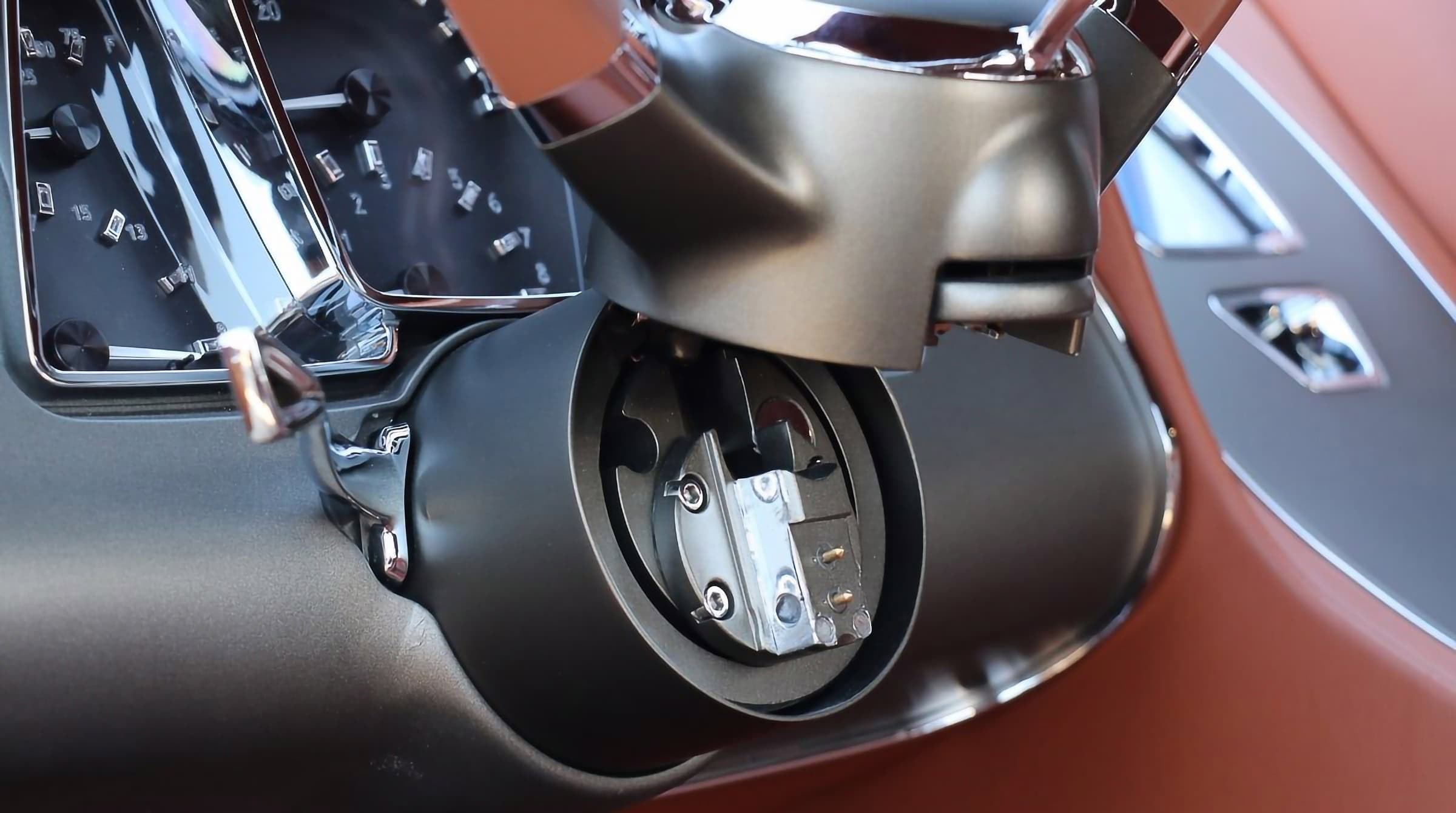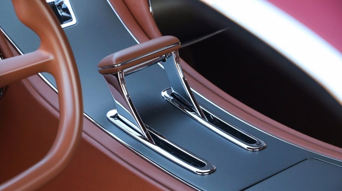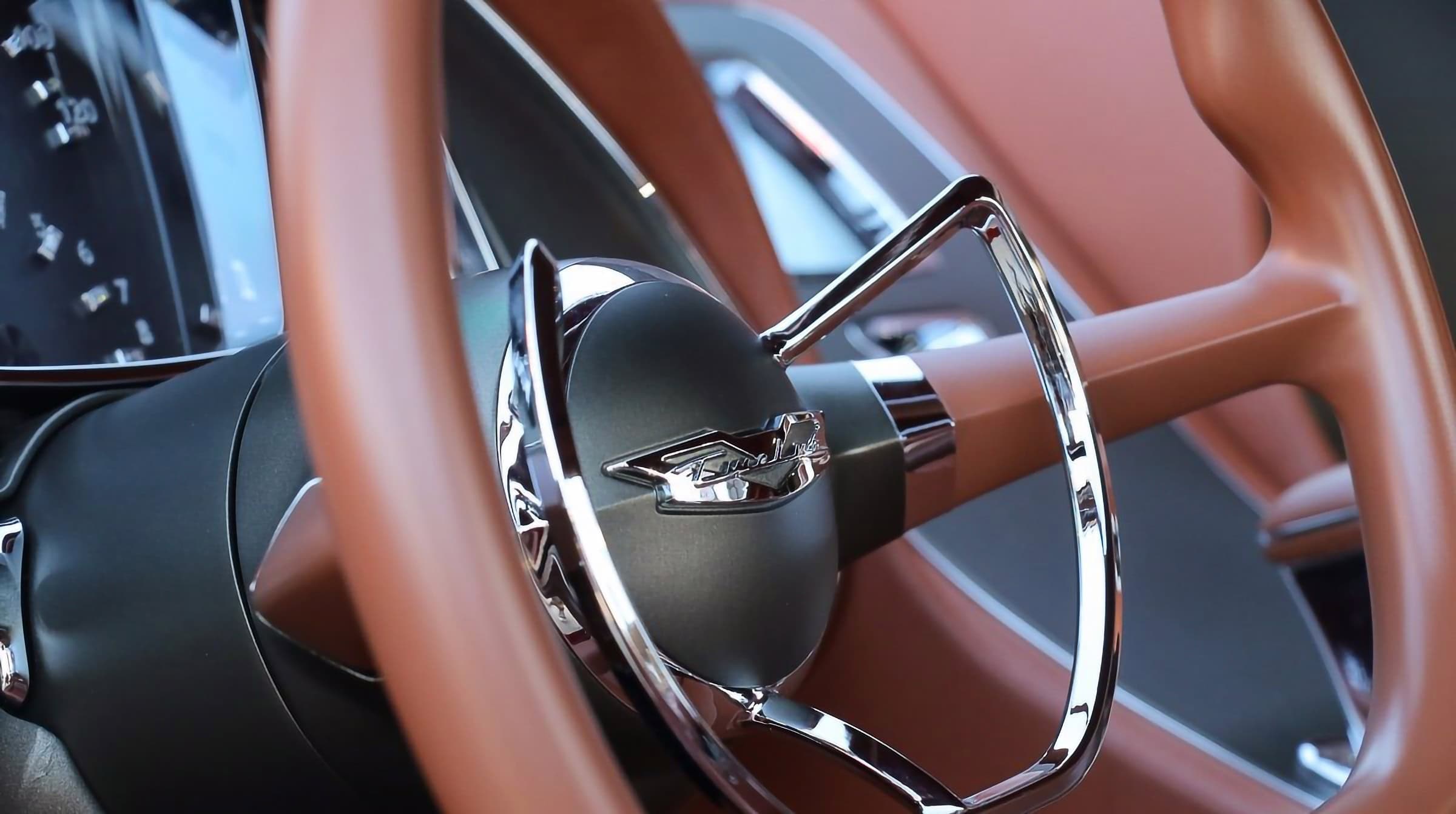 Il est de la gamme de peintures de la novelle société : “Modern Classikk Kindig Akzo Nobel”. Il y a tout autant à l’intérieur, où le tableau de bord, la console, les sièges personnalisés et autres sont imprimés en 3D puis ont été recouverts d’un cuir “terre de Sienne” par “JS Custom Interiors”. Les compteurs personnalisées intègrent de l’or blanc et des diamants dans le lettrage, tandis que le volant unique s’incline vers le haut pour faciliter l’entrée et la sortie. Un levier de vitesses de style avion s’élève de la console centrale, tandis que les tapis de sol ont été usinés en aluminium, poncés, peints en noir, garnis d’acier inoxydable.