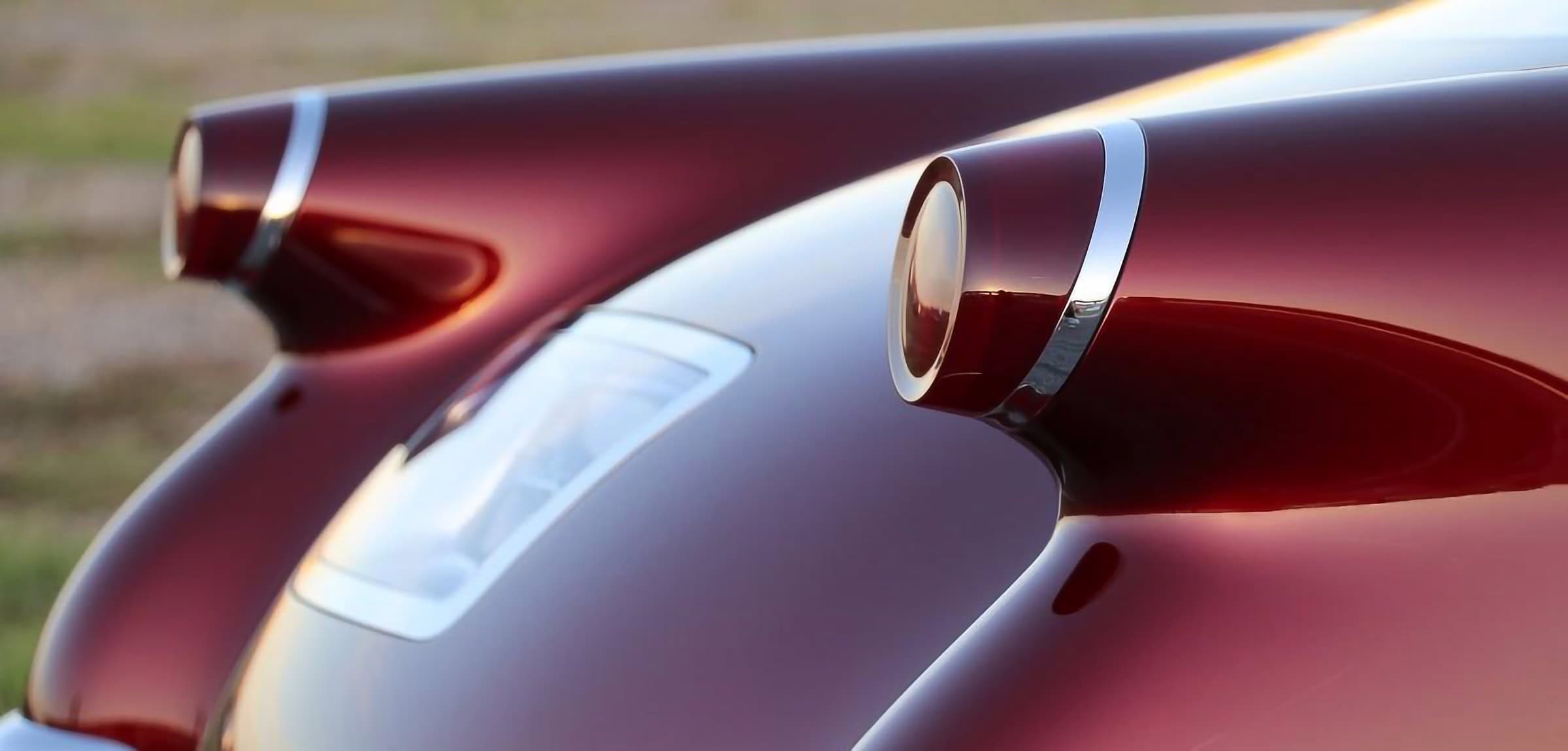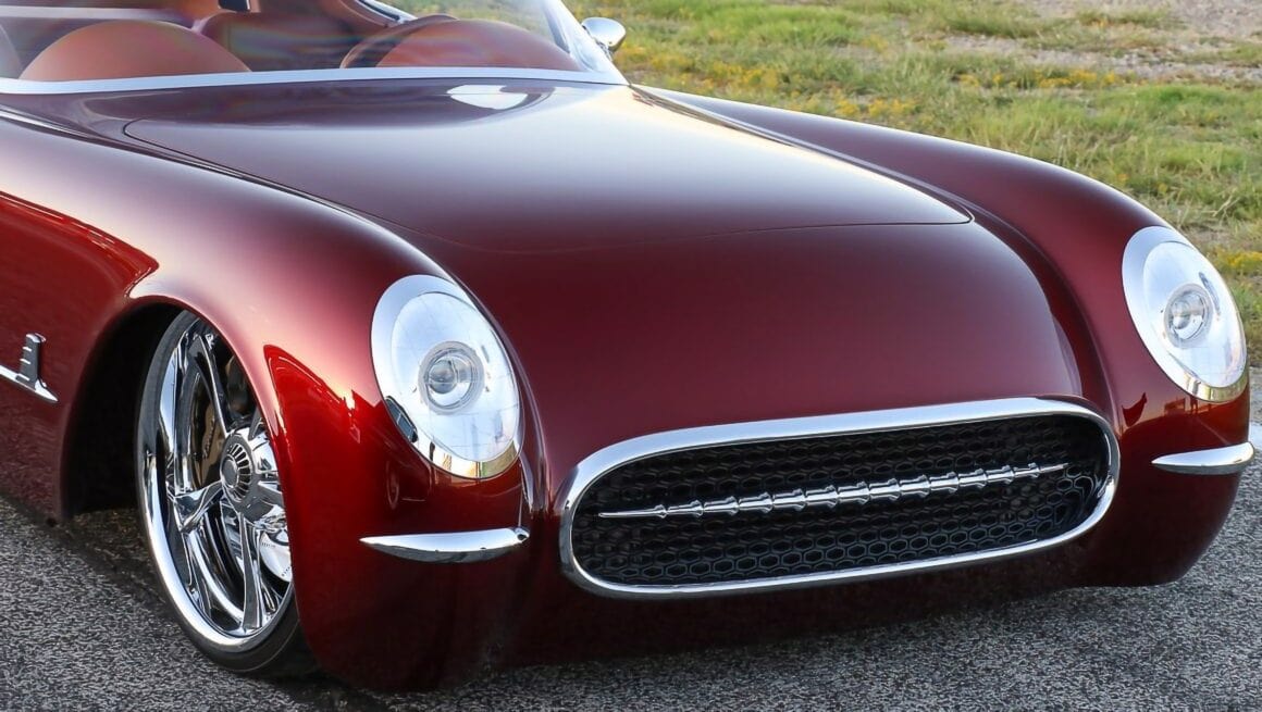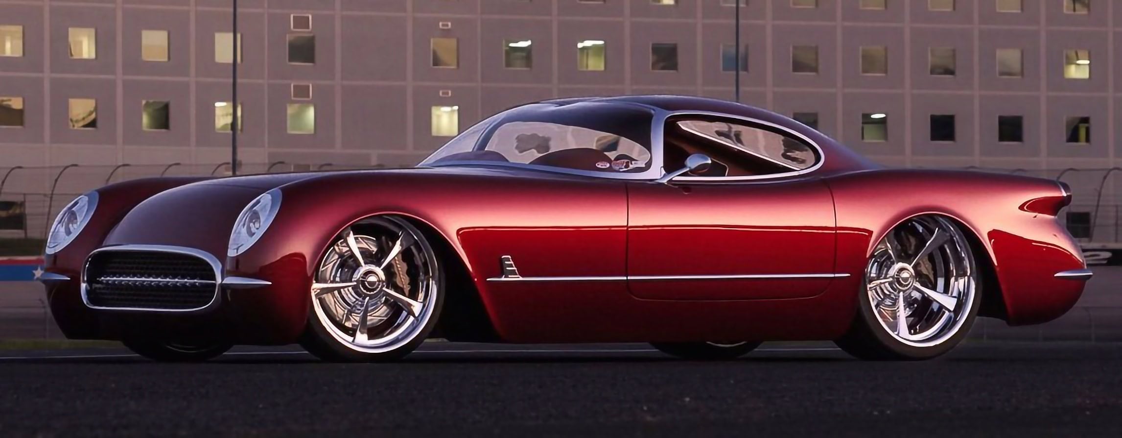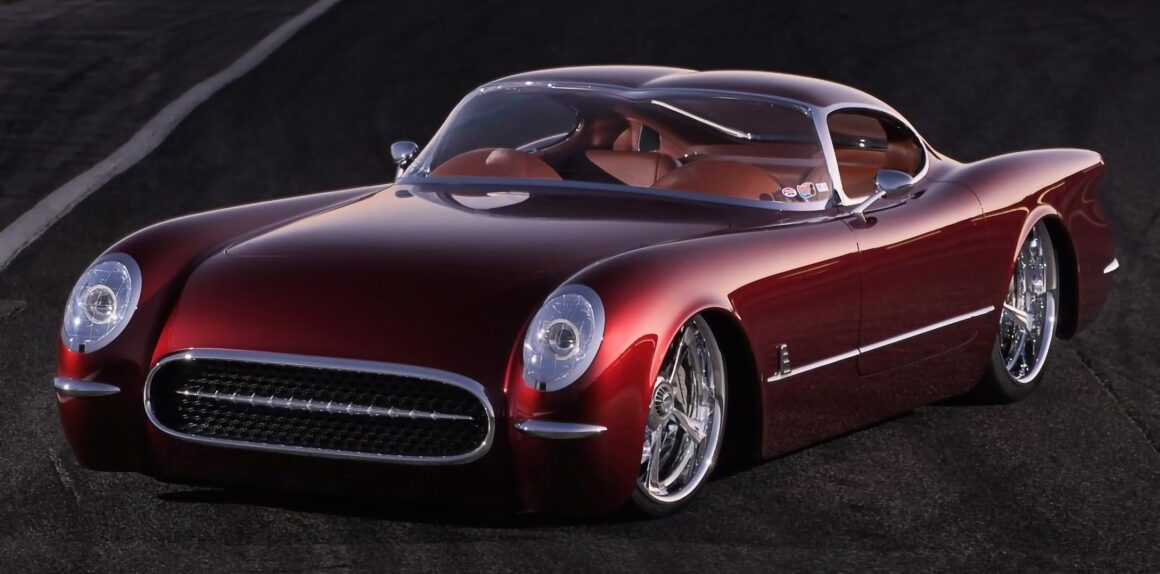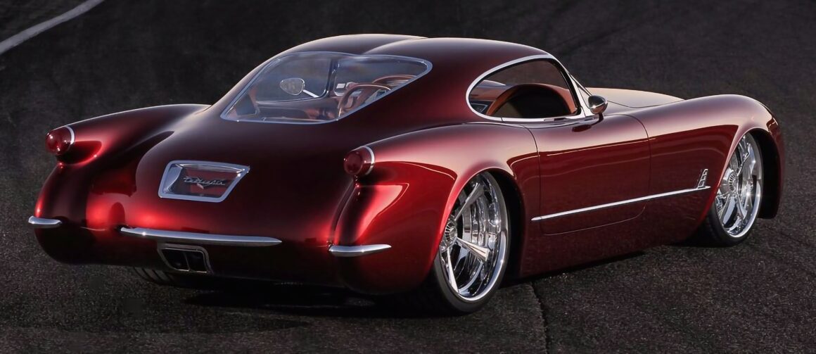 Celui de nombreuses années d’expériences de Kindig en matière de conception, de fabrication et de construction de voitures personnalisées. Il est basé sur un design prétendu vierge mais inspiré du concept-car Chevy Corvair, une version fastback de la Corvette de première génération (1953) qui n’a jamais vu le jour. Et ce, avec diverses adaptations glanées un pneu partouze telle la Volvo P1800 “Le Saint”... La version de Kindig intègre également d’autres éléments de design innovants de l’époque, comme un toit à double bulle similaire à ceux que l’on trouve sur les Ferrari vintage et autres voitures de sport italiennes.