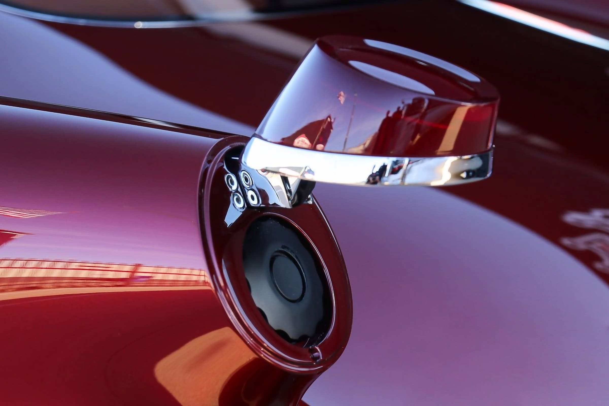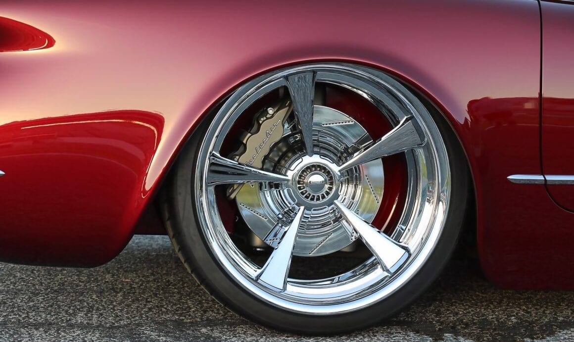 Tel un tube de torsion allongé le reliant à la boîte-pont arrière forment l’ensemble de la construction hors normes. La carrosserie façonnée à la main a été fabriquée à partir d’aluminium 3003. Pratiquement tout est unique, des pare-chocs personnalisés, de la calandre, des enjoliveurs et des garnitures de phares, aux rétroviseurs, aux lentilles et aux sorties d’échappement. Même le pare-brise et la vitre arrière ont été construits sur mesure selon les spécifications de Kindig. La carrosserie a finalement été comme baignée dans une magnifique finition rouge rubis appelée “Infrared”…