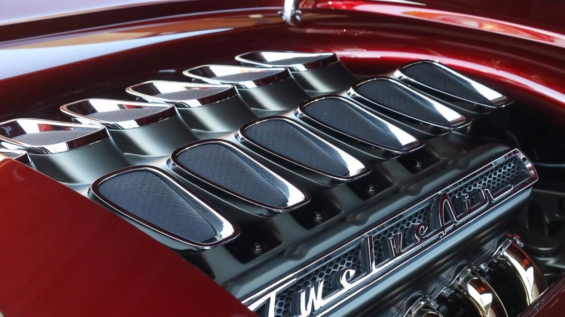 À la recherche d’un moteur aussi Flashy que le reste de la voiture, Kindig a fait travailler la société australienne “Race Cast Engineering” sur le moteur de 9,2 litres (561c.i.), un V12, qui est basé sur la plate-forme de moteur GM LS. Le moteur est capable de 1.000 chevaux, mais a été réglé à environ 650cv, ce qui est plus que suffisant partir dans l’espace tout en restant prudent. Il est tellement beau qu’il ne fonctionne que très exceptionnelement. L’admission est visuellement élégante, les cache-soupapes sont uniques, les collecteurs en acier inoxydable personnalisés avec d’autres détails obsessionnels…