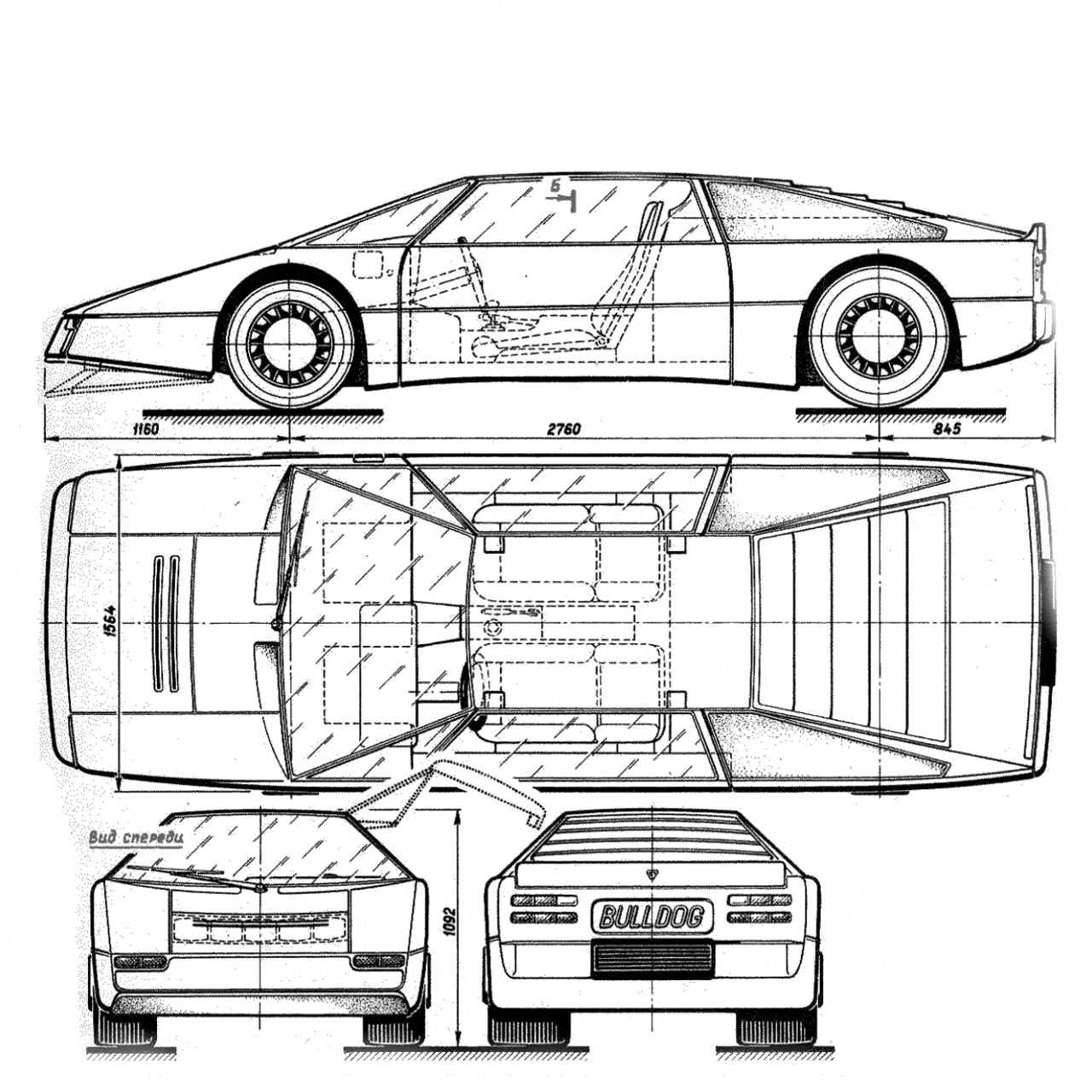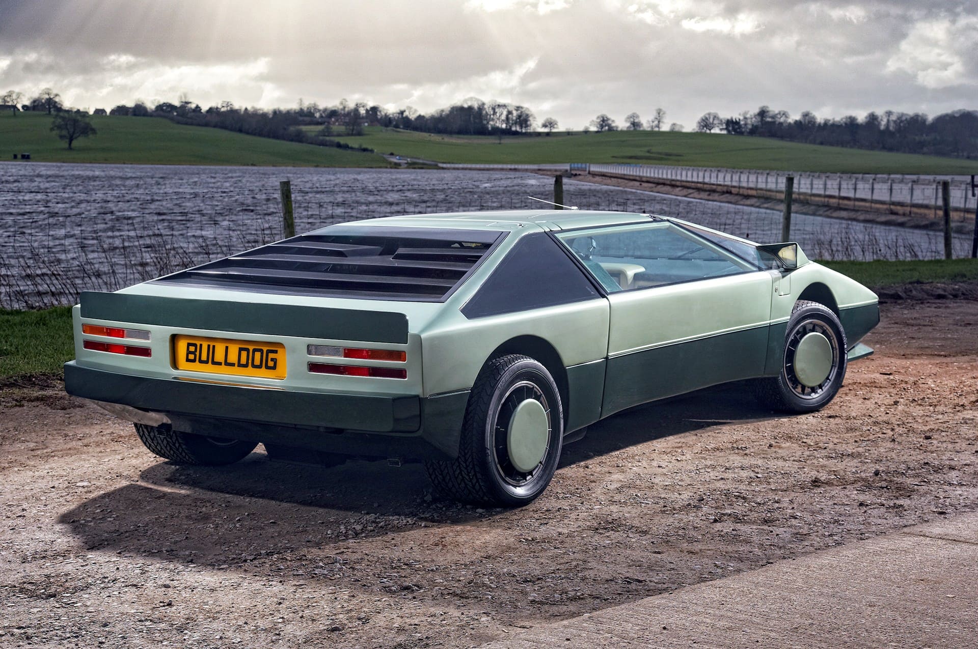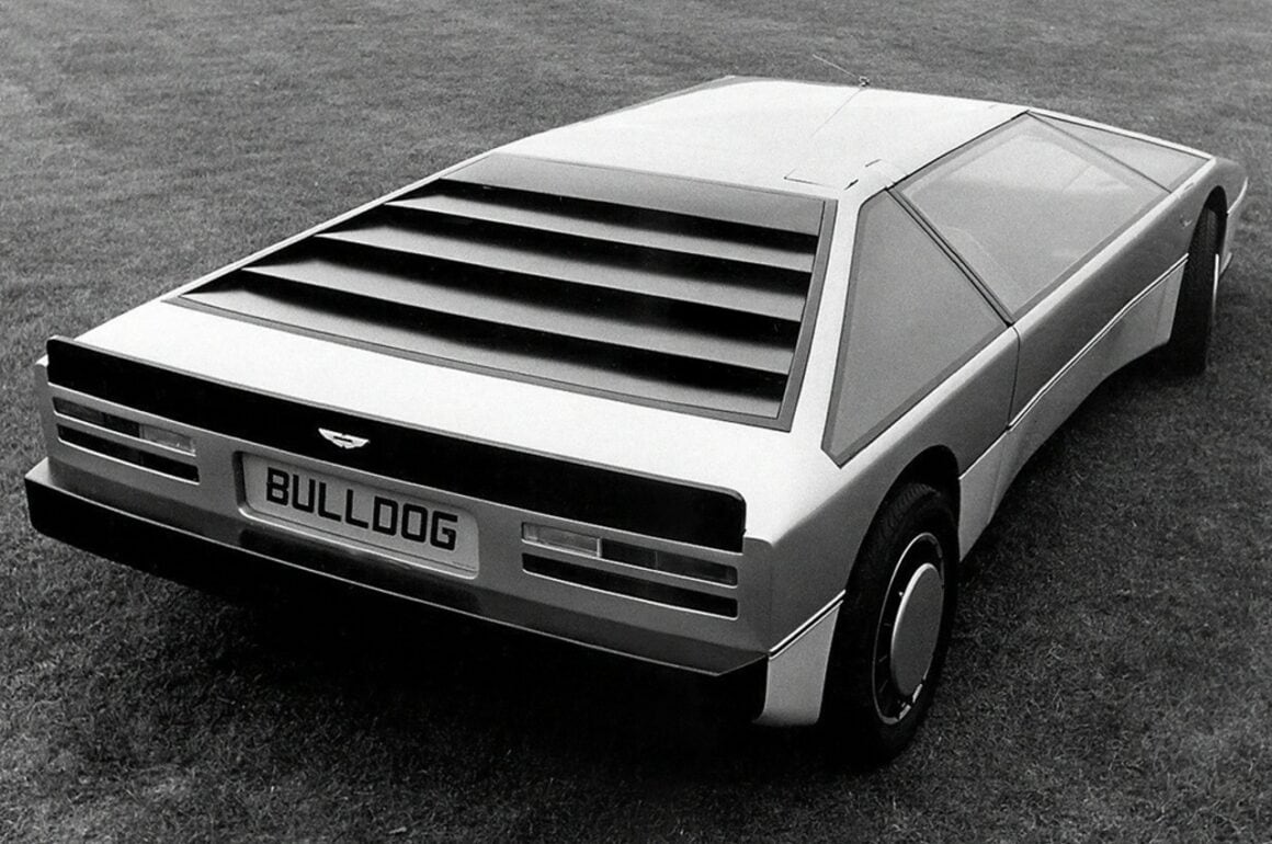 Une série limitée de 25 exemplaires est prévue. Malgré sa production au Royaume-Uni, son volant est installé à gauche car visant le marché américain. De forme trapézoïdale, basse (1,09 m), large (1,92 m) et de longueur réduite (4,27 m), la Bulldog est équipée de portes papillons commandées électriquement via un pupitre accessible de l’extérieur après ouverture d’une mini-trappe affleurante. L’habitacle dévoile des formes elles-aussi très anguleuses. Certains détails étonnent, comme la rampe de feux escamotable, ou les jantes lisses issus de prétendues études aérodynamiques (sic ! La “filousophie” Aston Martin en quelque sorte !). La Bulldog est également équipée d’un couple caméra-écran de télévision pour la vue arrière, à la place d’un rétroviseur.. La totale pour l’époque !
