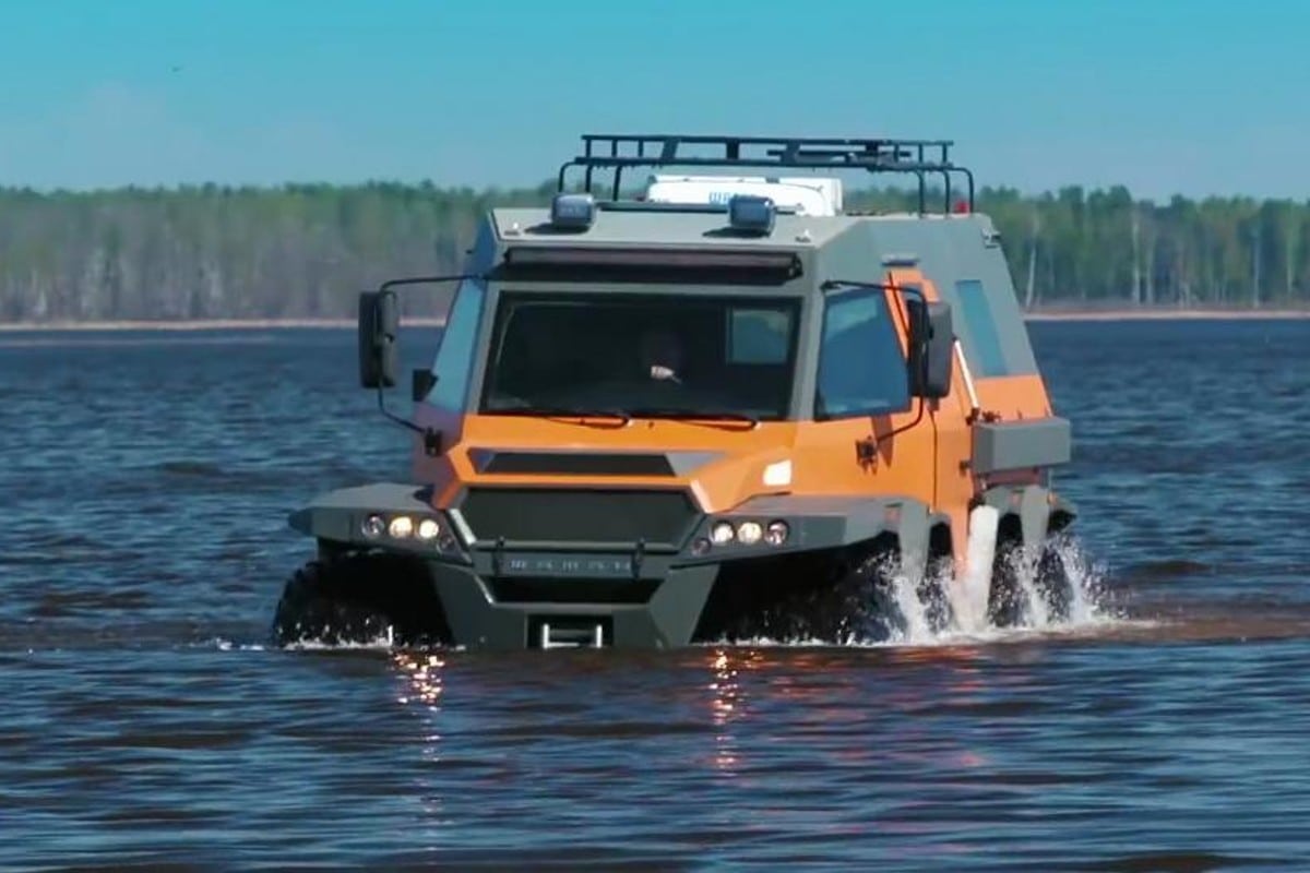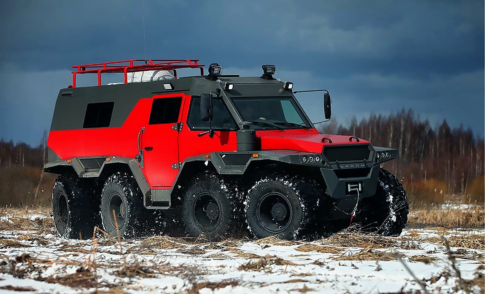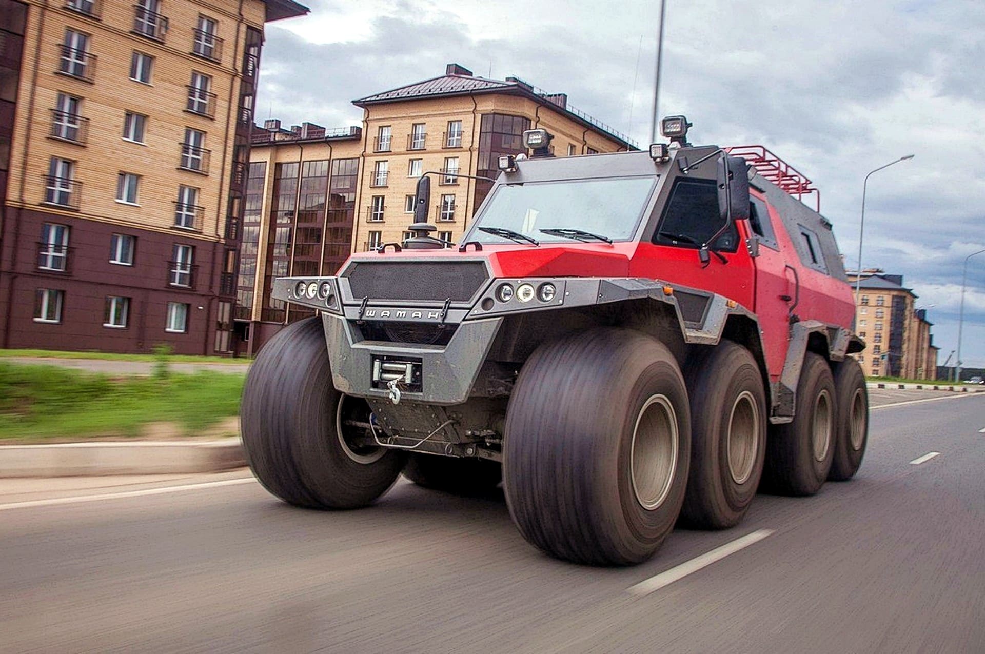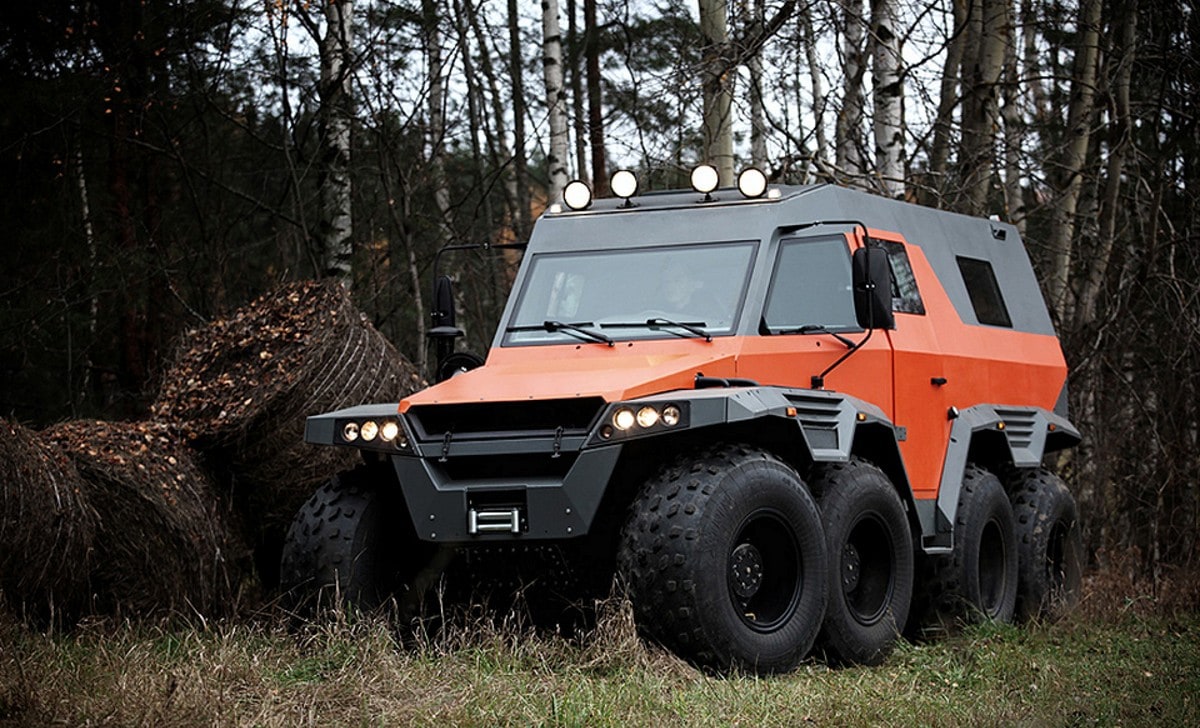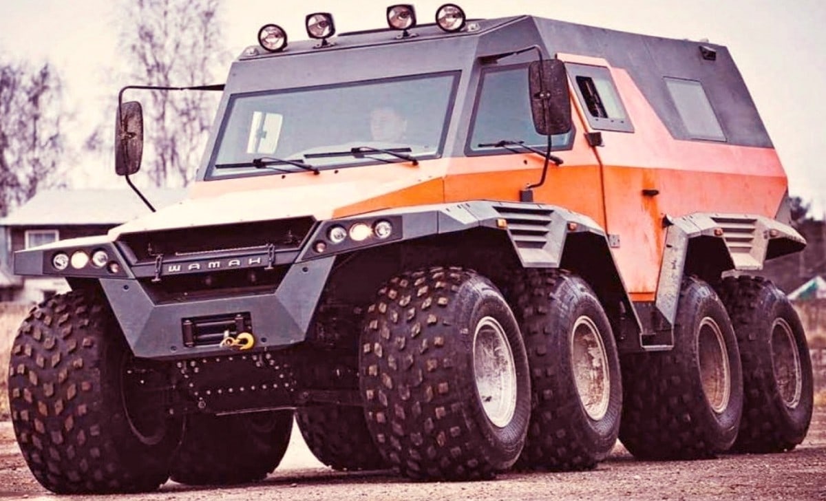 Il y a les véhicules tout-terrain et puis il y a “LE” super-extra véhicule tout-terrain AVTOROS WAMAH (Shaman) 8×8 ! Le “plusXplus” des tout-terrains. Avec 6 mètres de long, 3 mètres de haut et 2,5 mètres de large, cette bête de presque 5 tonnes (4.800 kg) peut s’attaquer à n’importe qui et quoi sur n’importe quel terrain : du sable, des rocailles, de la terre, de la boue, de la neige et jusqu’à flotter sur l’eau. De quel moteur ce monstre est-il équipé ? Un V8 7litres de 900cv, un V1O où un V12 de 1200cv, un W16 de 1600cv ? Non, ce véhicule est propulsé par un turbo-diesel Iveco F1C de 3,0 litres qui ne pompe (malheureusement) “que” 176 minables mais vaillants chevaux, via une boîte de vitesses manuelle à 6 vitesses !