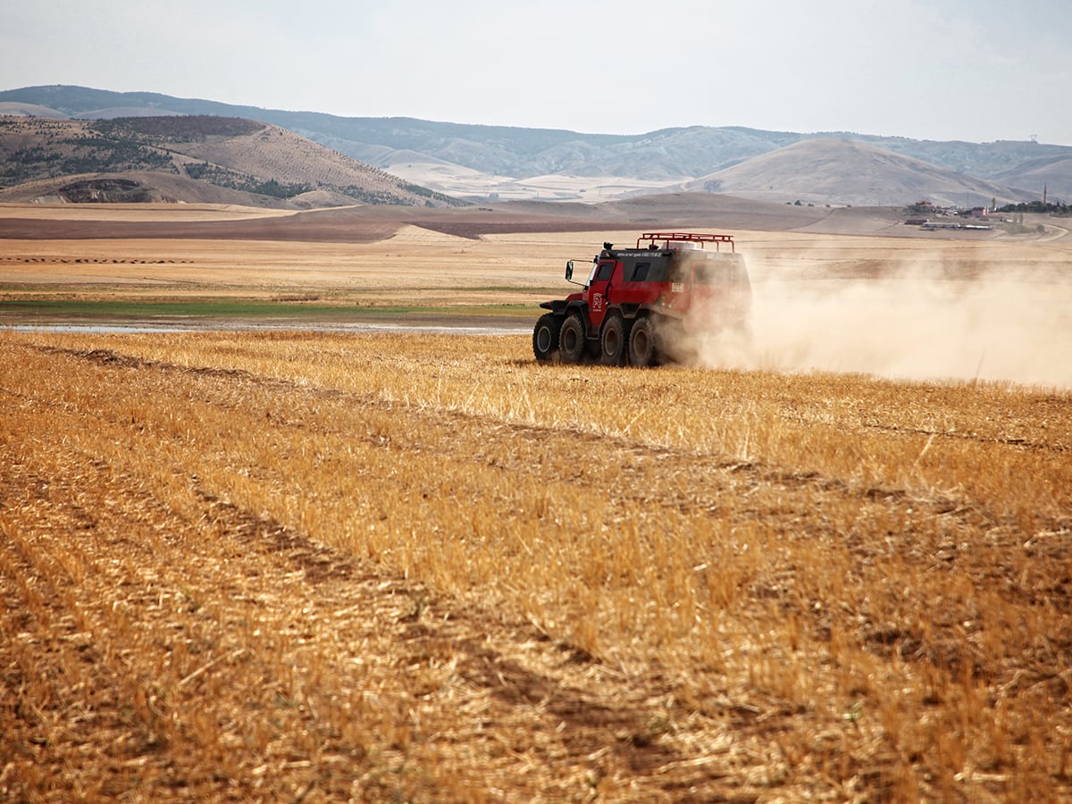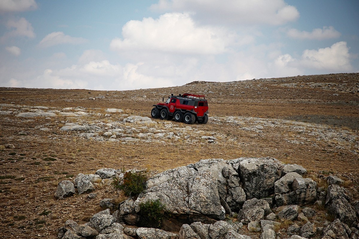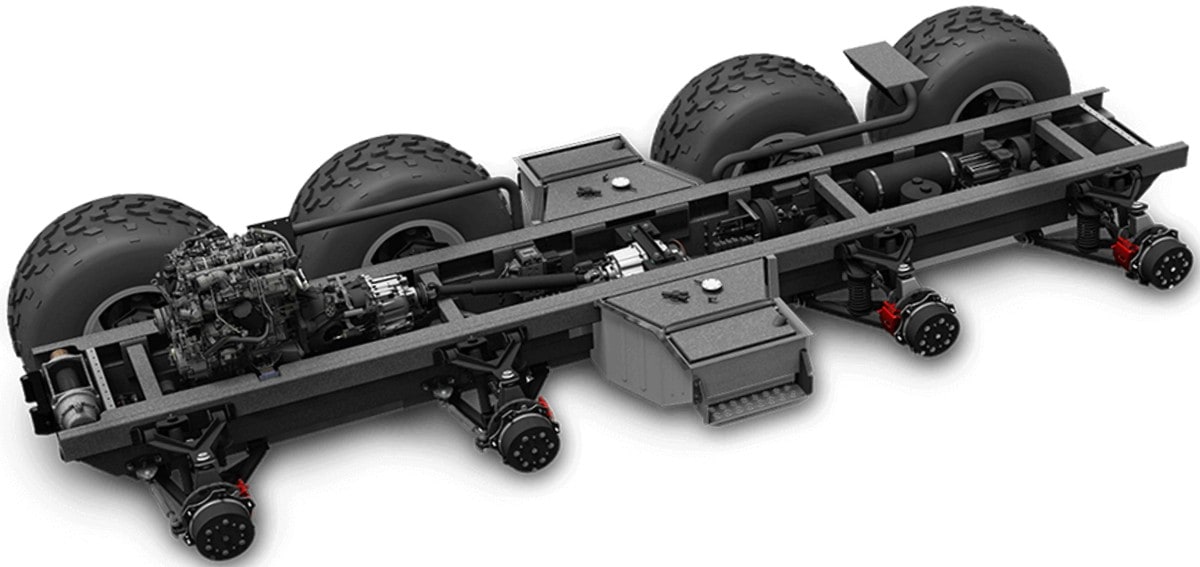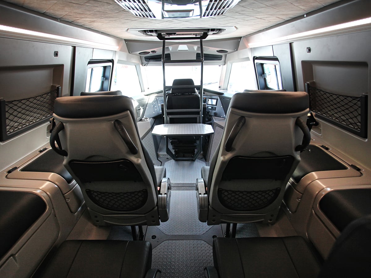 -“Absolument ! Il a également une configuration unique avec un centre de gravité extrêmement bas, permettant à cette machine hyper robuste de 4.800 kg, de conquérir les pentes de front à 45 degrés, ainsi que de maintenir l’adhérence tout en conduisant sur un angle de 47 degrés. L’AVTOROS, avec son moteur turbo diesel Iveco F1C de 176 HP fiable et solide en arrive toutefois à ne consommer que 25 litres aux 100 km (environ 1 l par 60 miles), d’où un réservoir de carburant “super massif” engloutissant 260 litres d’essence, assez pour parcourir plus de 1000 km (ou 600 miles).