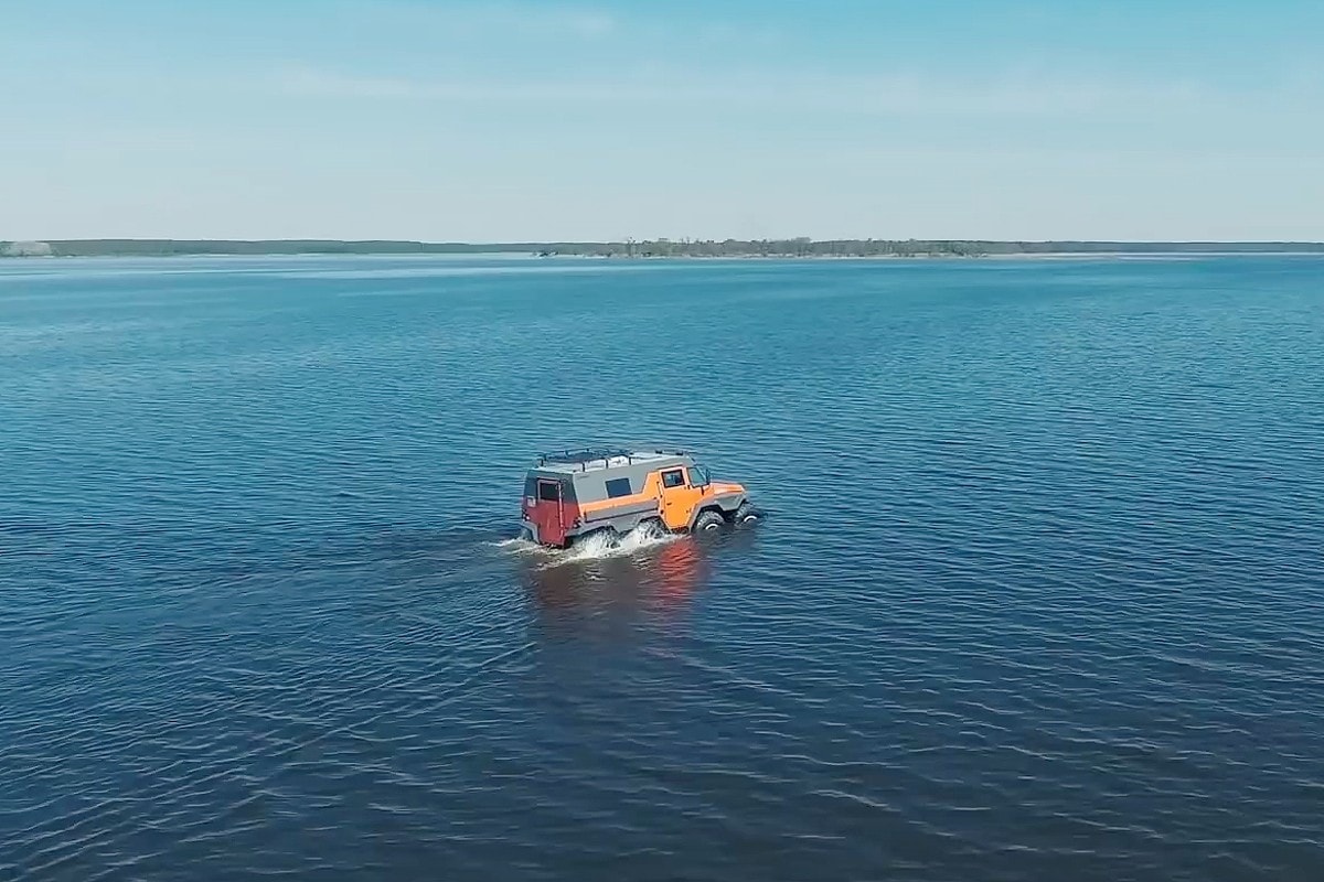 -“L’AVTOROS WAMAH ne se limite pas à la terre, il peut flotter sur l’eau, et est capable d’y foncer à 25km/h ! Une système “hors-bord” avec une hélice peut être ajouté en une minute pour mieux valoriser ce véhicule devenu un char aquatique rapide d’intervention, vraiment tout-terrain ! A l’intérieur il y a assez d’espace pour accueillir jusqu’à 10 passagers avec leur équipement (où bagages)”…