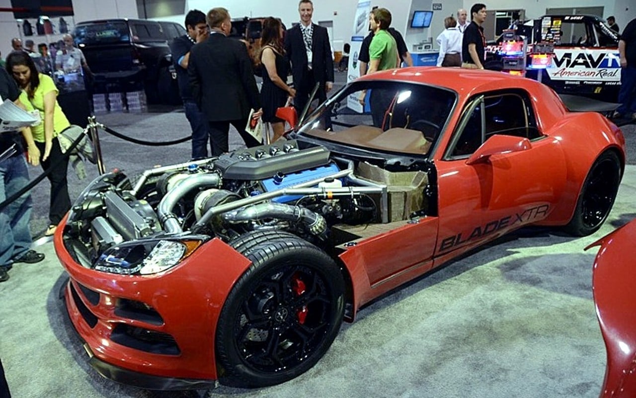 La Bailey Blade XTR ressortait toutefois passablement du lot…, les plus connaisseurs en bétises roulantes se souvenant qu’elle avait déjà été présentée en 2010 dans des conditions similaires…, mais reconnaissant que sa finition était en évolution…, le quelconque de certains panneaux de carrosserie laissant toutefois les visiteurs dubitatifs, certains affirmant ouvertement qu’une Dodge Viper bien plus sécurisante à tous égards (technologie éprouvée, mécanique V10, construction usine, châssis aluminium, finition correcte et fiabilité via un réseau)… se négociait 20 fois moins cher en occasion de première main…