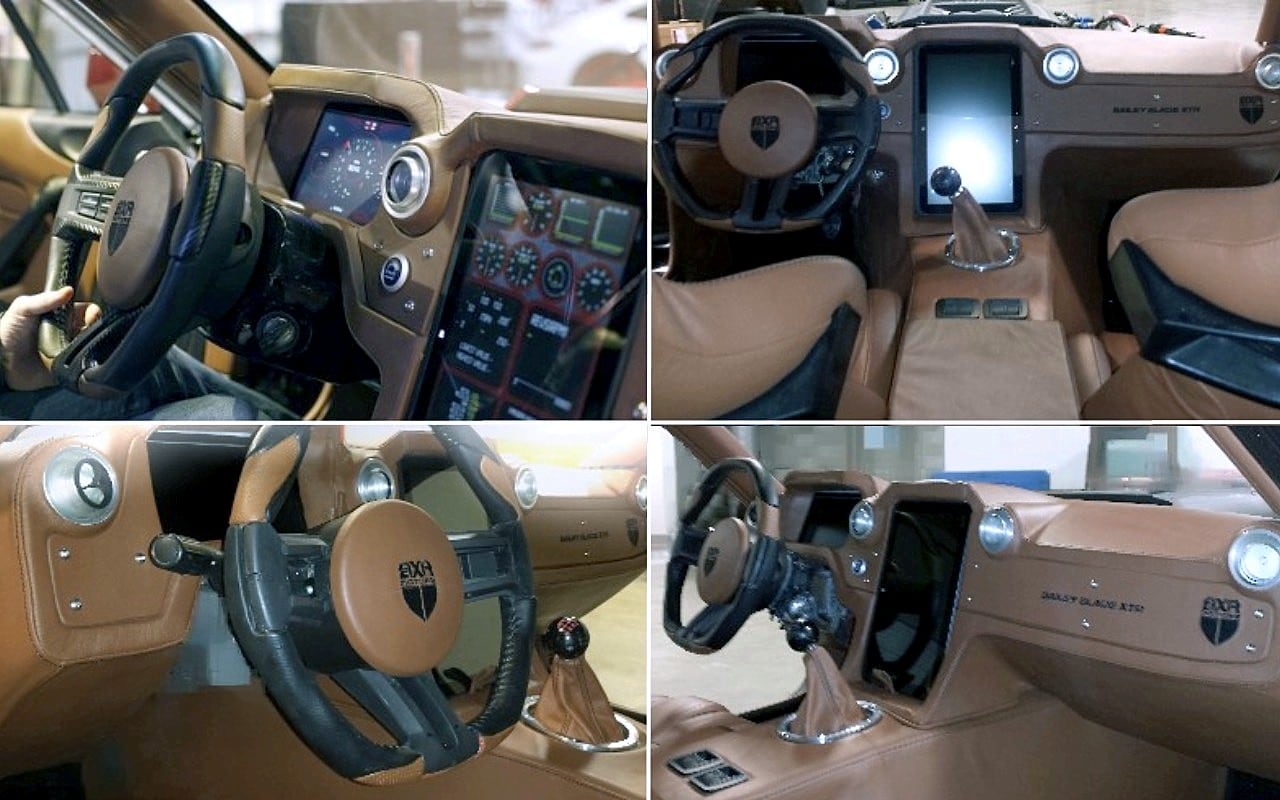 Malheureusement, comme il m’a été possible de m’asseoir derrière le volant de cette machine, je n’ai pu que constater l’invraisemblable position de conduite, simiesque pire encore que dans une Lamborghini Miura (jambes largement écartées, pieds décalés, torse en position semi horizontale à 45° avec la tête inclinée latéralement sous le même angle, bras tendus et coude gauche écrasé contre la porte)…, le design de l’habitacle demeurait assez simpliste d’inspiration Bricklin…, toutefois, les amoureux de grands écrans vidéos devaient être heureux d’apprendre que la console centrale était munie d’un écran tactile de 13 pouces de hauteur !