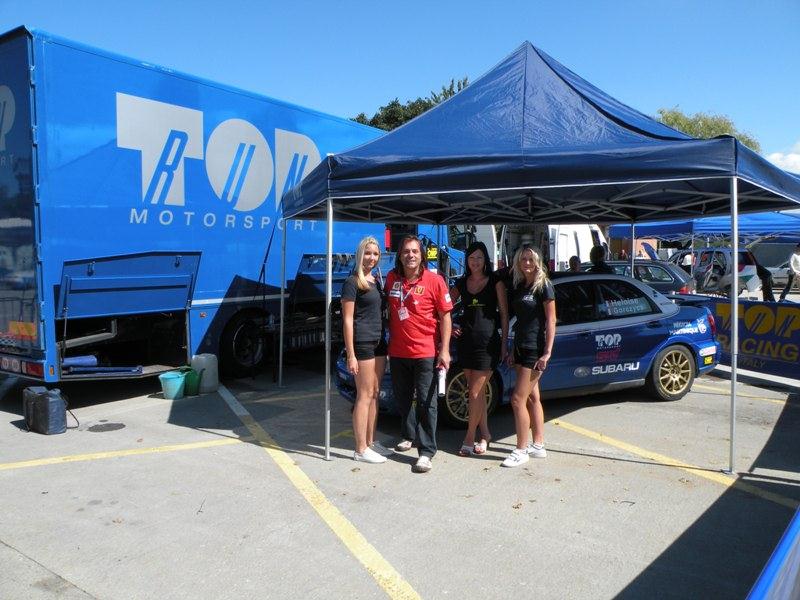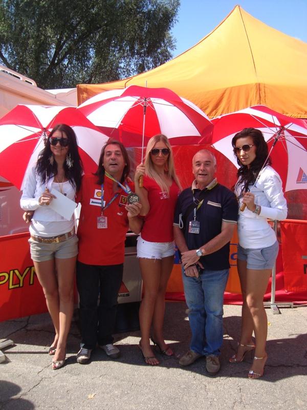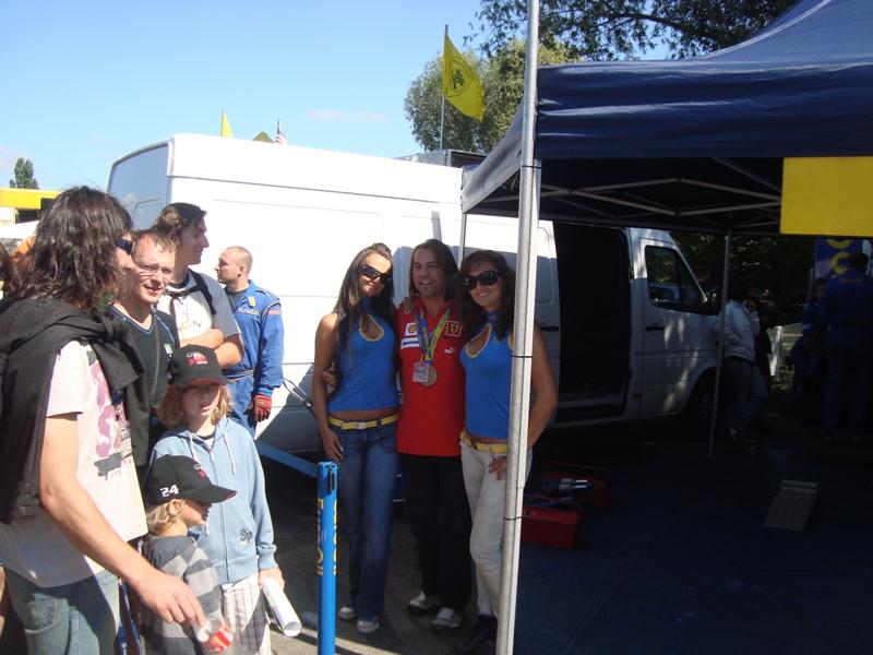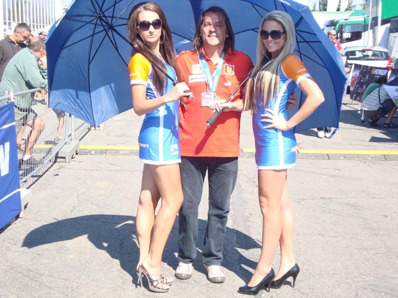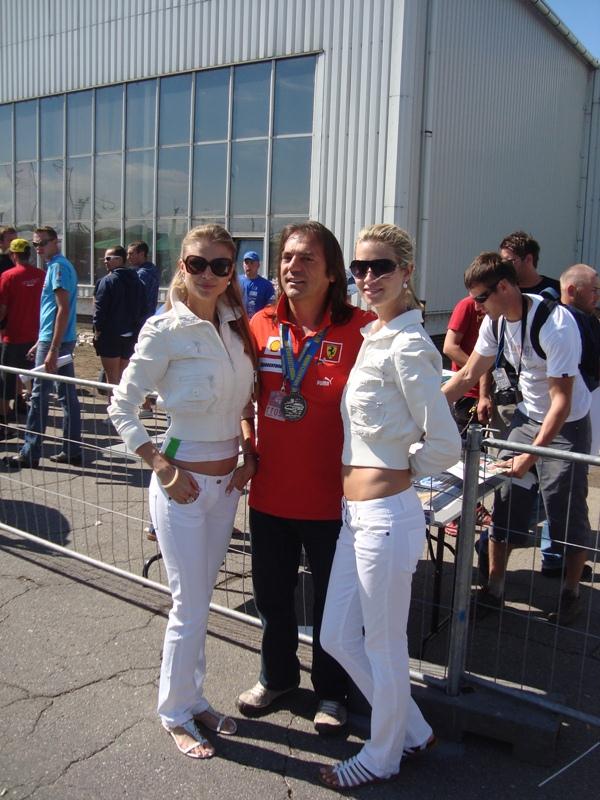 Antonio, mon co-équipier (en rouge) et moi (en bleu), entourés d’une escouade de jolies hotesses…
