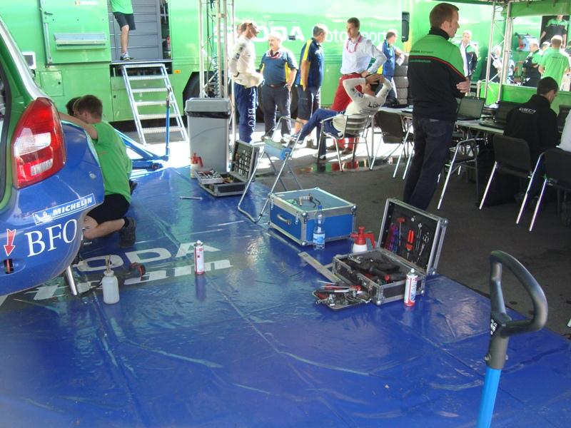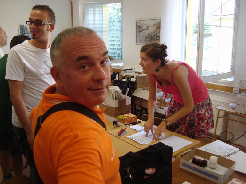 Après la technique, nous devons nous présenter à la vérification avant la course, munis de notre licence de pilote (nous avons la licence internationale… et prioritaire SVP !), le contrôle technique de la voiture, et l’homologation de la cage de protection, de l’extincteur, du réservoir de sécurité, des casques, ceintures, etc.