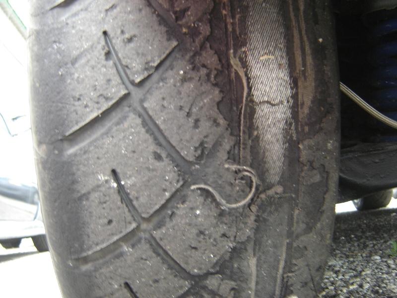 Après, vous pouvez voir la photo des mes pneus arrière après 80 Km d’épreuves de vitesse. J’ai employé 2 pneus avant et 4 pneus arrière pour faire les 140 Km de l’épreuve de vitesse (Total du rallye : 280 km).