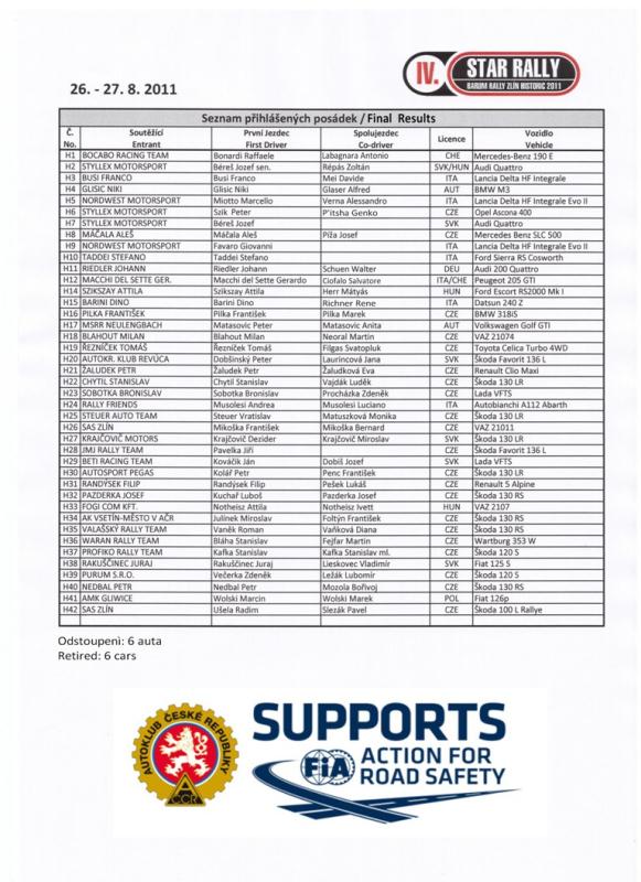 Le classement show du public avec vote SMS est allé à l’Audi de Beres (SVK)…, le jury a élu la Lancia Delta Martini de l’italien Miotto comme étant la voiture la plus représentative du Barum Rally 2011…