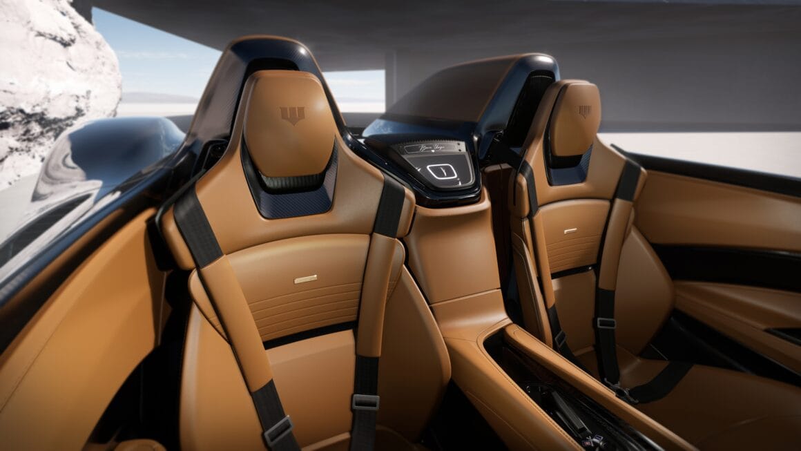 Il faut en effet réserver un pourcentage à Rimac pour sa participation électrique et l’usage de la base roulante… Des logos “Wayne Enterprises” apparaissent sur les jupes latérales et la porte conducteur est ornéee de la célèbre citation des bandes dessinées originales de Bruce Wayne : “Tous les hommes ont des limites… J’ignore les miennes”… En ce cas les limites sont l’importance de la fortune des acquéreurs… L’extérieur aérodynamique présente également des dômes en cuir beige avec un logo “WayneEnterprise” unique en relief. Des roues Prezioso Evoluzione en alliage sur mesure équipées de freins Brembo en carbone-céramique de 390 mm. Les sièges sont en cuir sur mesure et les finitions sont en aluminium brossé anodisé noir et or.