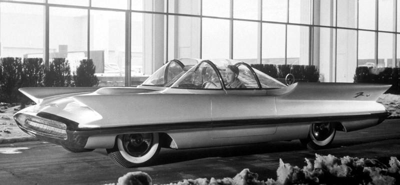 Imaginé en 1954 par William Schmidt designer chez Ford, la Futura sera construite par Ghia qui était à l’époque autre chose qu’un terme définissant une finition pour la gamme Ford… Le carrossier italien rendait sa copie à temps pour une exposition en Janvier 1955 à Chicago. La période que l’on pourrait définir comme “futuriste-naïve” présentait nombre de concepts plus proches du délire cartoonesque que de la réelle prospective. La Lincoln Futura, ses ailerons, sa verrière double et sa bouche béante n’a d’ailleurs pas vraiment convaincu les amateurs d’automobiles, amusés des outrances de l’auto.