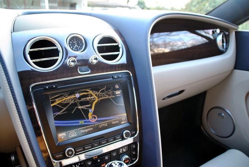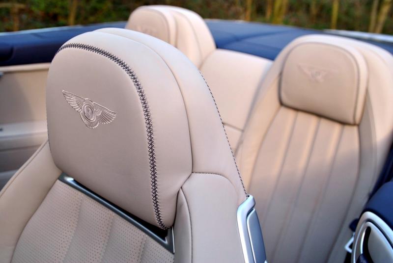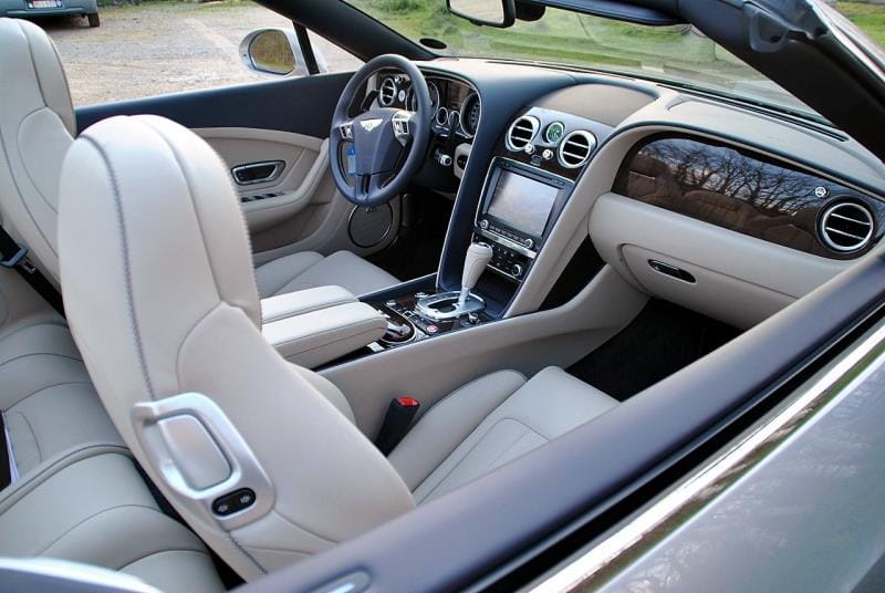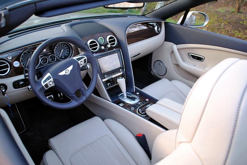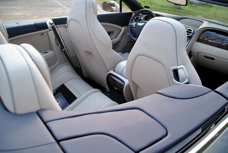 Particulièrement imposante alors qu’elle ne mesure que 4,80 m de long mais plus de 2 m de large avec les rétros, cette GTC est un véritable salon roulant bien dans la tradition “british”…, un ravissement pour les yeux mais également au toucher, pas de fausse note, ici, on frôle une certaine perfection : cuir bi-tons, peausseries soyeuses, surpiqures exécutées au cordeau, graphisme revu, du vrai bois qui épouse à merveille les aérateurs taillés dans l’aluminium (toujours commandés par des tirettes), sièges avant ultraconfortables (matelassés), soutenant admirablement le corps (ils peuvent aussi masser et réchauffer la nuque)…, rien que du bonheur…