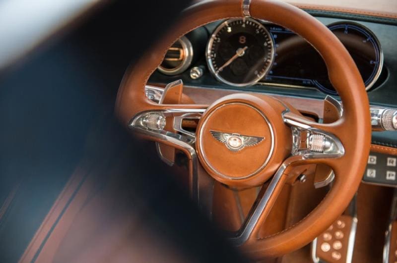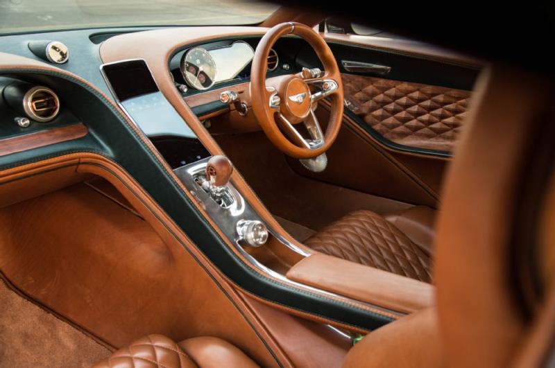 L’étude EXP10 Speed 6 fixe un cap et constitue une feuille de route pour les futures Bentley, tant en termes de design que de traitement de l’intérieur…, le style de l’habitacle marie luxe et sportivité…, peu de bois, ce qui serait incongru sur une voiture de grand tourisme moderne, mais juste du cerisier sculpté en 3D pour capitonner les portes et beaucoup de cuir provenant de Poltrona Frau, associé à de l’aluminium pour la console centrale surélevée et étroite qui évoque celle de la McLaren et accueille le levier de vitesse ainsi que l’écran d’informations et de navigation par GPS.
